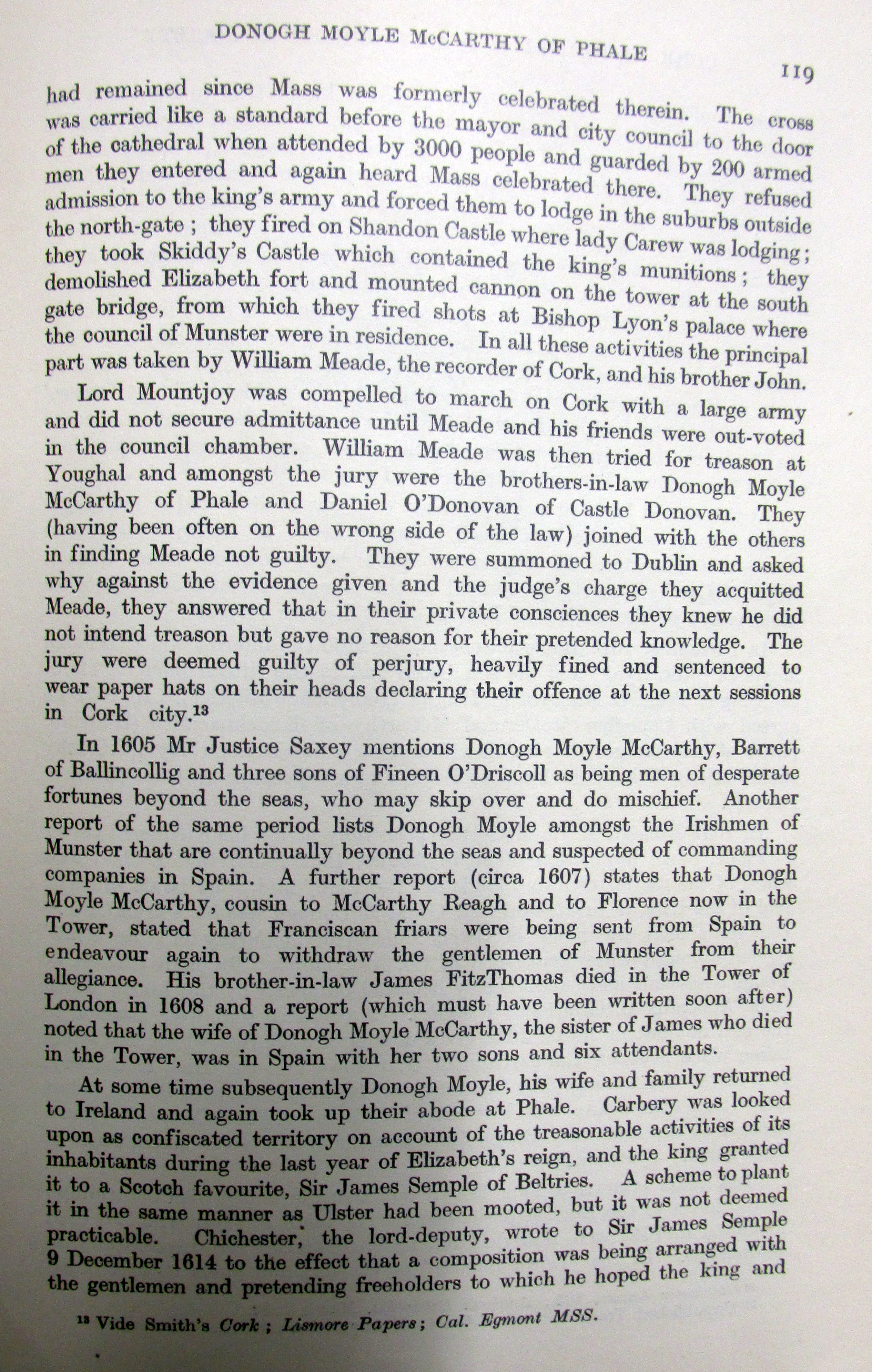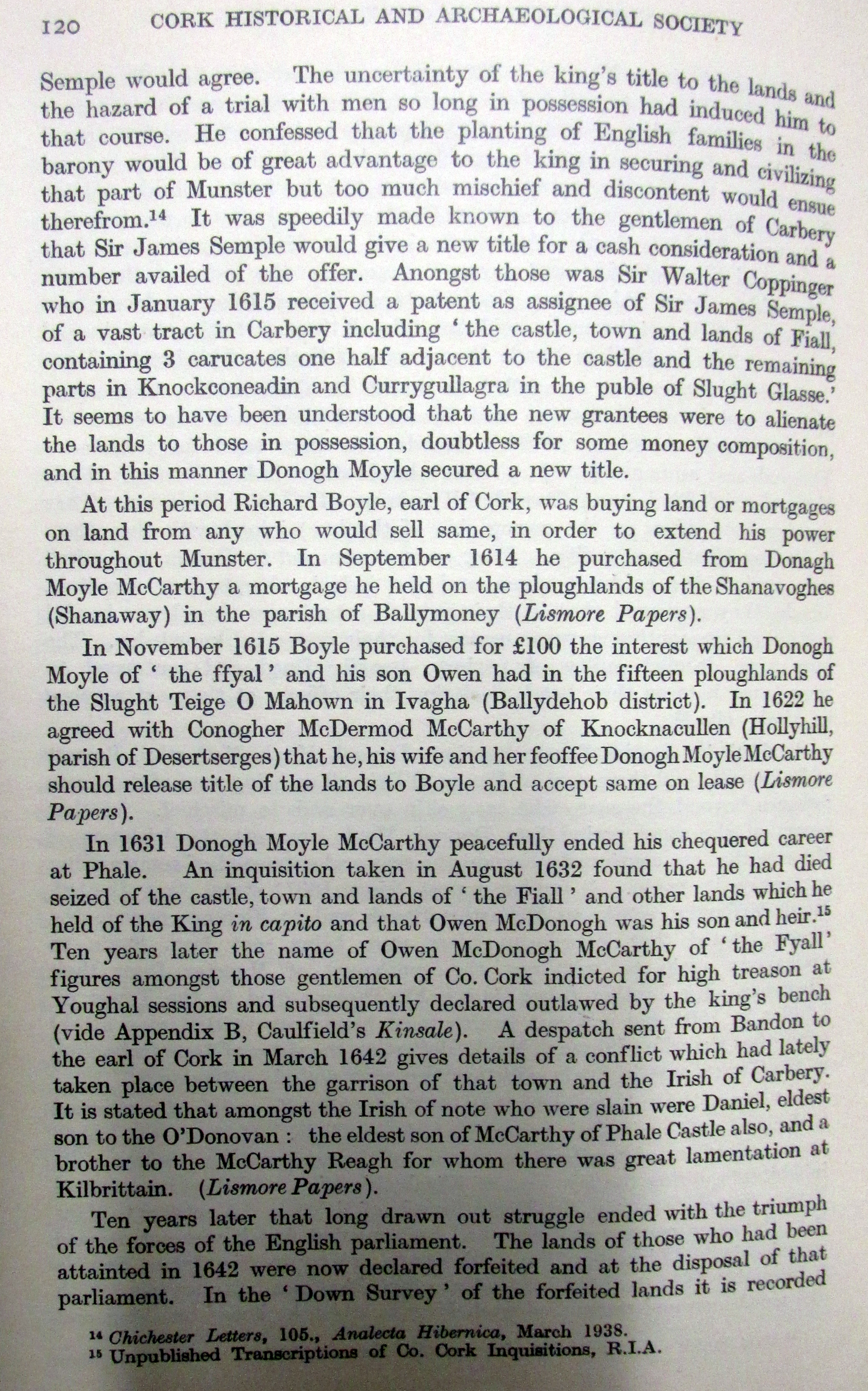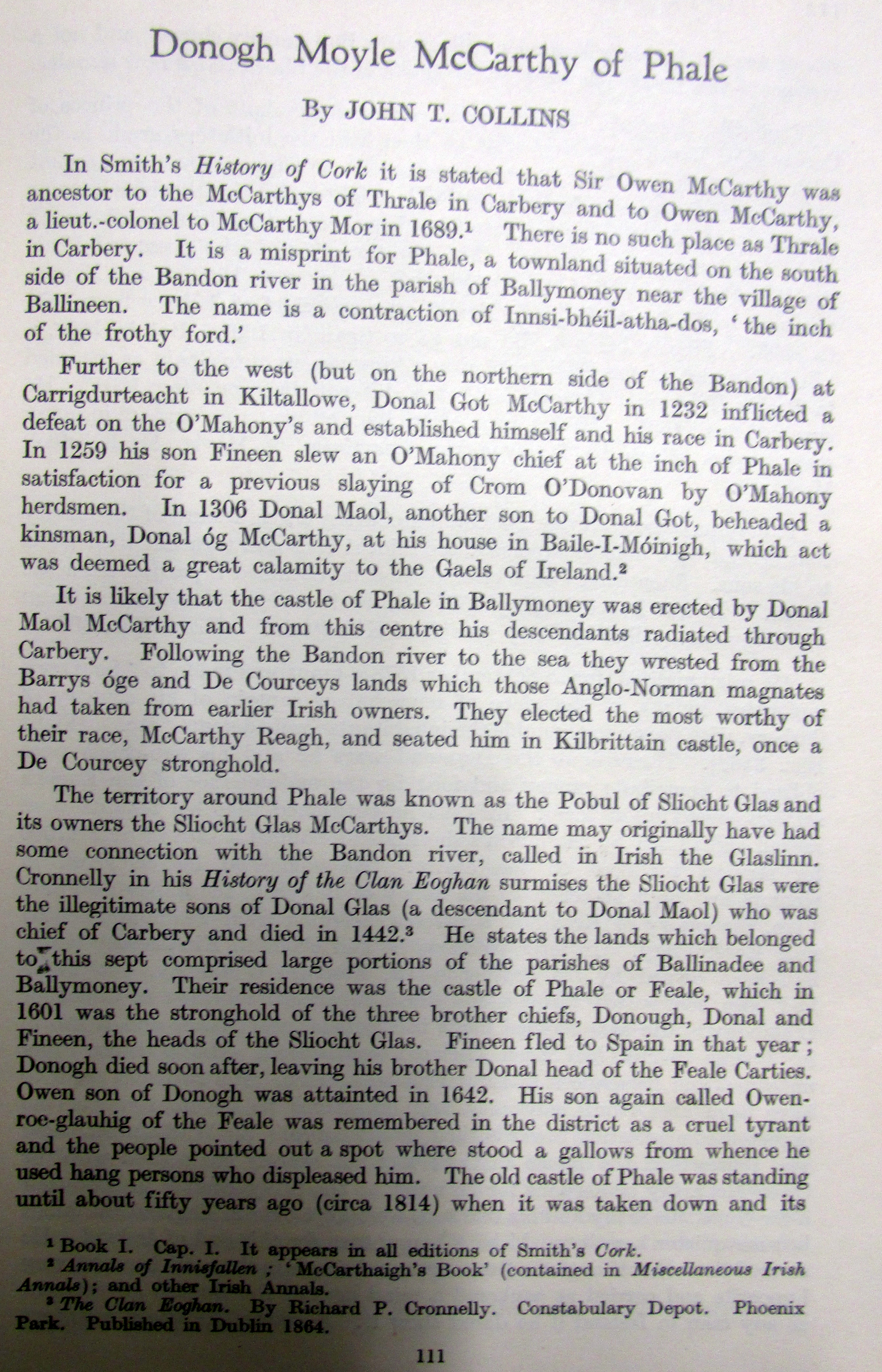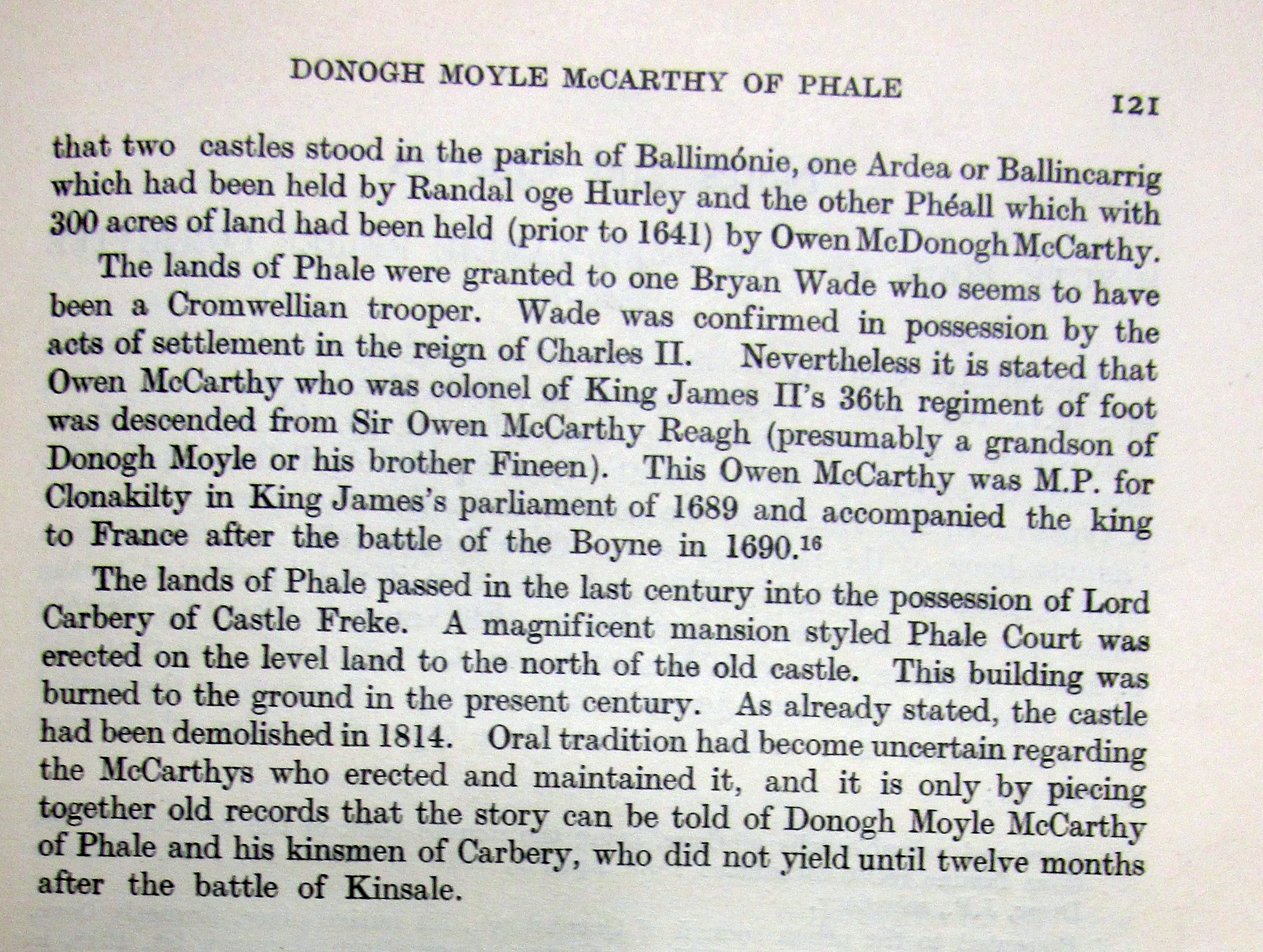 The coming of the McCarthys to Carbery, 1232 AD, Donogh Moyle (Leas-Ainm; Nickname) McCarthy, Phale, (Ballineen), Co. Cork Died 1630s Two Sons in Oxford. The lands referred to came into the possession of the Evans-Freke family (Lord Carbery).