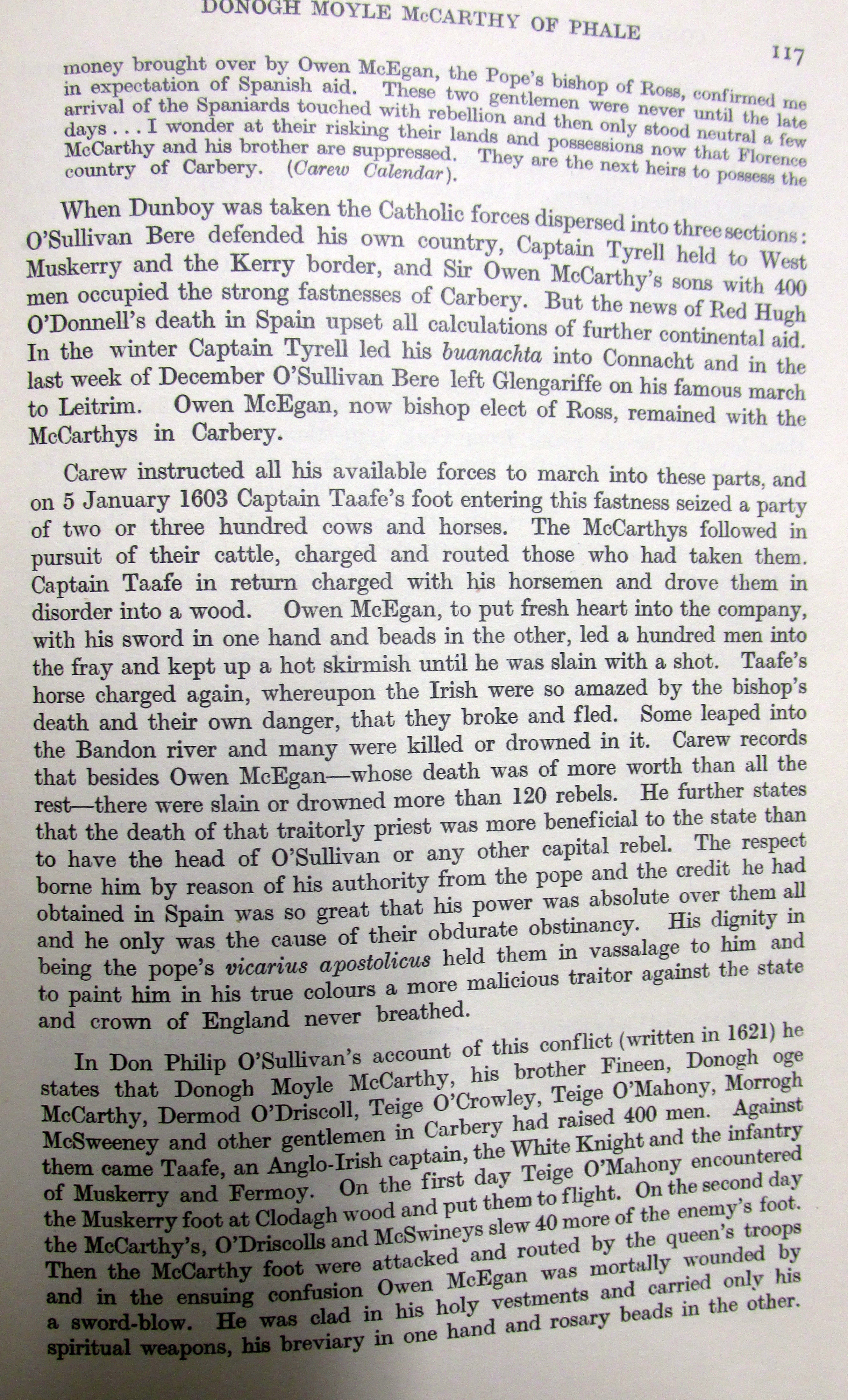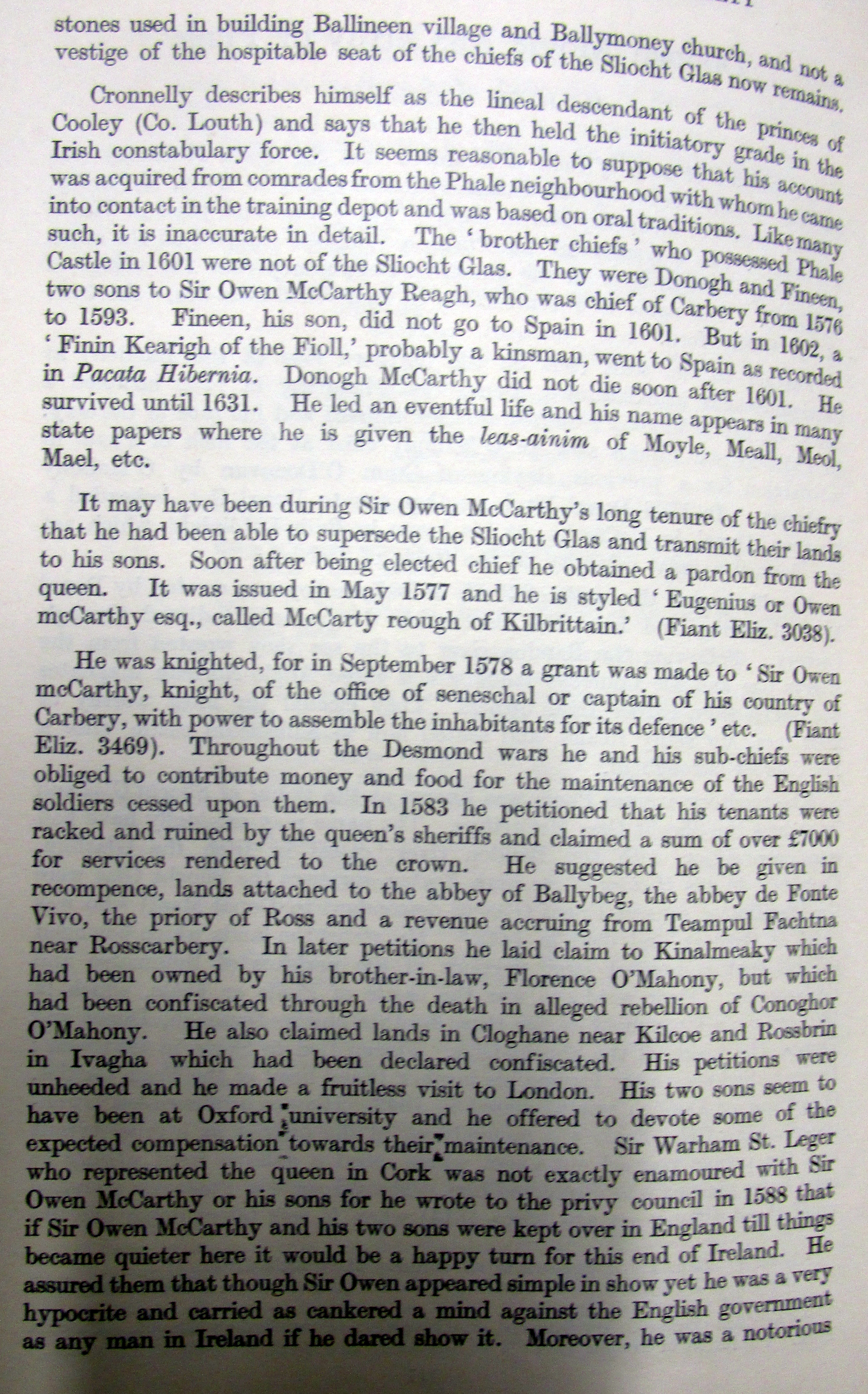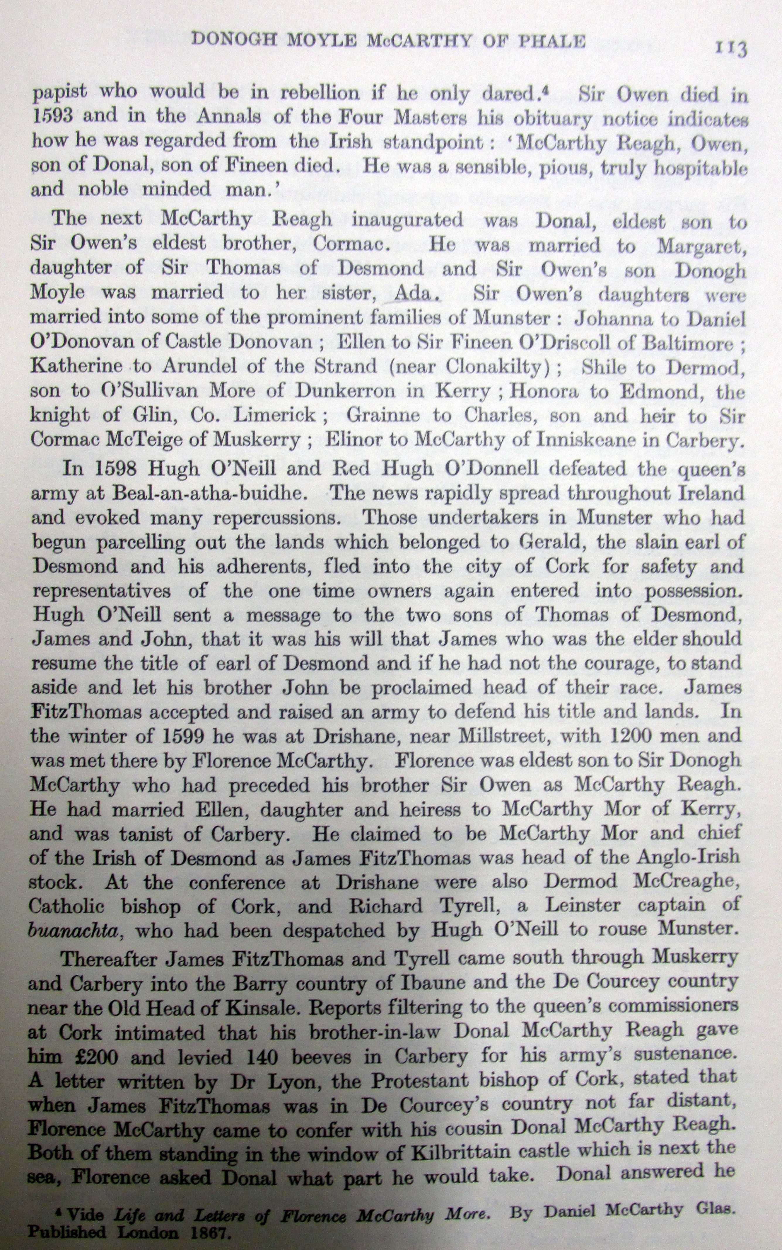 The coming of the McCarthys to Carbery, 1232 AD, Donogh Moyle (Leas-Ainm; Nickname) McCarthy, Phale, (Ballineen), Co. Cork Died 1630s Two Sons in Oxford. The lands referred to came into the possession of the Evans-Freke family (Lord Carbery).
