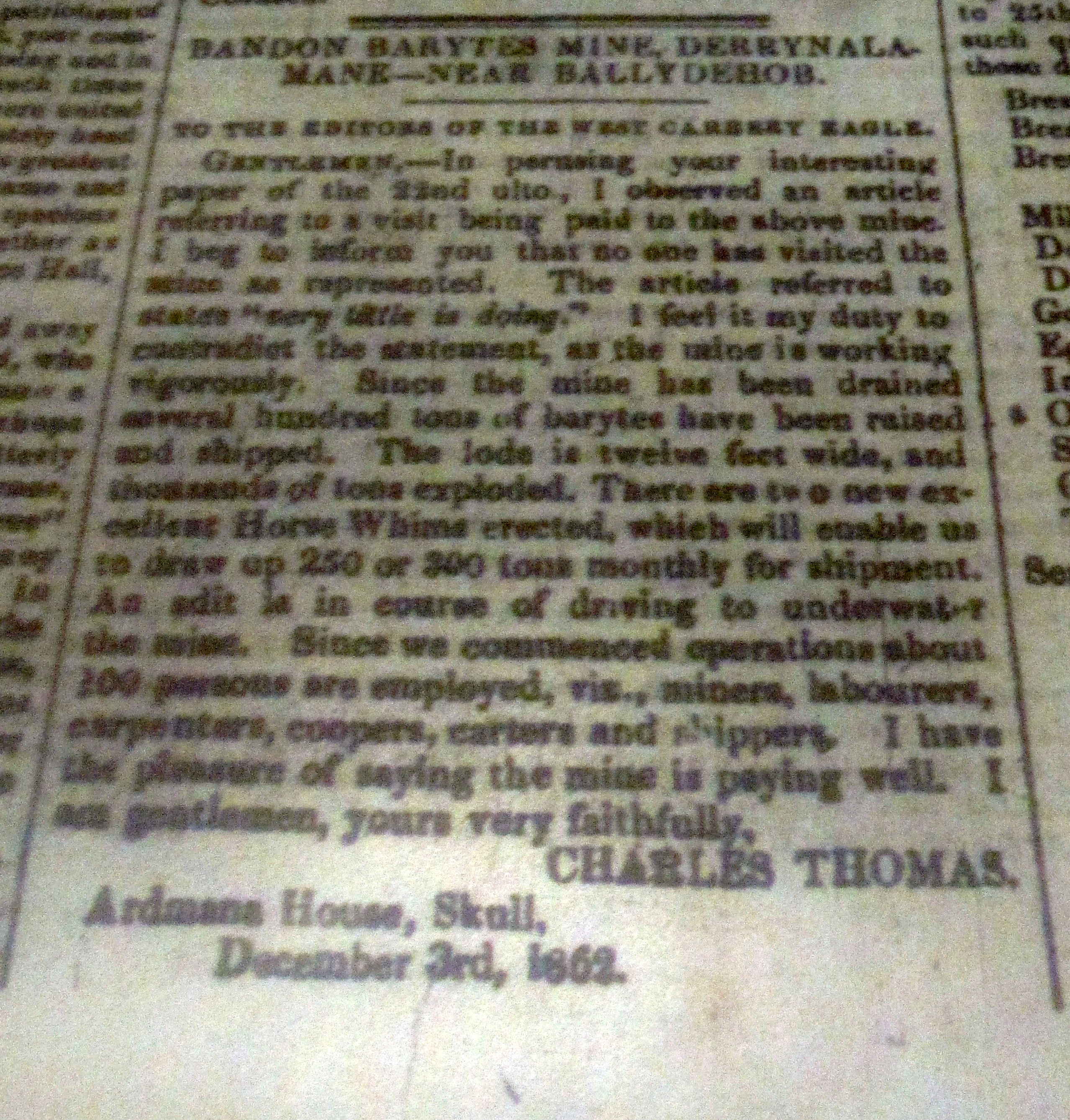 Barytes Mines Derreenlomane, (Doirín na Lomán: Little Oakwood), Ballydehob, West Cork,  Letter 3rd December 1862 from Charles Thomas, Ardmana House, Schull, West Cork, Manager, confirming mine operational and profitable employing 100 men.