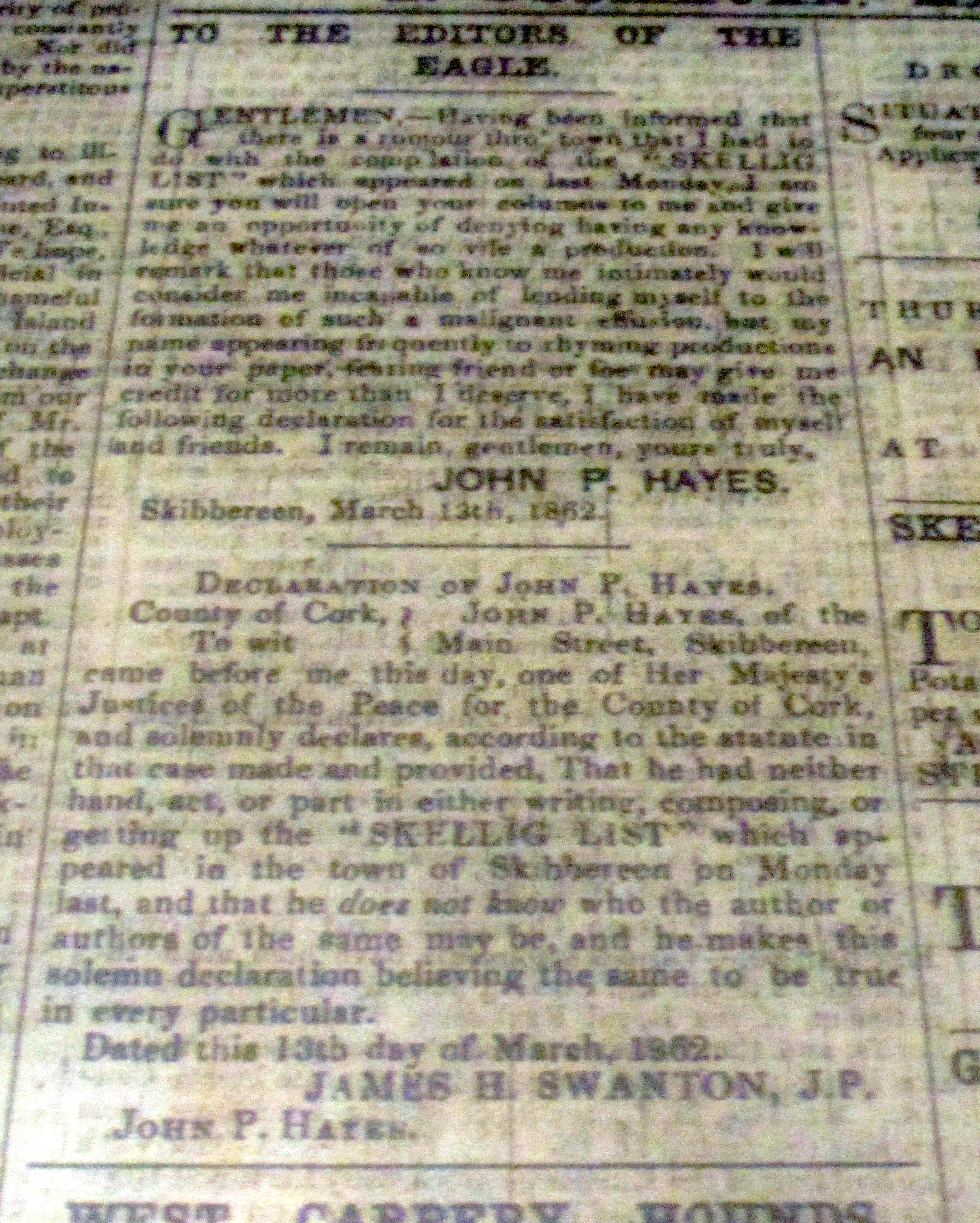 Denial March 1862 by John P Hayes, that he compiled ‘Skellig List’, circulating in Skibbereen accompanied by Statutory Declaration.