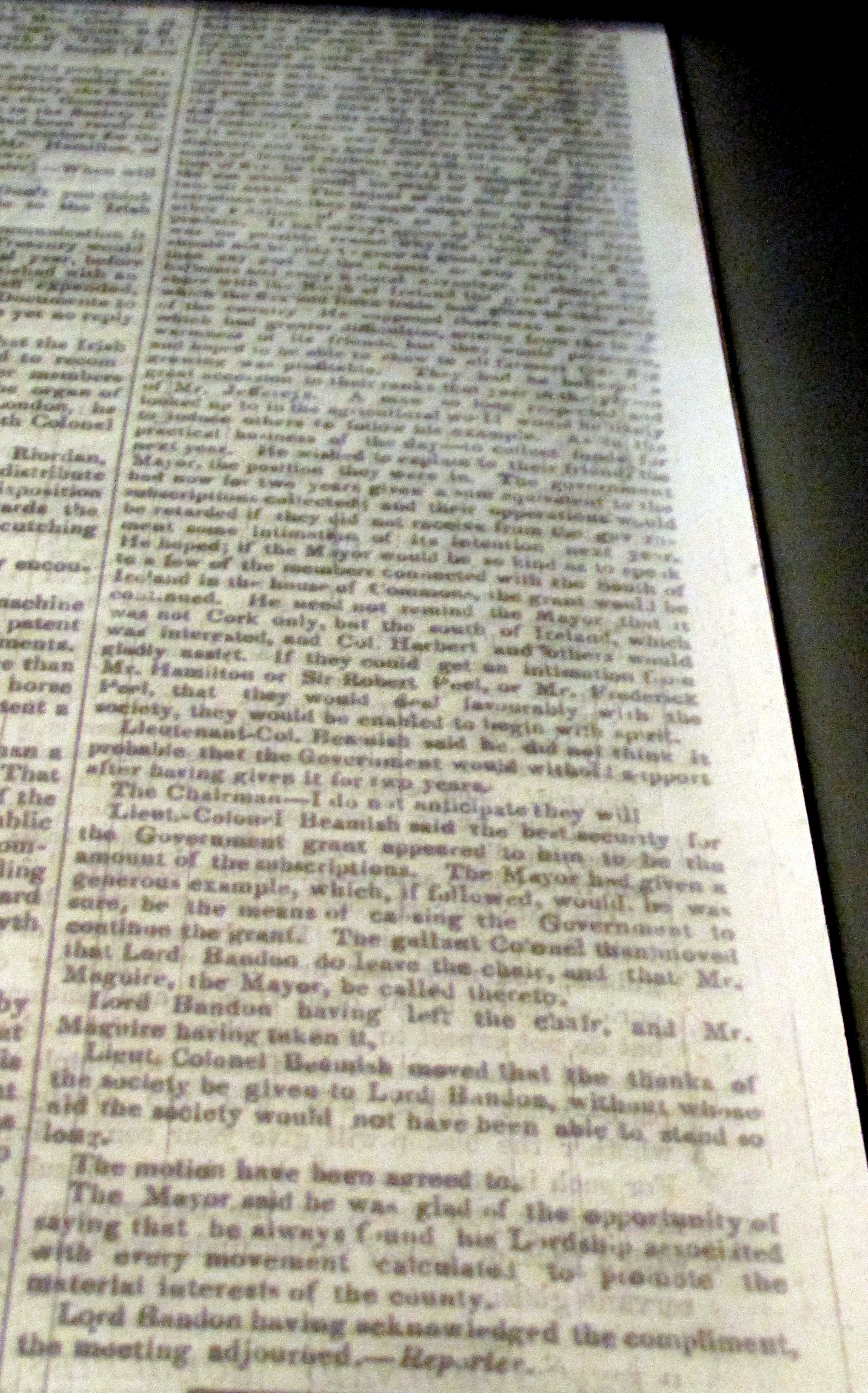 March 1862, Meeting Flax Society, Colonel Bernard (Bandon), Colonel Beamish, Captain Sealy RN, JF Maguire, Mayor of Cork, Messrs W Thurley, D Cunningham, W Sheehy (Skibbereen), Edward Smyth (Knox Mills), W Dowman, Offer by Peter Riordan, Keilgane, Castleisland to buy Scutching Machine, Discussion of Rowen of Belfast new Scutching machine hint of past failures. proposed meeting with Sir Robert Peel ‘The Organ of the Irish Government’.