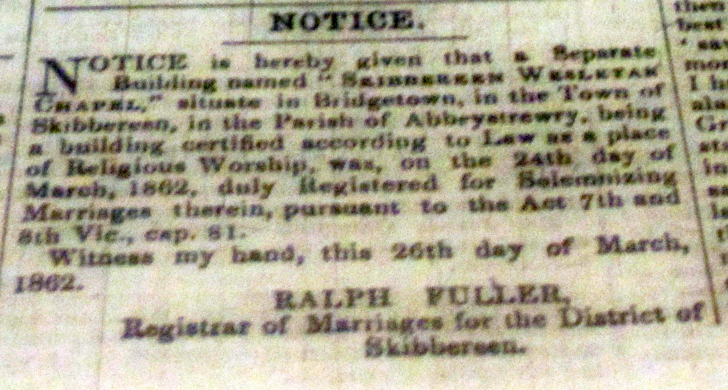 March 1863, Notification by Ralph Fuller, Registrar (and Solicitor) of the Methodist Chapel, Skibbereen as an approved place for the Solemnisation of Marriages, first Marraige James Craig, Trinity College Kate Woulfe, Ballydehob, 27th April 1862, and annual meeting of Methodist Missionary Society.