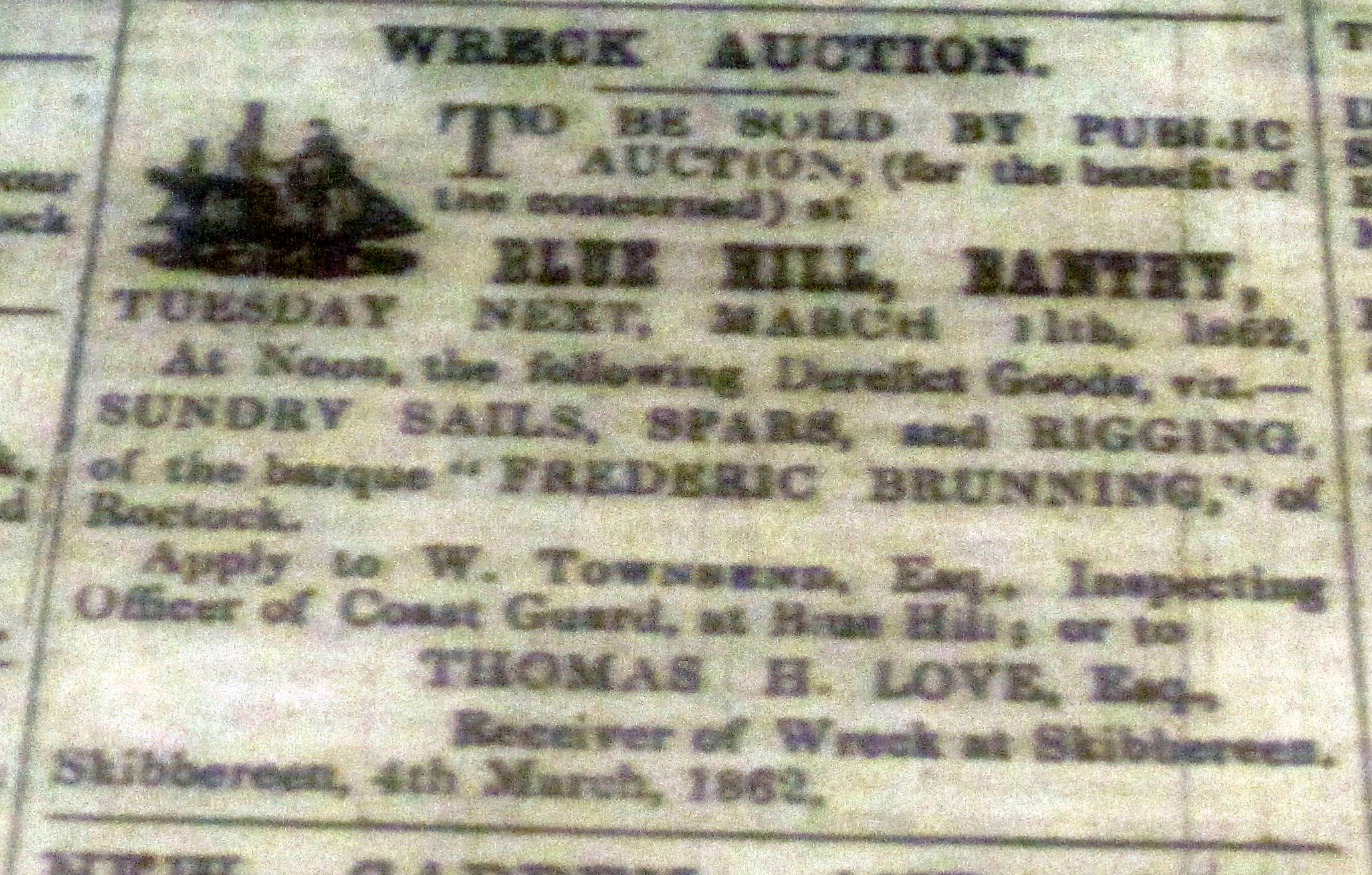 Sale at Blue Hill, Bantry, March 1862 of Wreck of ‘Frederich Brunning’ of Rostock, Sails, Rigging, Etc apply Thomas H Love, Receiver of Wrecks, Skibbereen.