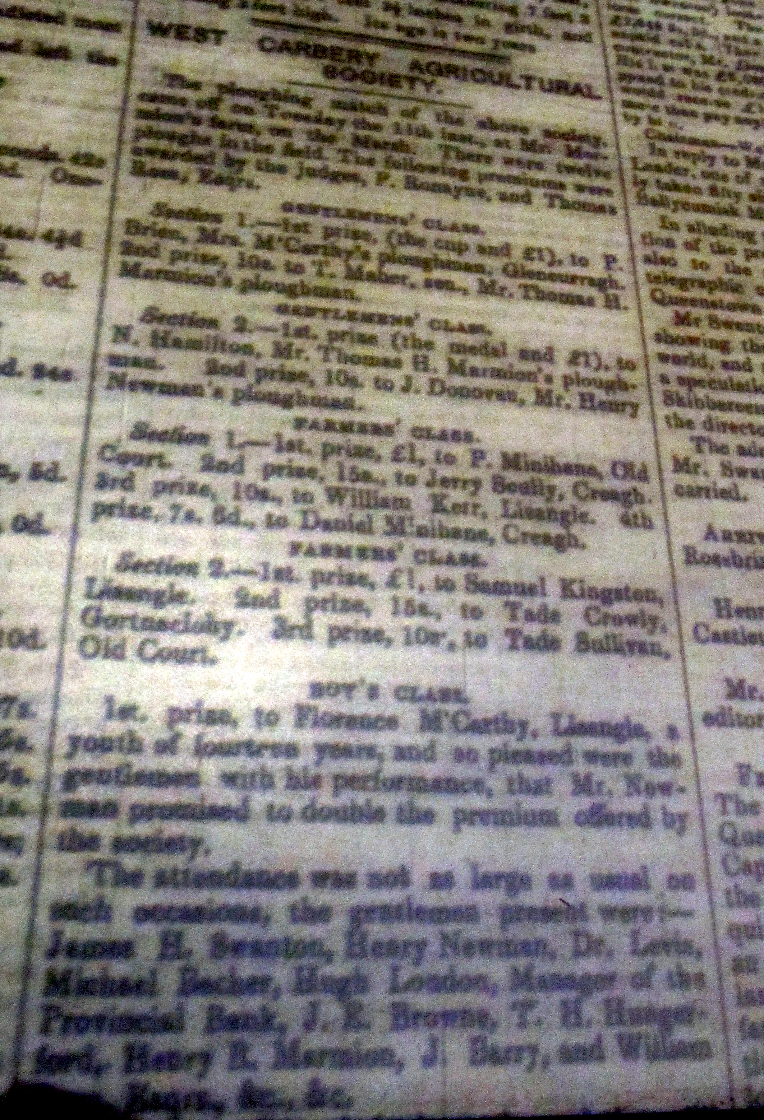 West Cork Agricultural Society in place since 1830 Poorly supported by Gentry and Farmers, Ploughing Prizes, Prizewinners Ploughmen for Estates and Boy’s Class, comments on Leases and Prizes for August 1862. Poor Agricultural Productivity feature of Land Tenure.