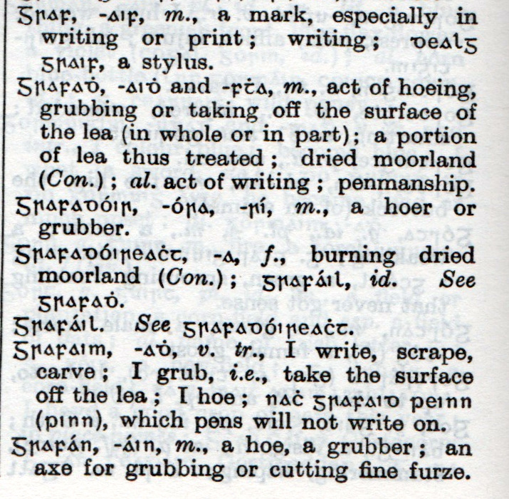 The Grufán is a tool used in famine times to grub out plots from sods where a spade would not be suitable. It is still used to batted down clods after ploughing.