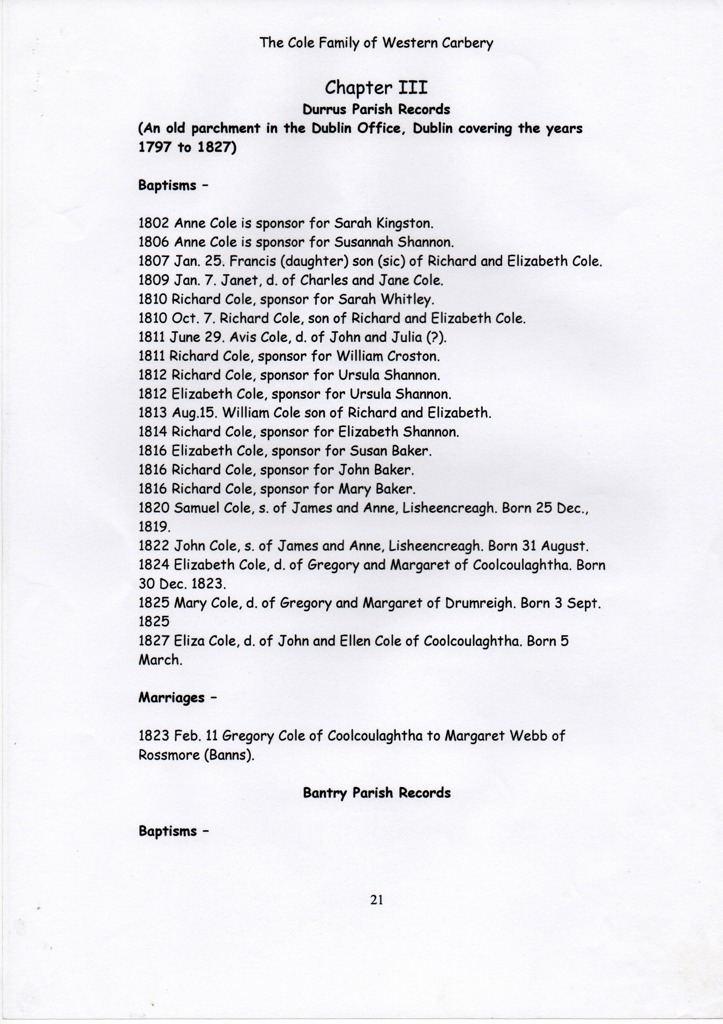 Extract from the Records of St. James, Durrus, West Cork, 1797 to 1827, from an Old Parchment in the Dublin Office, copied before their Destruction at the Public Records Office, Dublin, 1922, names mentioned Kingston, Shannon, Whitley, Croston, Baker, Webb, from Cole Family History.