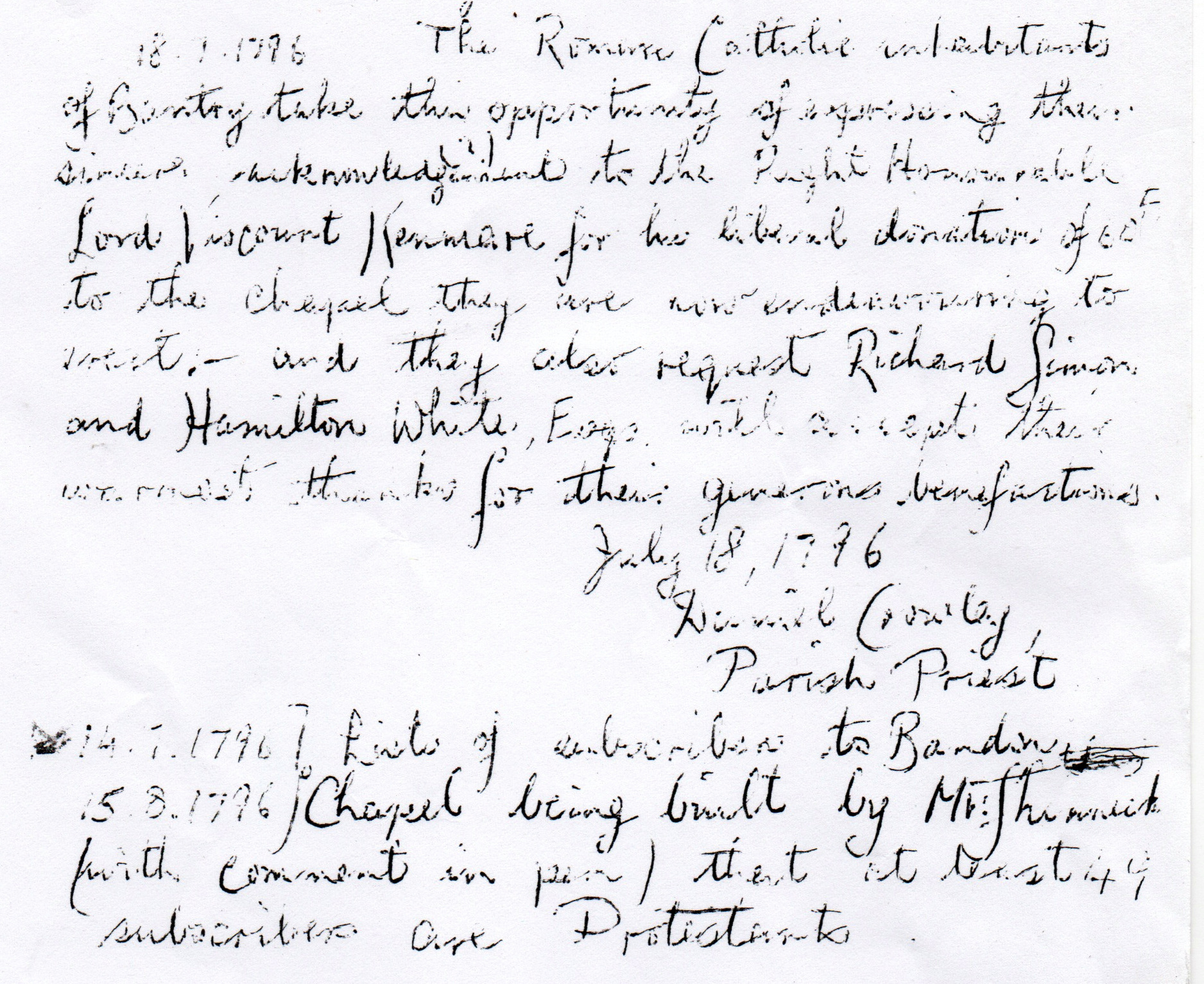 1796, Bandon Catholic Chapel being built by Father Shinwick, List of Subscribers includes at least 49 Protestants. Bantry Catholics in 1796 acknowledge the Liberal Donation for the proposed Chapel of Lord Viscount Kenmare and thank Richard Simon and Hamilton White for their Generous Benefaction.