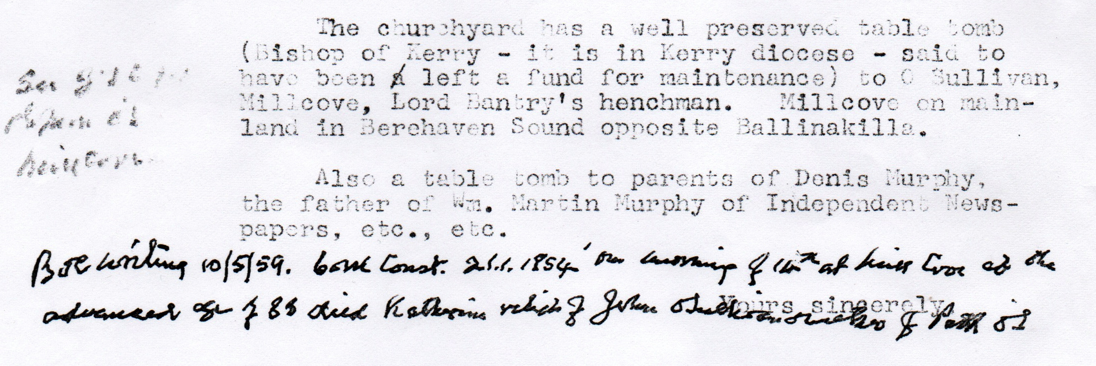 Ballinakilla Churchyard, Bere Island, on the site of a Pre-Reformation Church containing Table Tomb to O’Sullivan, Mill Cove. Agent to Lord Bantry and to the parents of Denis Murphy the father of William Martin Murphy