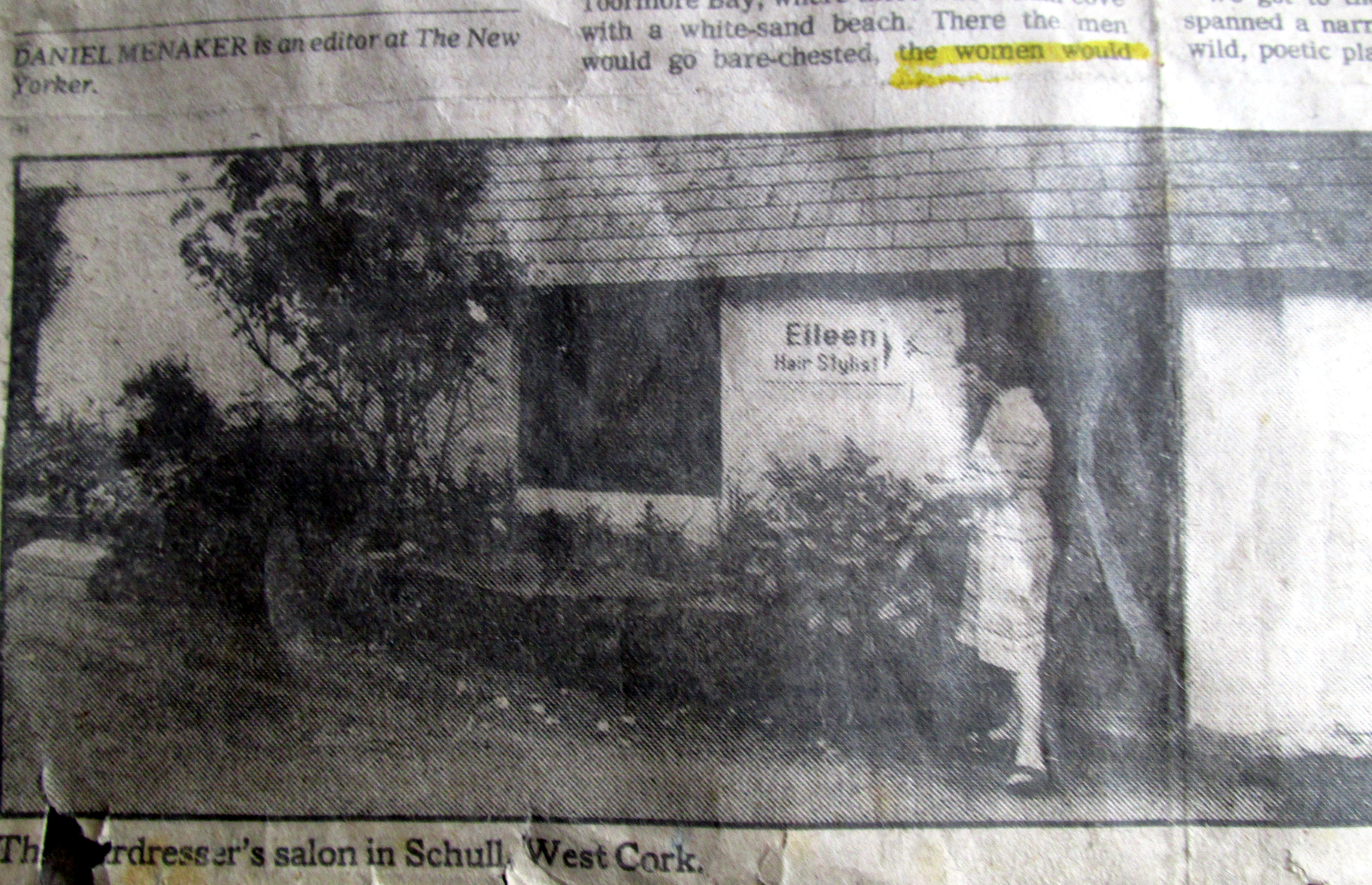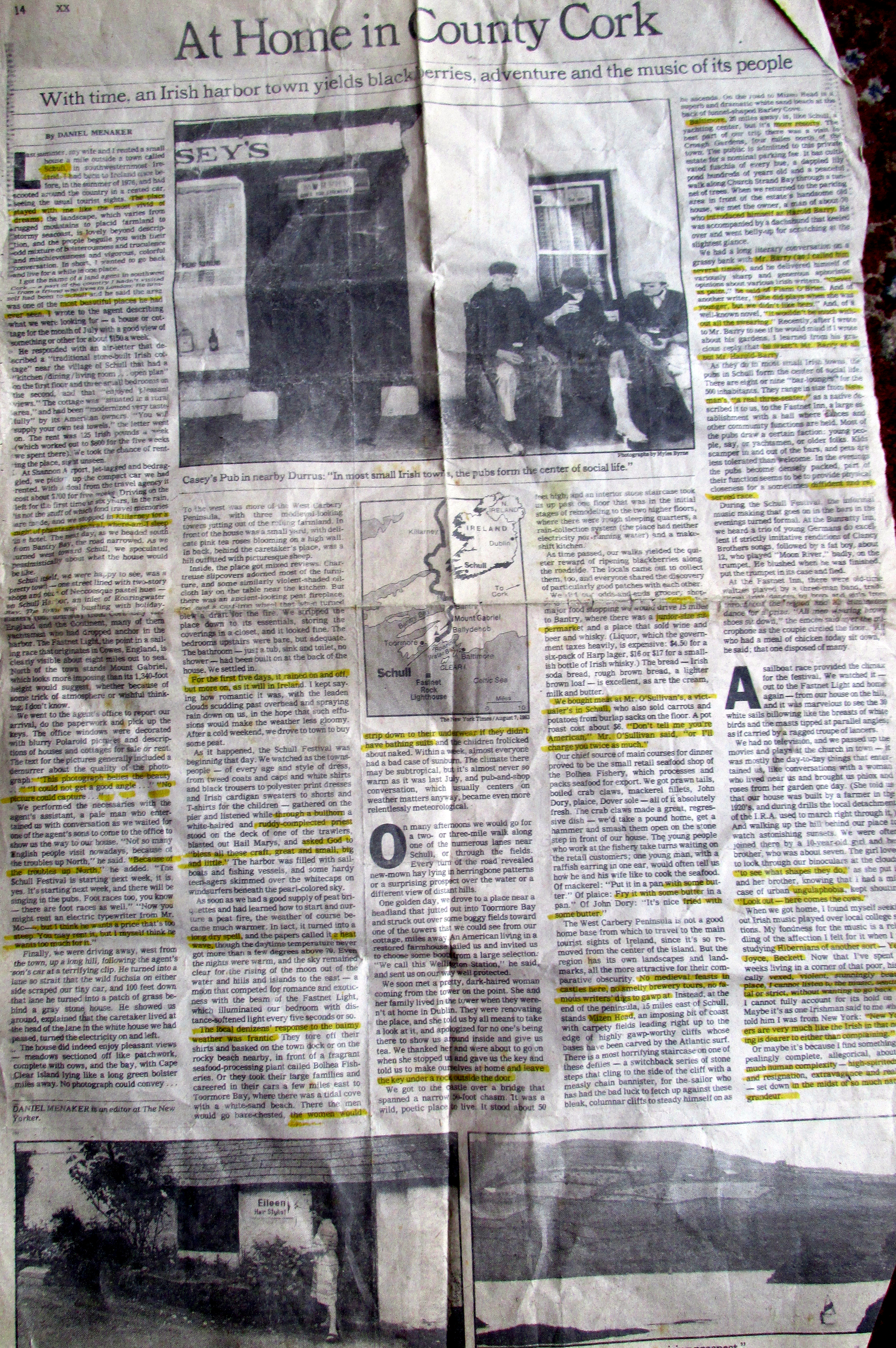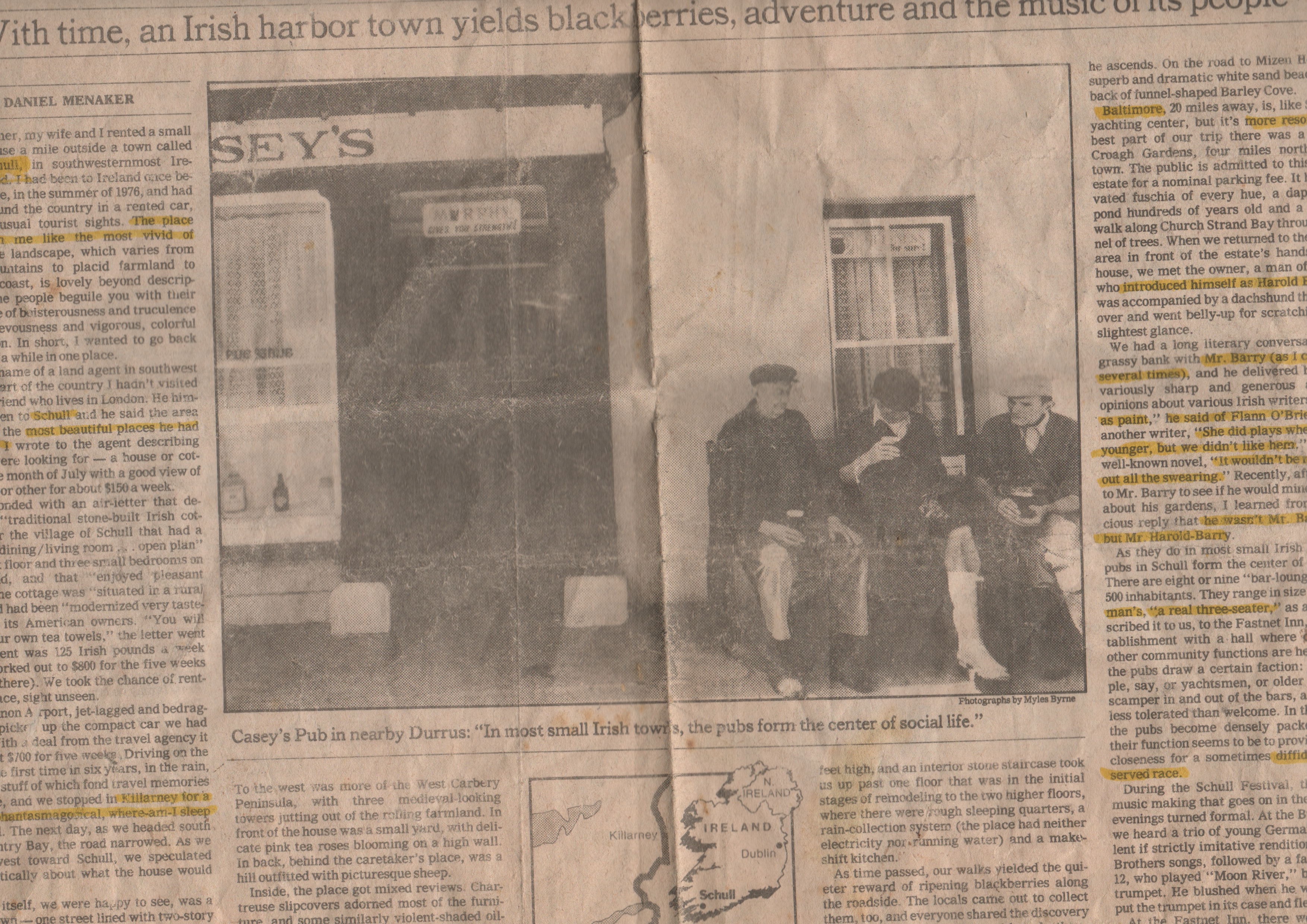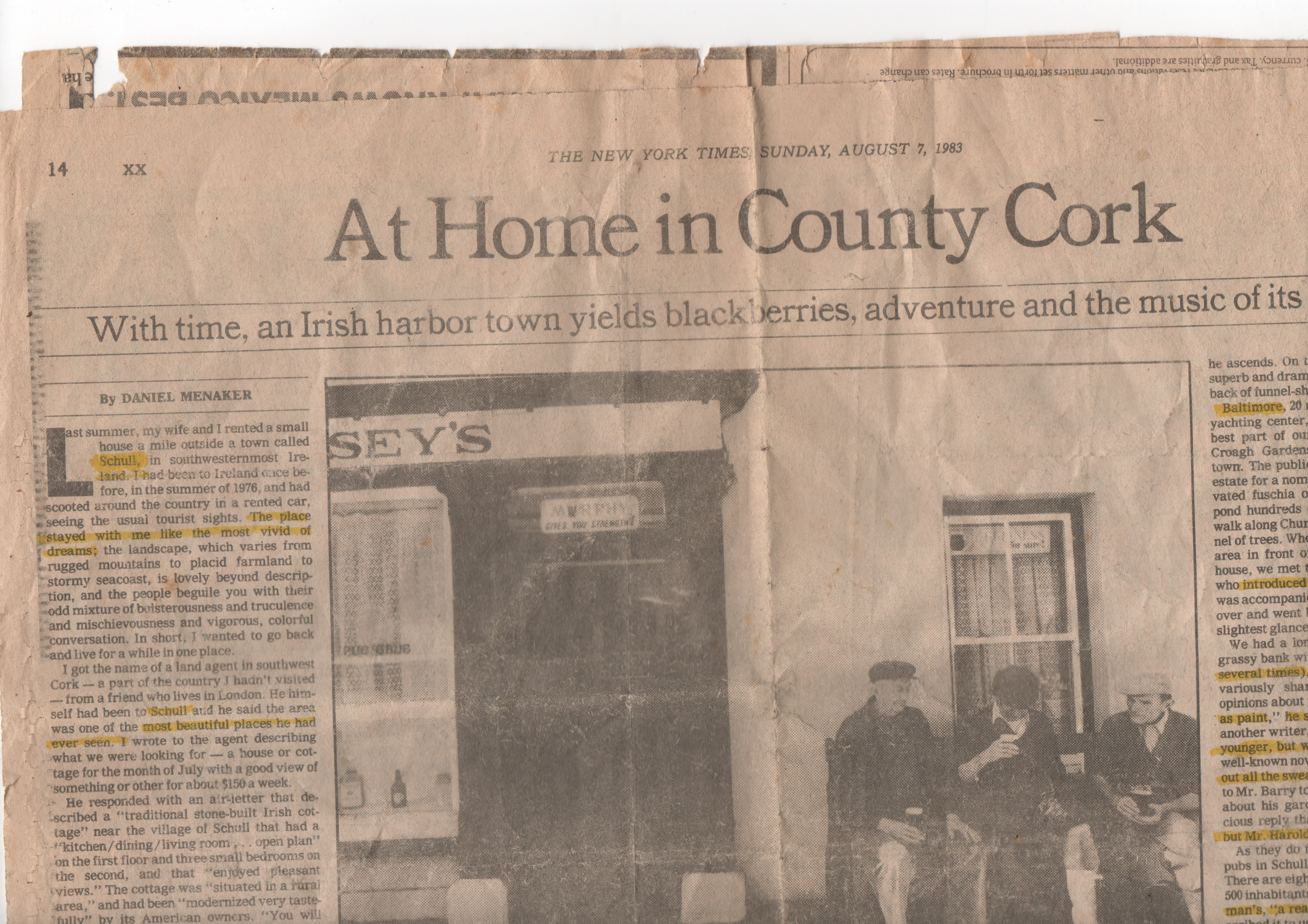 Sunday, 7th August, 1983 New York Times Article, Co. Cork with Photo, Casey’s Bar, Durrus, ‘Not many English people Visit Now because of the Troubles Up North’