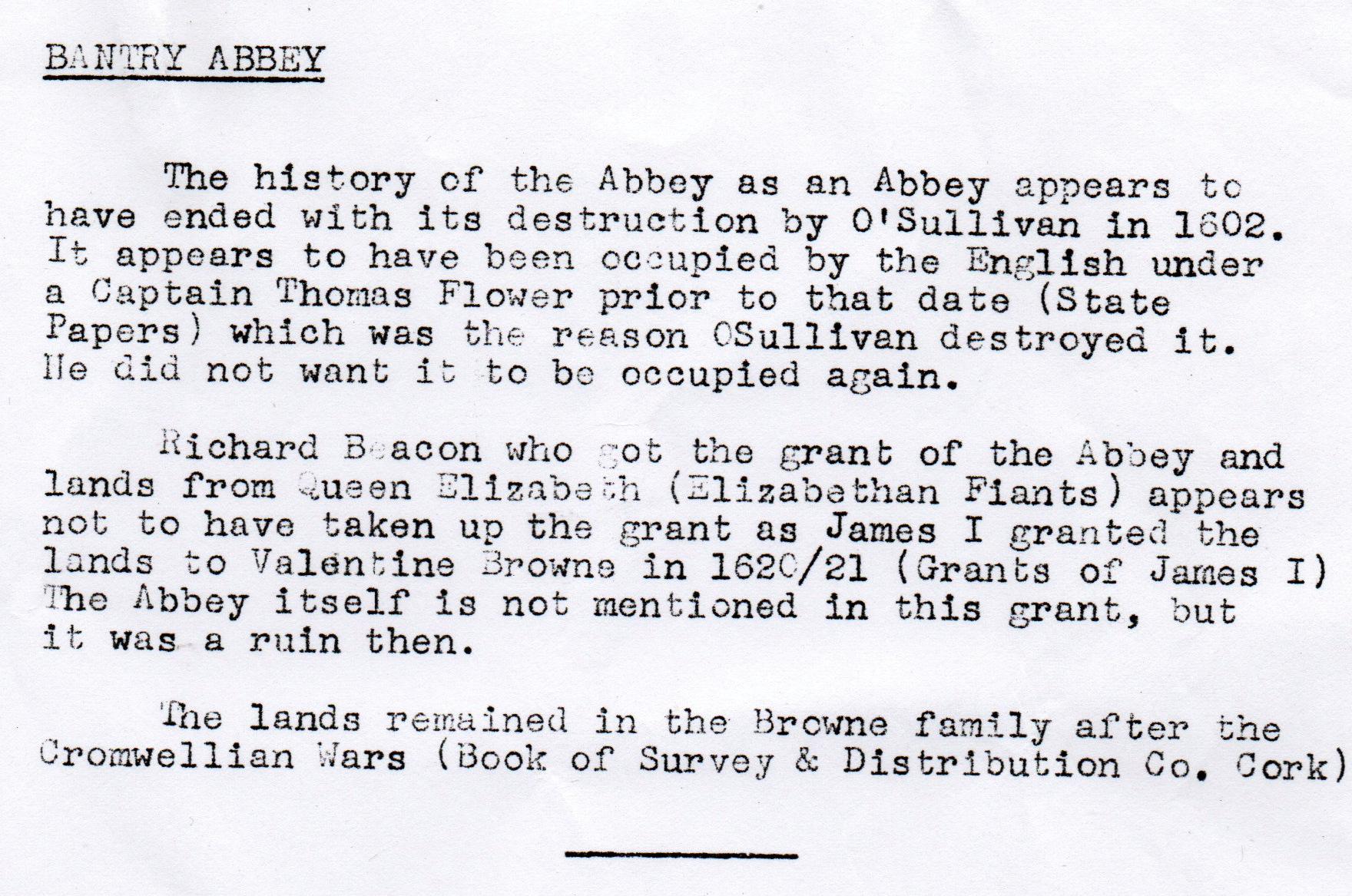 The 1602 Destruction of the Franciscan Abbey in Bantry by the O’Sullivans after its use by the English Garrison under Captain Thomas Flower. Grant of local lands by Elizabeth 1 to Richard Beacon not taken up as James 1 granted then to Valentine Browne 1620 later forming part of the Kenmare Estate.