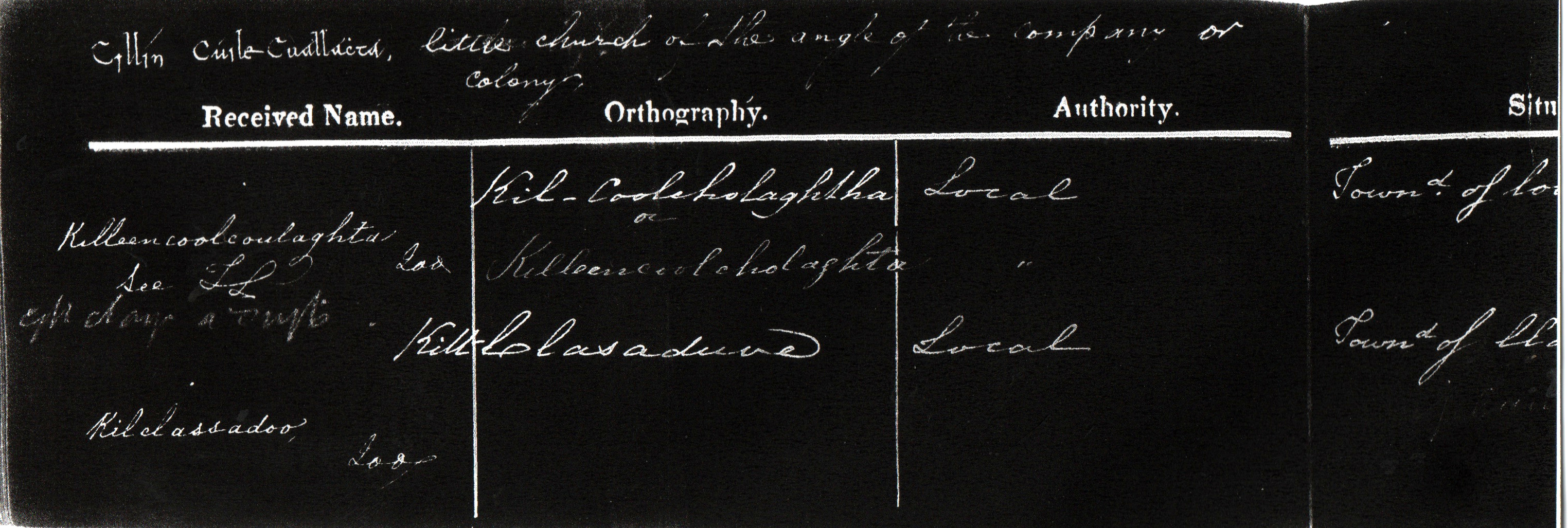 Very interesting information: For example Coolcoulaghta (here Cuile Cuallachta while Cuar Chuallachta according to logainm.ie).