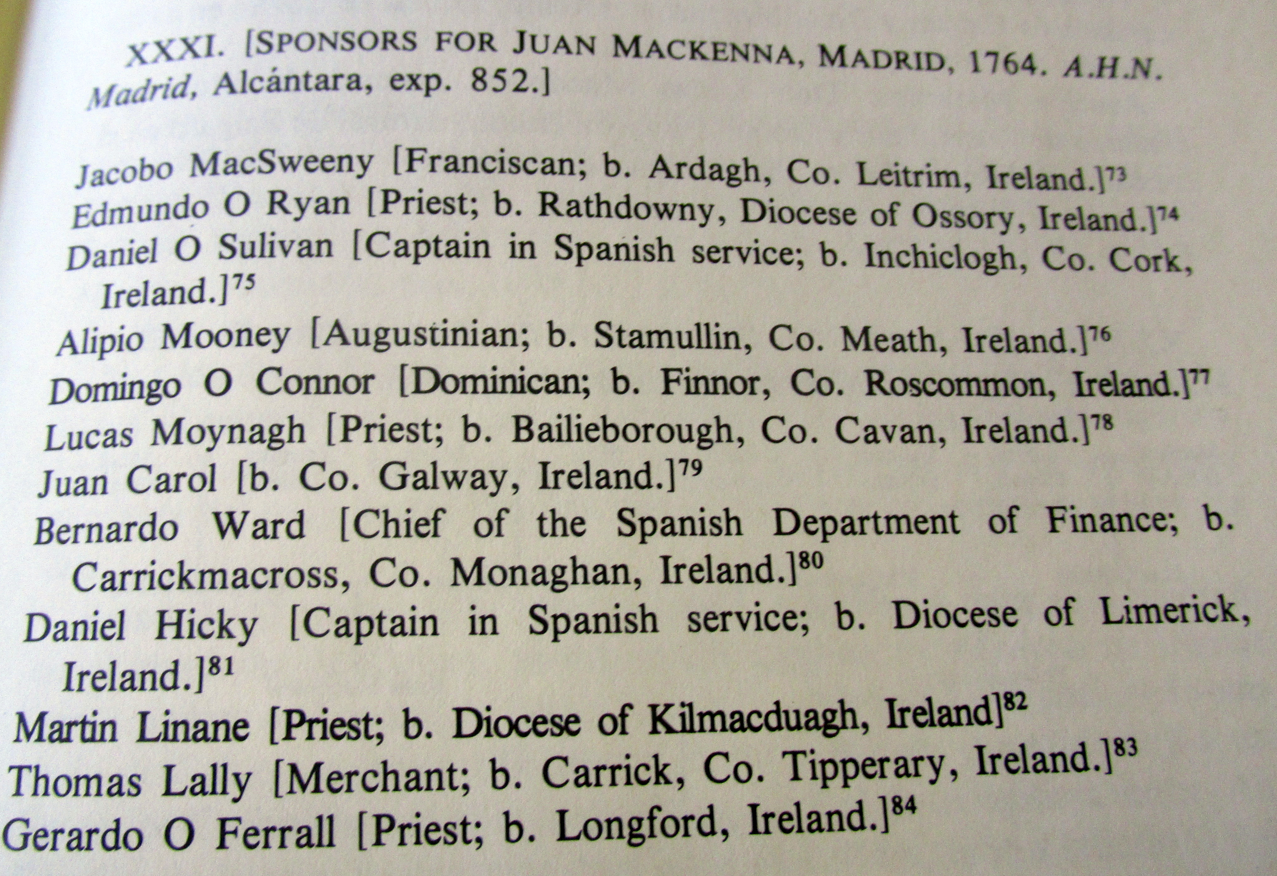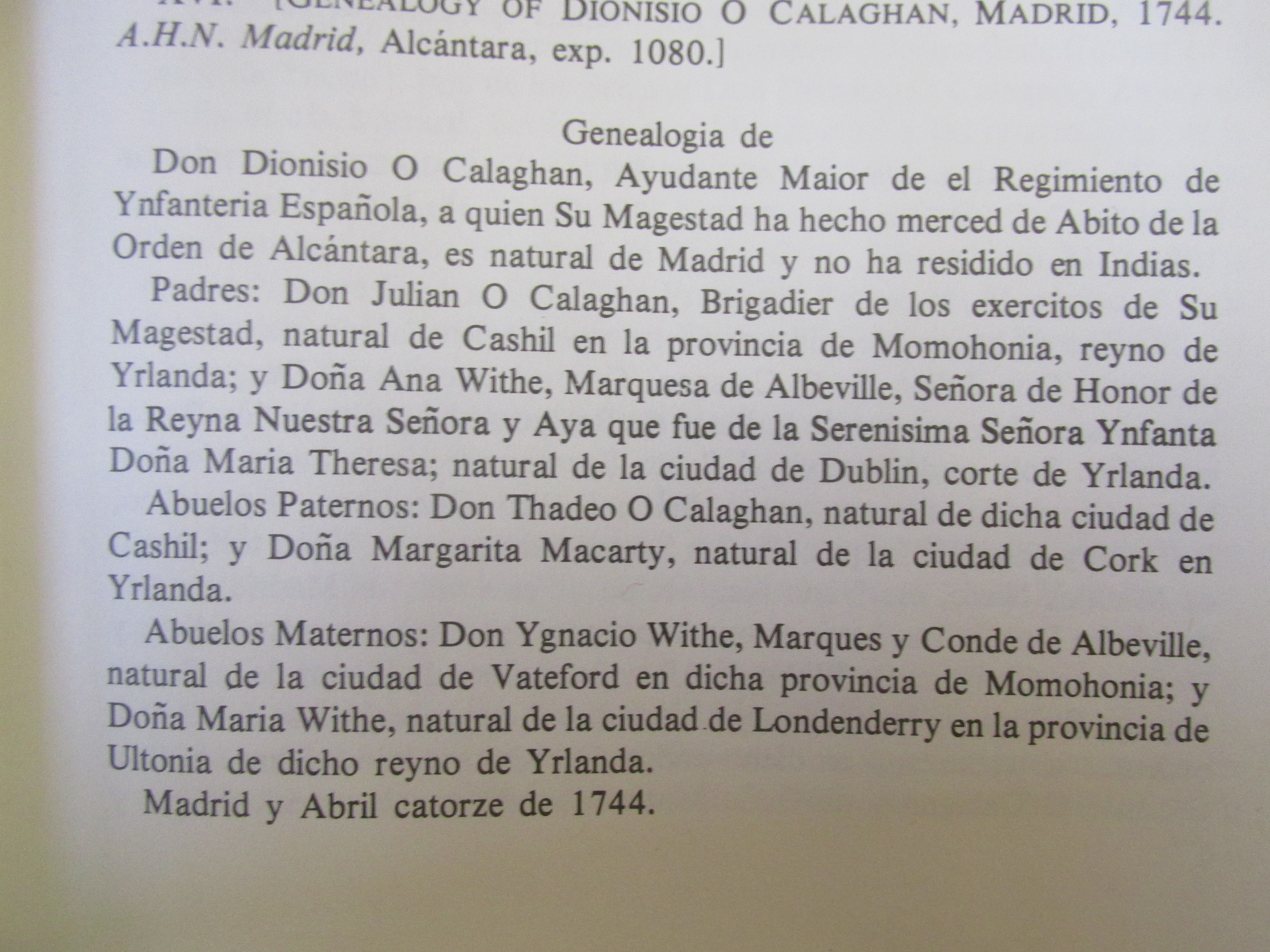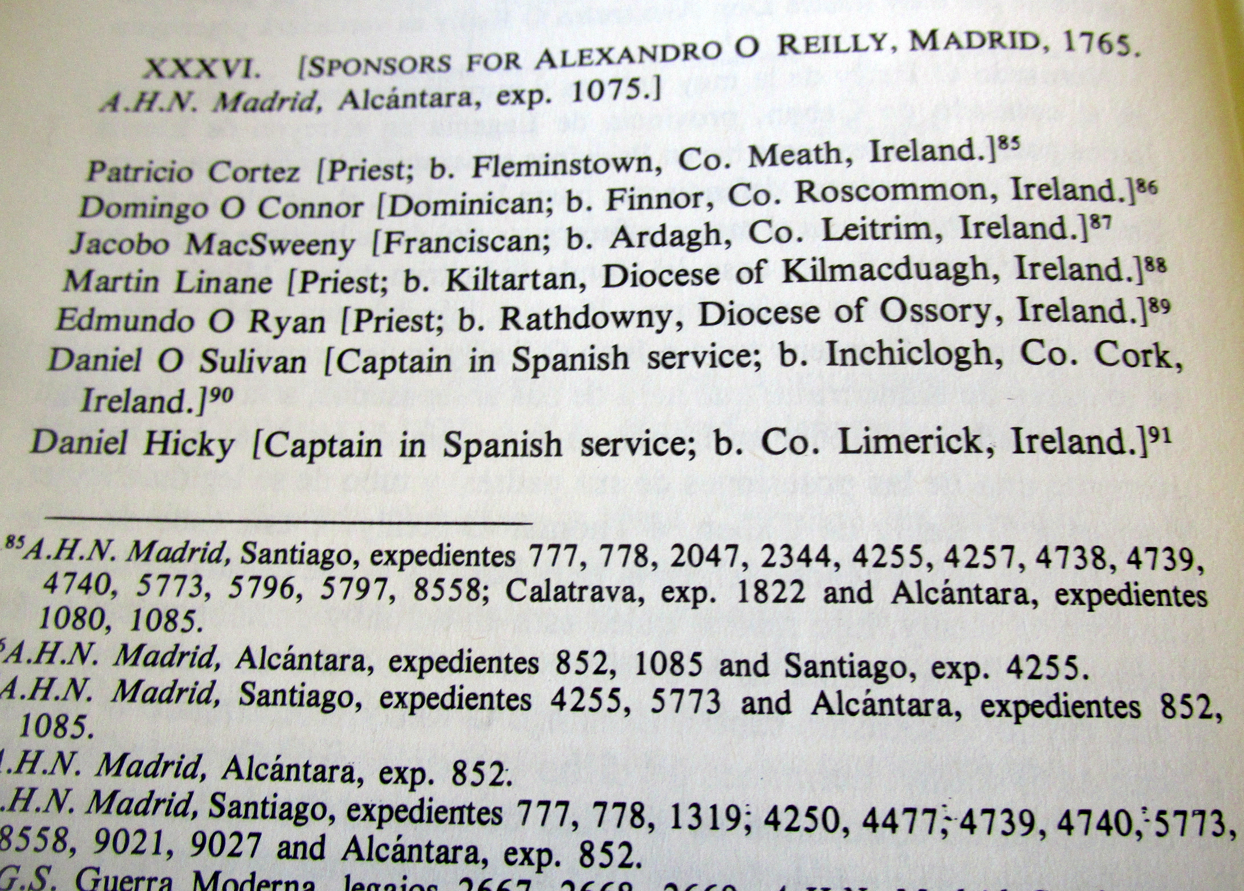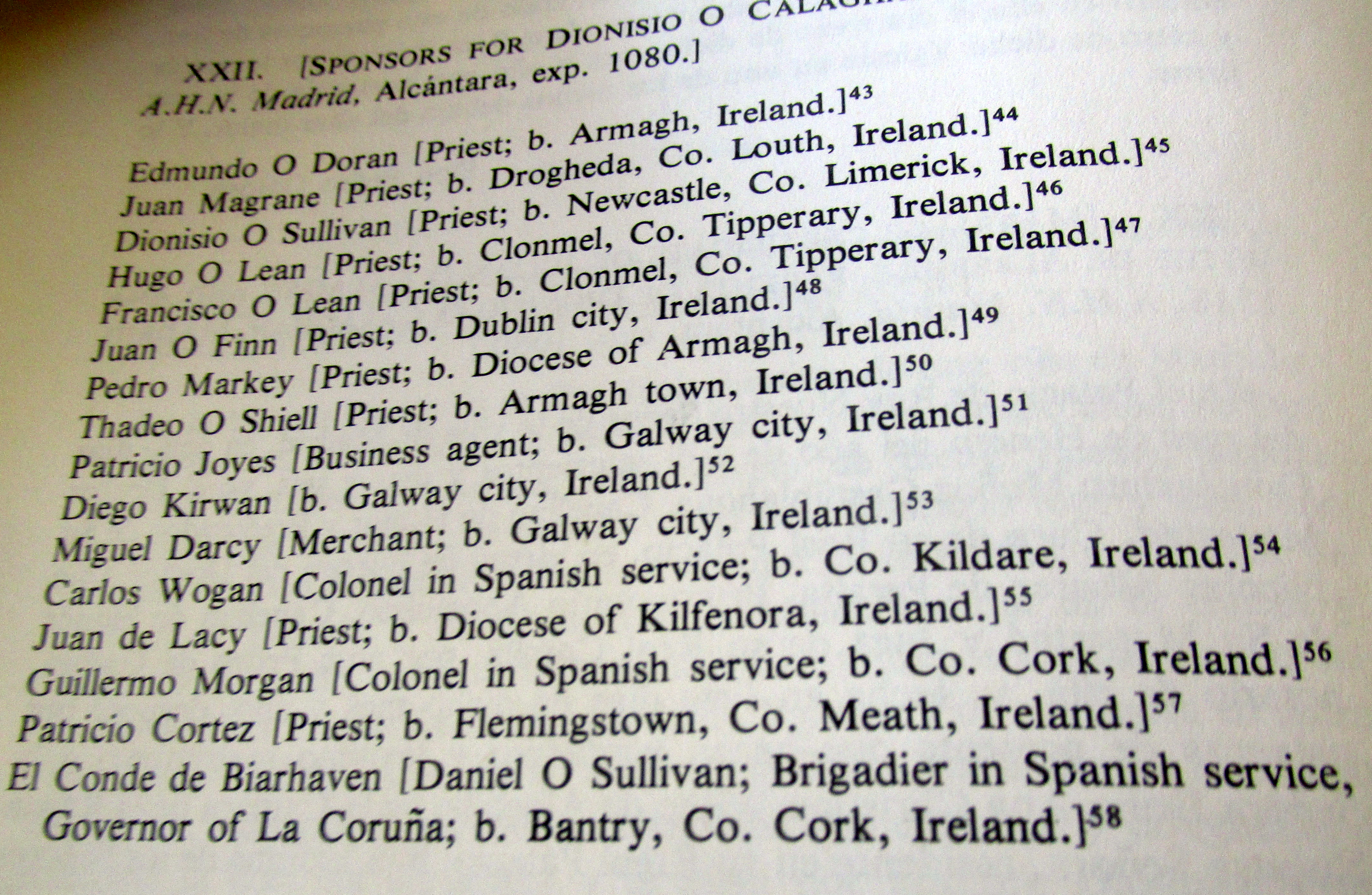 Spanish Knights of Irish Origin, The Count of Berehaven, Brigadier Daniel O’Sullivan, Governor of Coruna, born Bantry, West Cork, sponsor of Dionisio O Calaghan born Madrid 1718, Grandmother Margaret McCarthy, born Cork, Captain Daniel O Sulivan, Spanish Service born Inchiclogh, Bantry, sponsor Juan McKenna born Madrid 1714, Alexandra O’Neill born Madrid 1765. From Micheline Walsh, for the Irish manuscript Commission, 1978. The Irish emigres on the Continent had to prove their noble status to enter the various nobilities. An example is the Genealogy compiled by the O’Neills to be allowed enter the Spanish Aristocracy: https://durrushistory.com/2014/03/27/discovery-of-lost-vellum-manuscript-documenting-oreillys-genealogy-of-breffni-cavan-over-1000-years-in-munich-2008-irish-presence-in-cuba-18th-century-and-irish-named-street-escape-castro-emba/