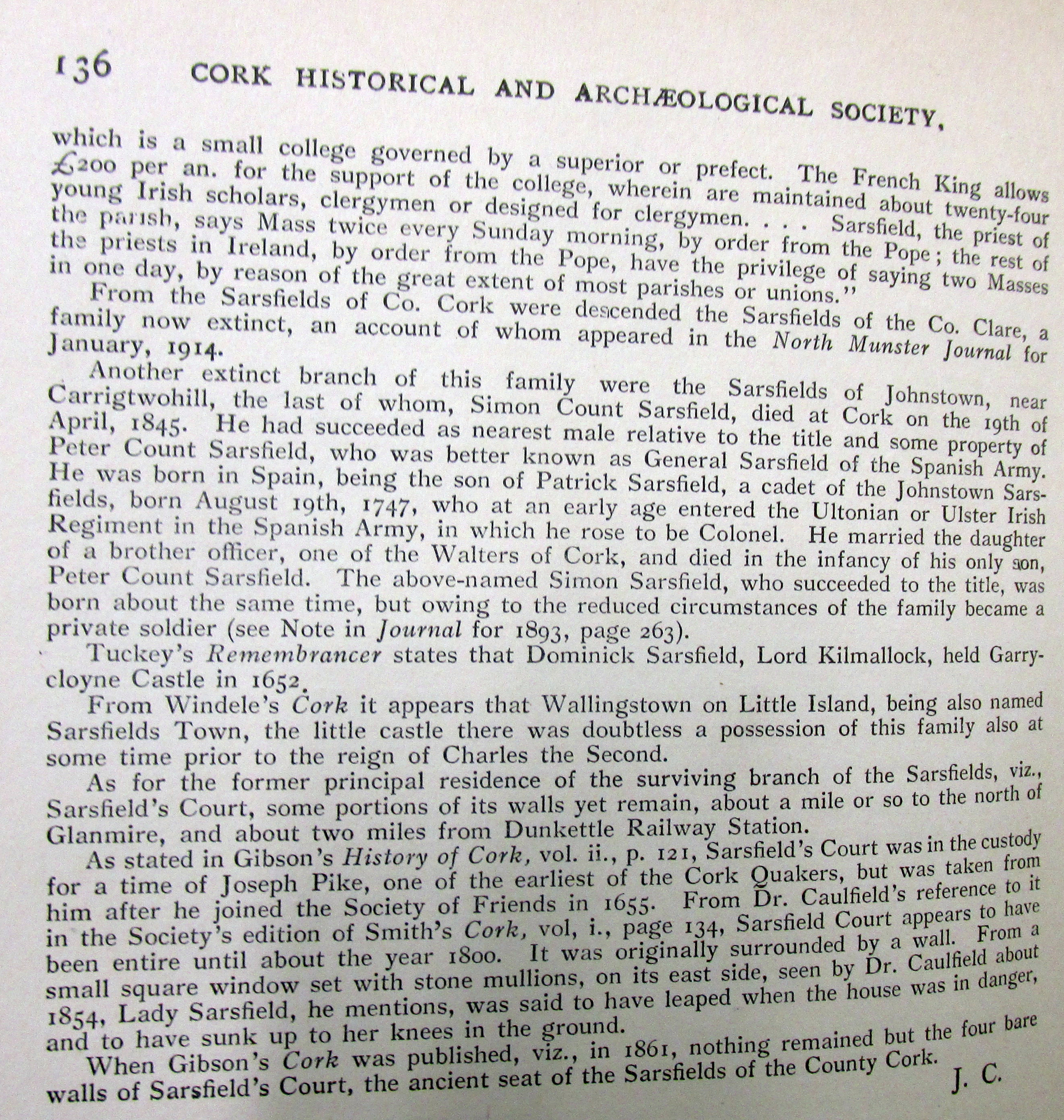 The Estate records show a remarkable continuity of O’Sullivans having substantial leases. In the 18th and 19th century branches of the various families appear to have retained de facto control. These families intermarried with similar Catholic families such as the O’Connell of Derrynane, Co. Kerry, the O’Learys, the McCarthys, the O’Donovans and also into the Protestant Gentry families being similar on the social scale. As the Penal Laws were relaxed in the later 18th century they began to serve in the British Military Service and also enter the Legal and other Professional areas.