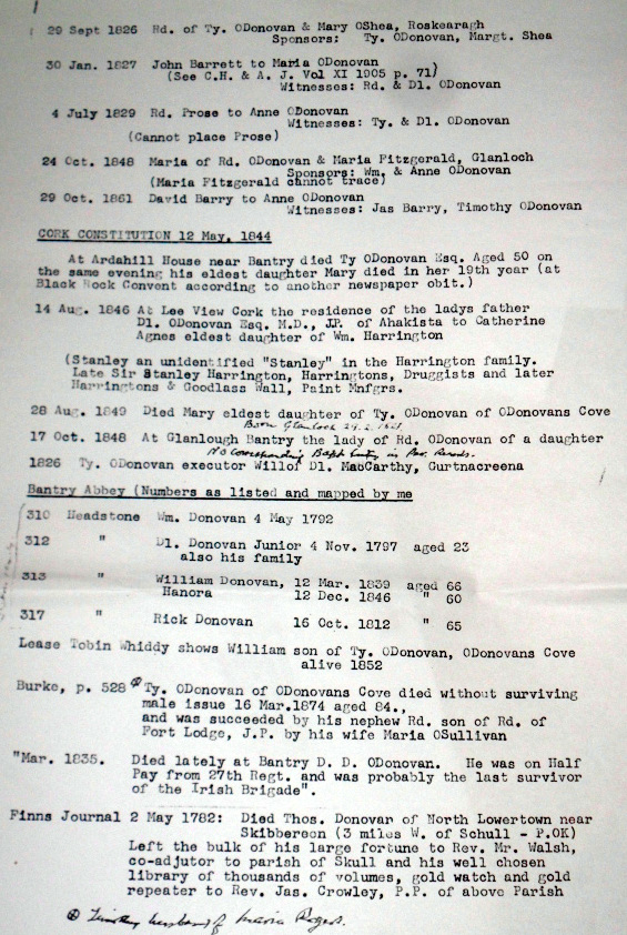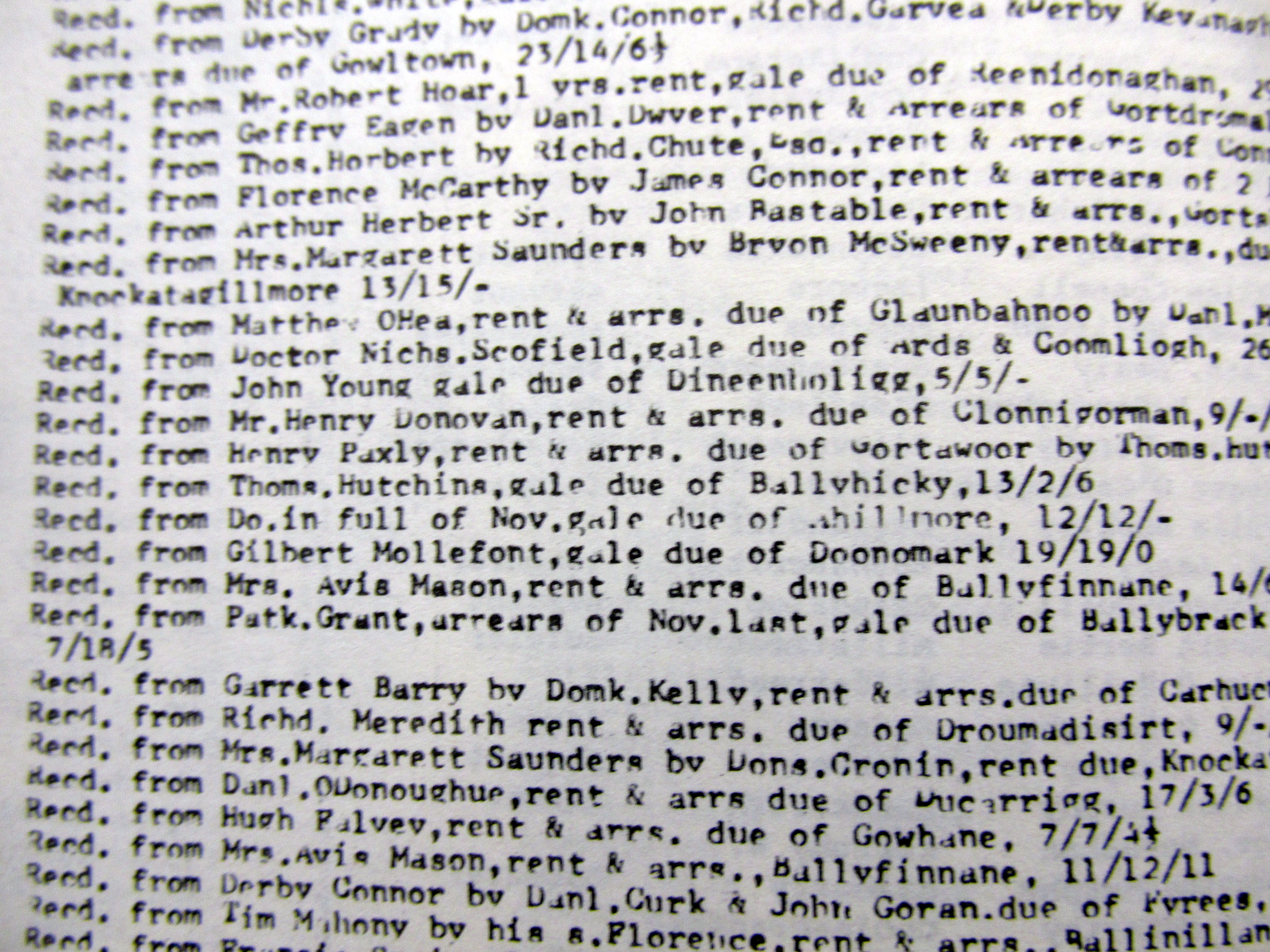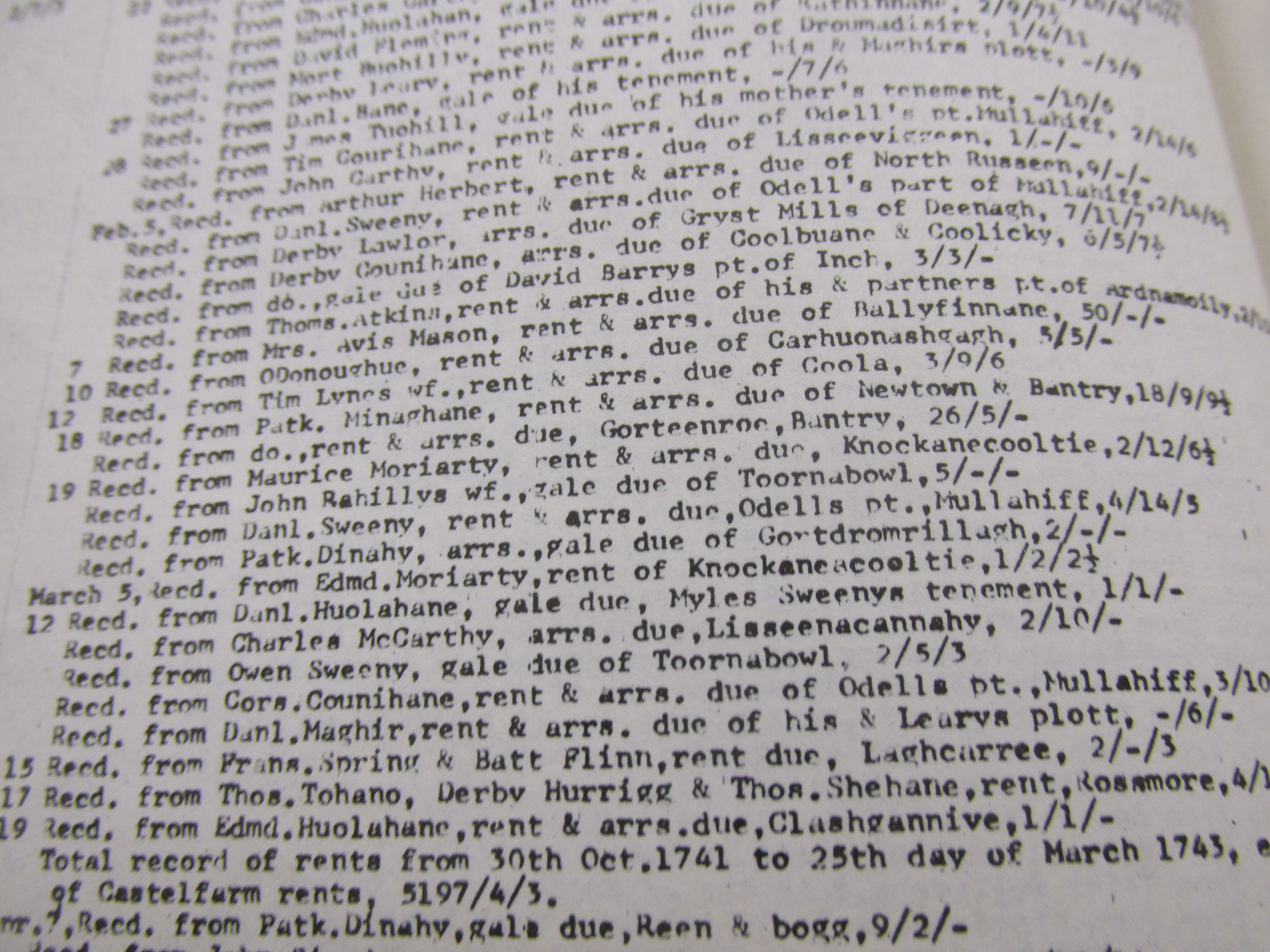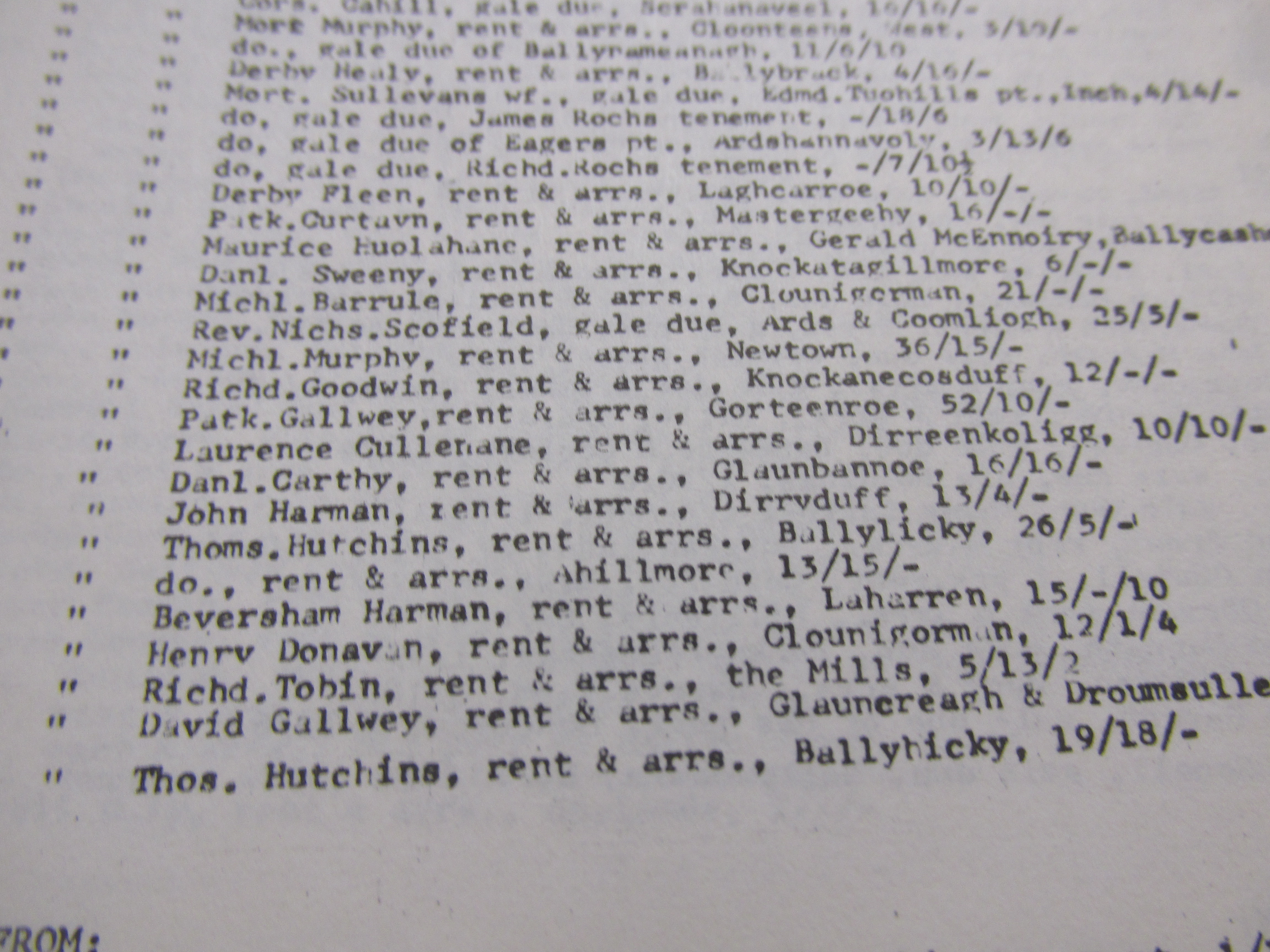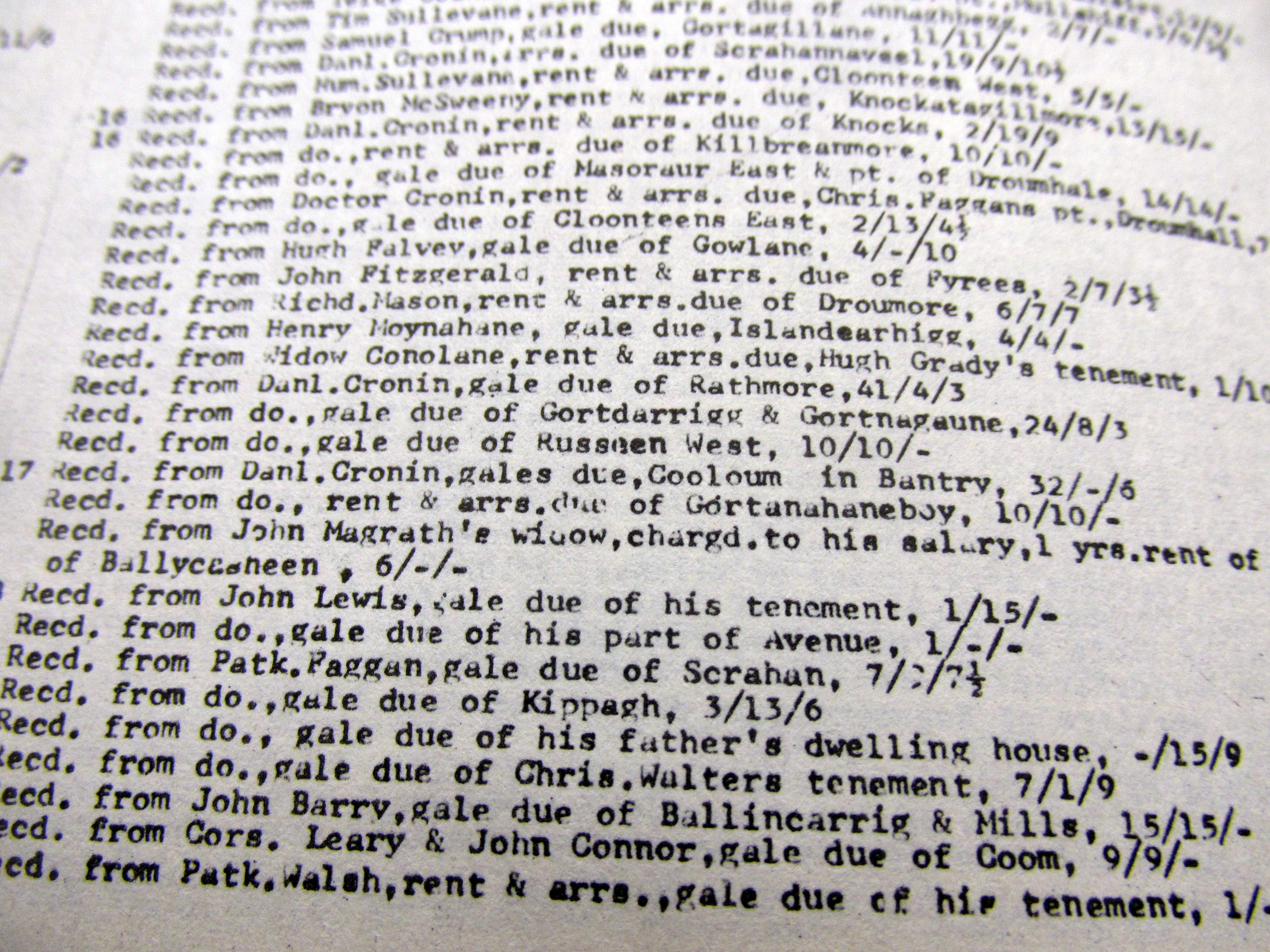 The Wholey brothers from the Mealagh Valley threshed in the Bantry area and traditionally the last was carried on around the 11th October on the farm of Barnaby Deane, . That had been a Vickery farm since 1785 and is now owned by the O’Sullivan family. Barnaby had a particular requirement to mix light and heavy hay with the straw which involved a day long process. On occasion he was helped by the Reverend Doherty who was also adept as the use of the scythe in cutting corn while his wife Mrs. Doherty helped the women to cater in the kitchen. Oats was the crop generally threshed sometime barley or wheat. If wheat was used it involved a thorough cleaning of the machine to remove all traces of oats.