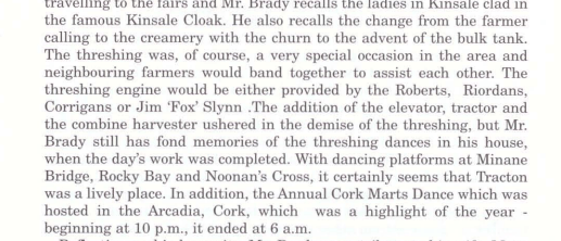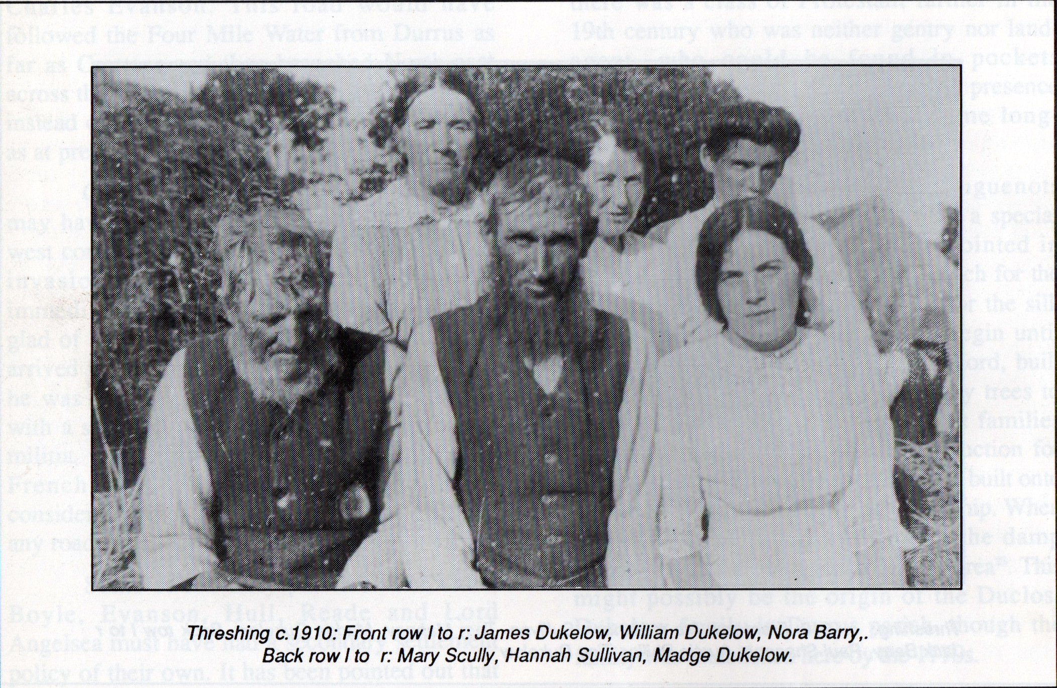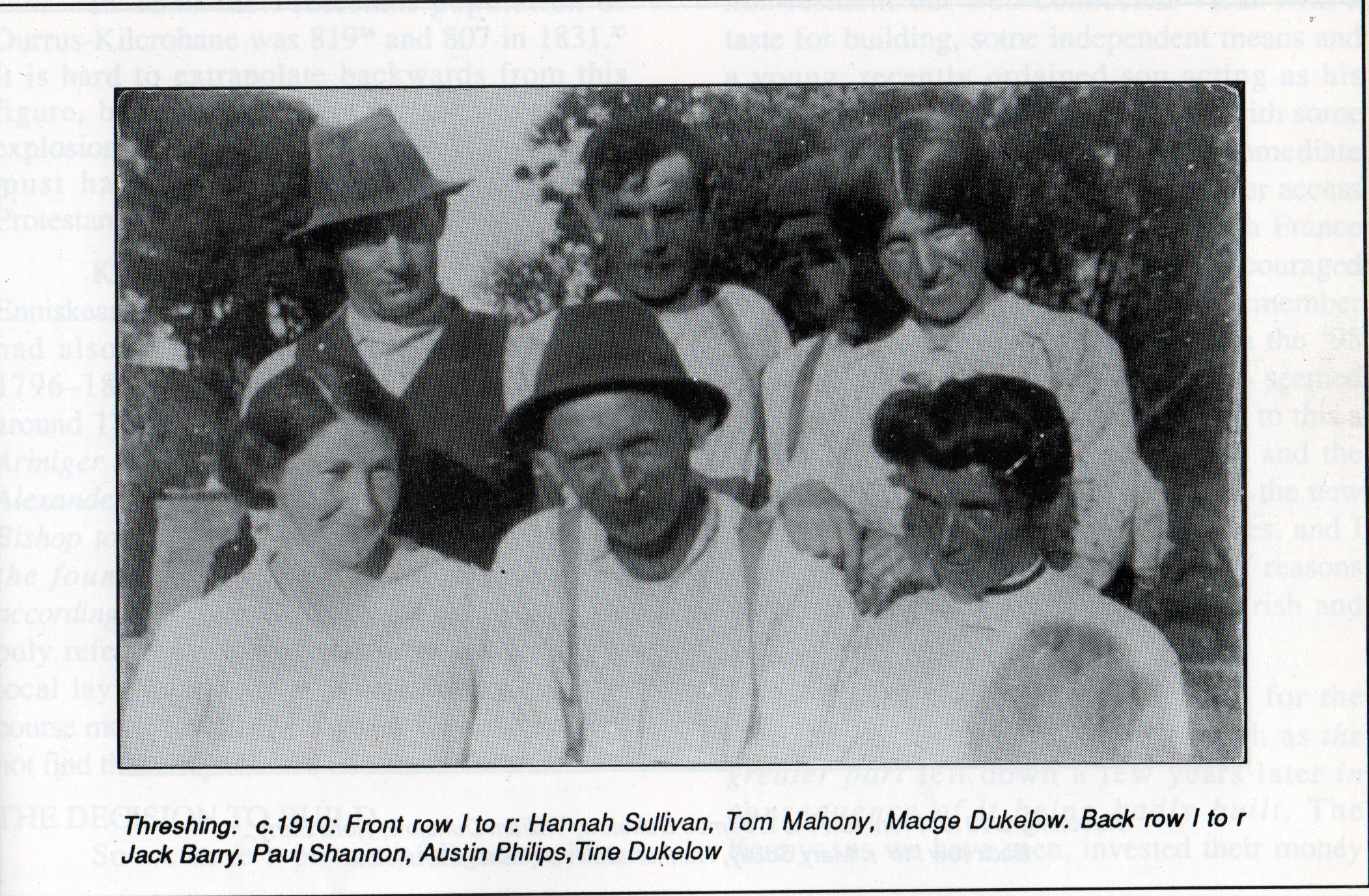 The Crowleys in Colomane, Parish of Caheragh, also threshed around their home area and then went to Waterford also until near Christmas. Their father was Jim ( Jim Peg) and mother was Margaret Mc Carthy. Names: Mary (Geaney), John, Joe, Jimmy, Madgie, Denis. They are all dead now.