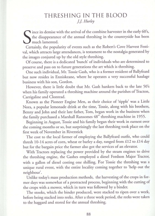 In the era of horses on farms there was an ongoing demand for oats so many farmers grew oats. After harvesting they were piled in a stack awaiting threshing which from the late 19th century was do by a steam threshing machine. This continued to the 1960s, in the Durrus area there was a threshing on the Shannon farm in Rossmore in 1965 and thereafter the use of the threshing machine petered out. By the mid 1960 the combine harvester had arrived in the area with the O’Donovan brothers from Kealties followed by Phil Shanahan.
