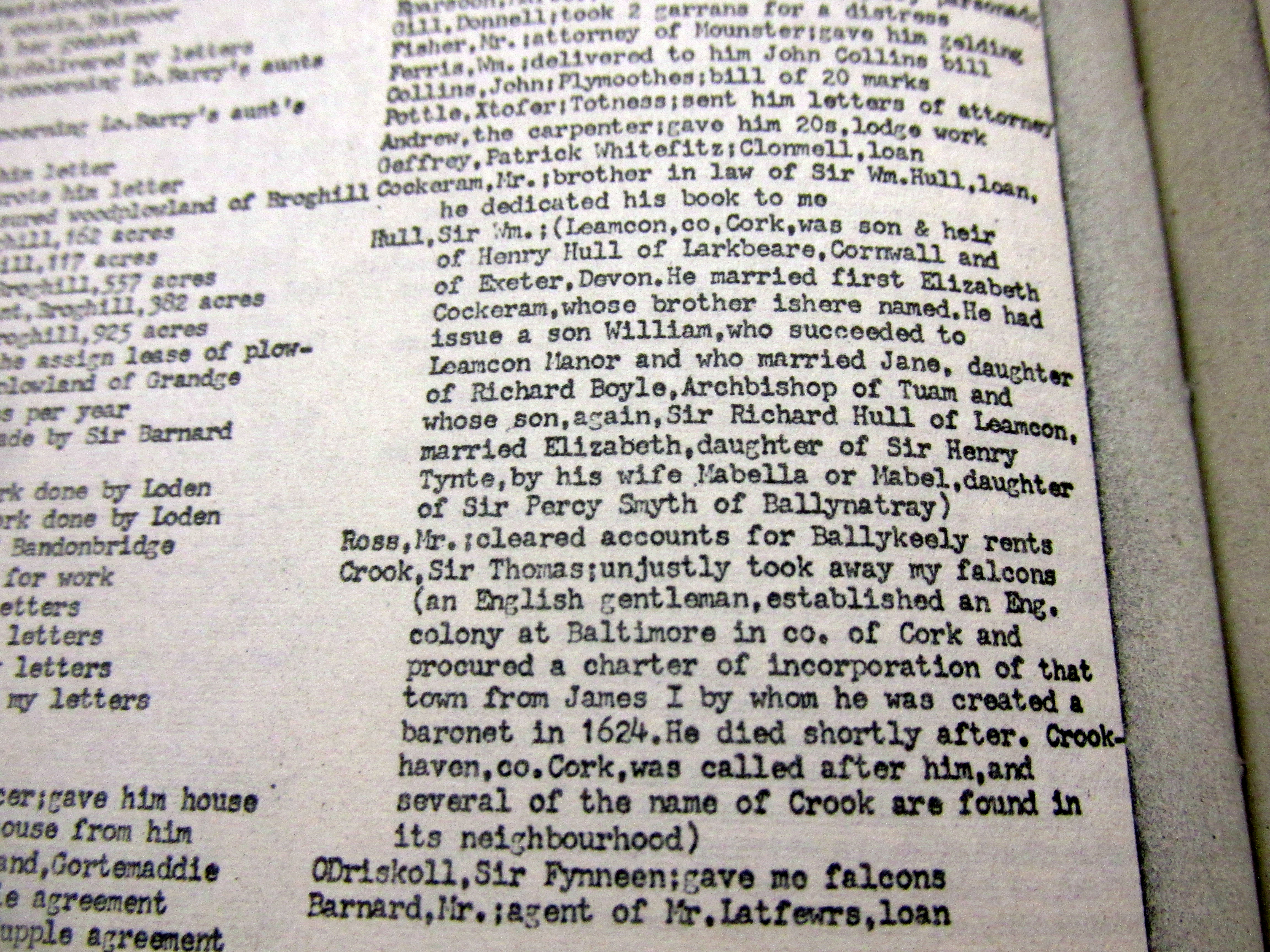 Richard Boyle, Great Earl of Cork, on Sir William Hull of Leamcon, Schull and Sir Thomas Crook, founder of Baltimore who ‘Unjustly took his Falcons’, and Sir Fineen O’Driscoll gave him Falcons
