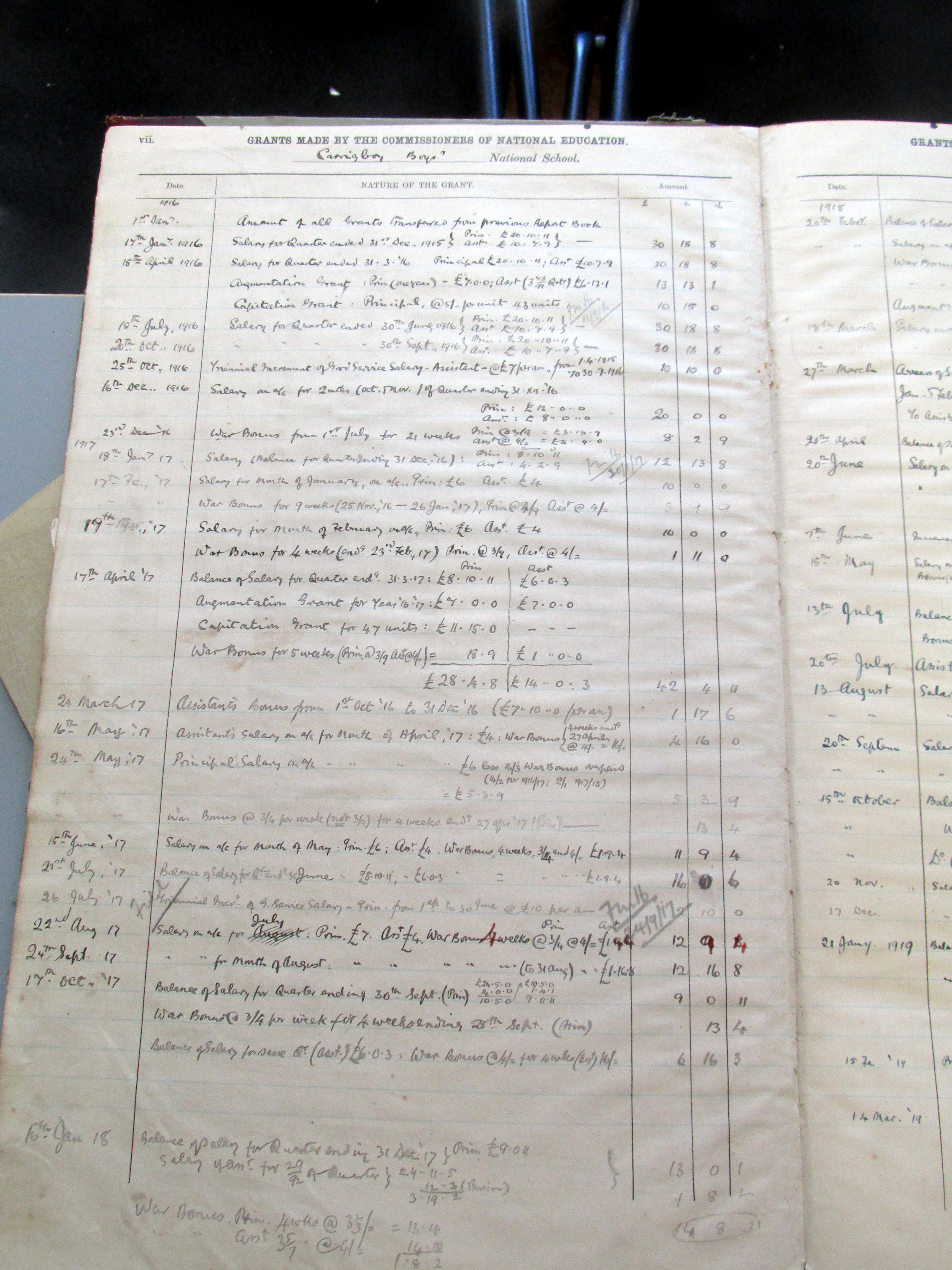 Included in the accounts records of the school, are computations of the relevant bonuses payable to teachers. This was widespread at the time, owing to a shortage of men in the United Kingdom of which Ireland was then a part.