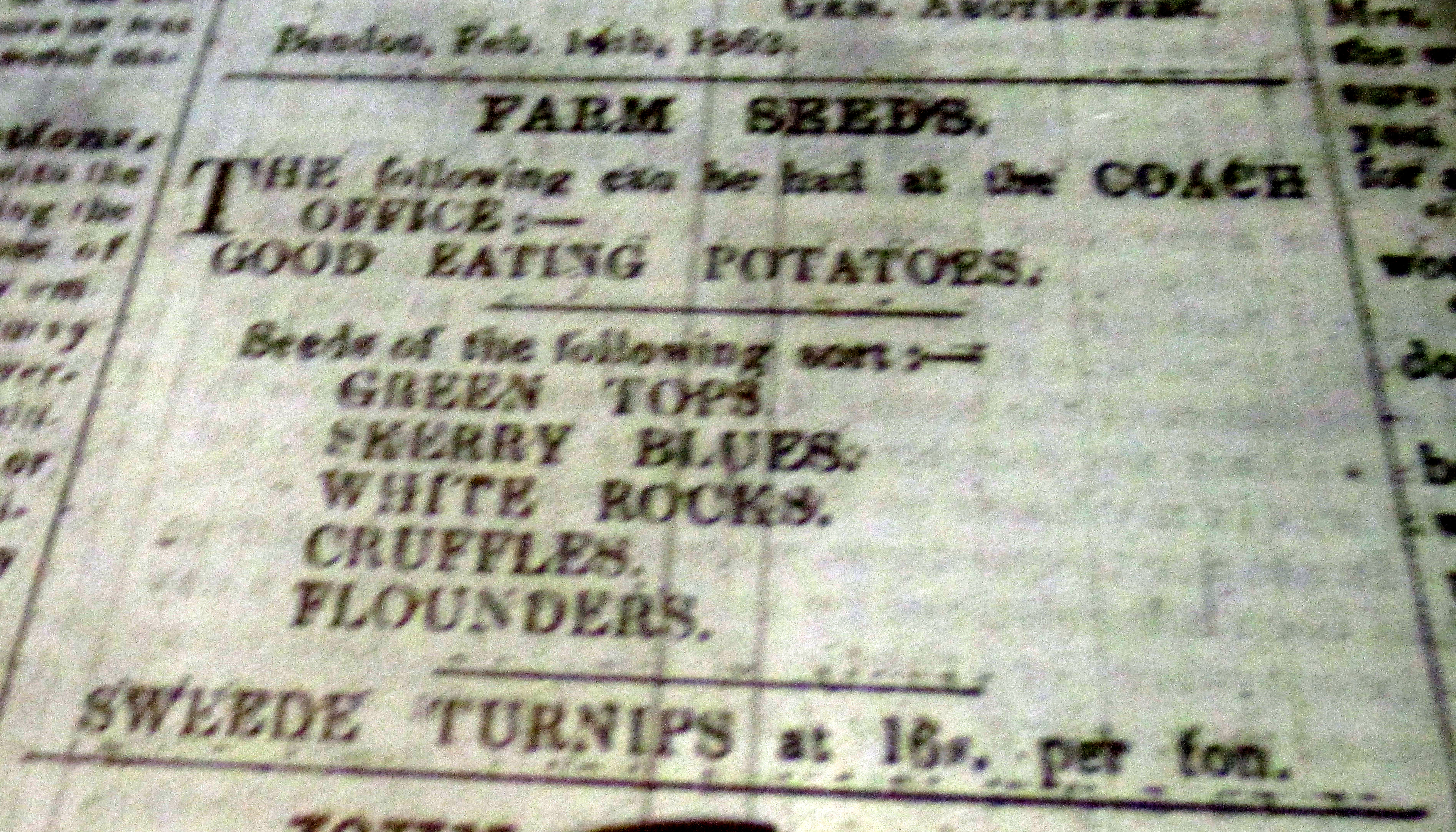 Green Tops, White Rocks, Sherry Blues, Cruffles, Flounders, Seed Potatoes, For Sale, Skibbereen, 1863.