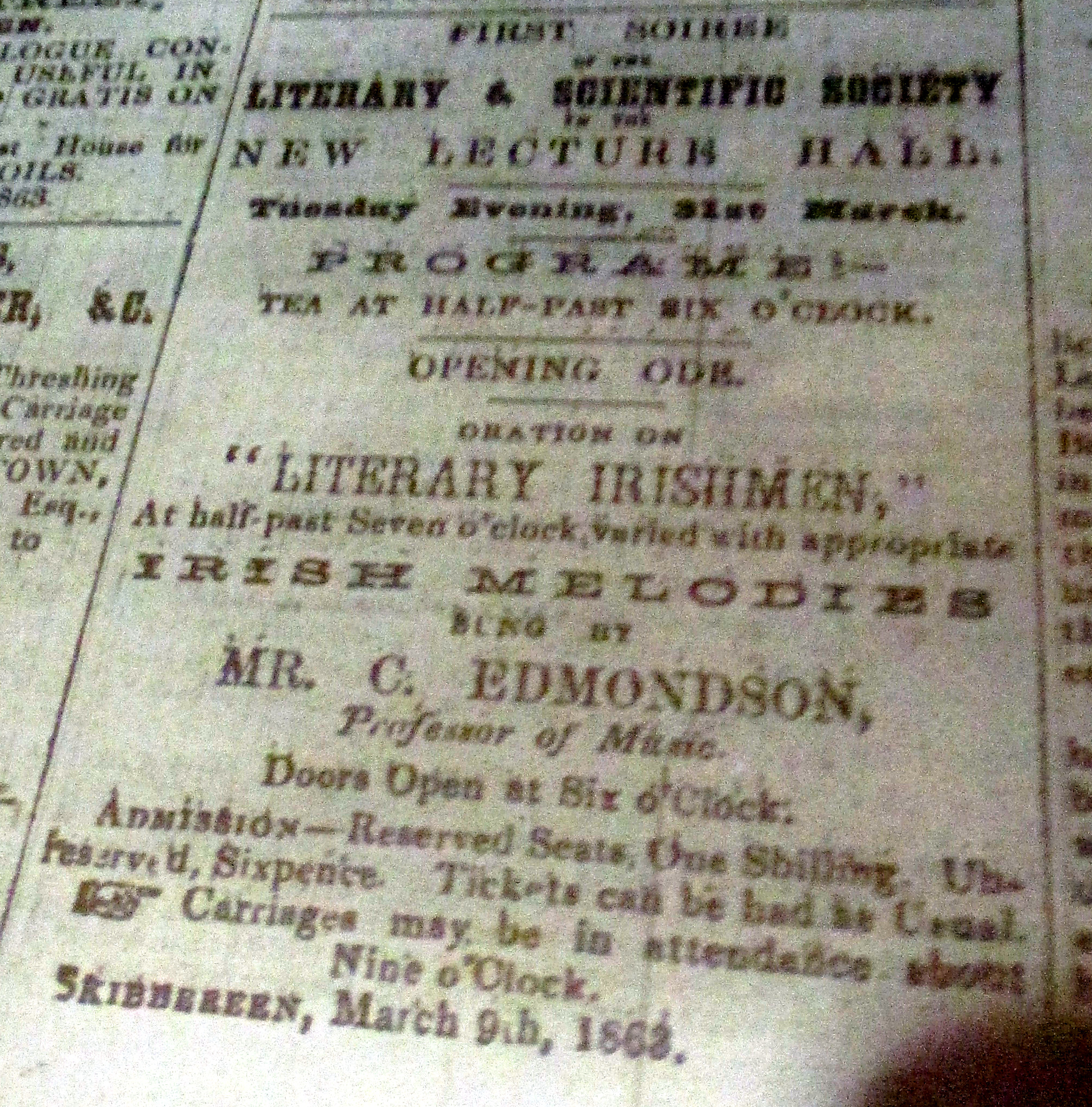 March, 1863, First Soire of the Skibbereen Scientific and Literary Society, with Oration on Literary Irishmen, Varied With Appropriated ‘Irish Melodies’ sung by Mr. C. Edmondson, Professor of Music.