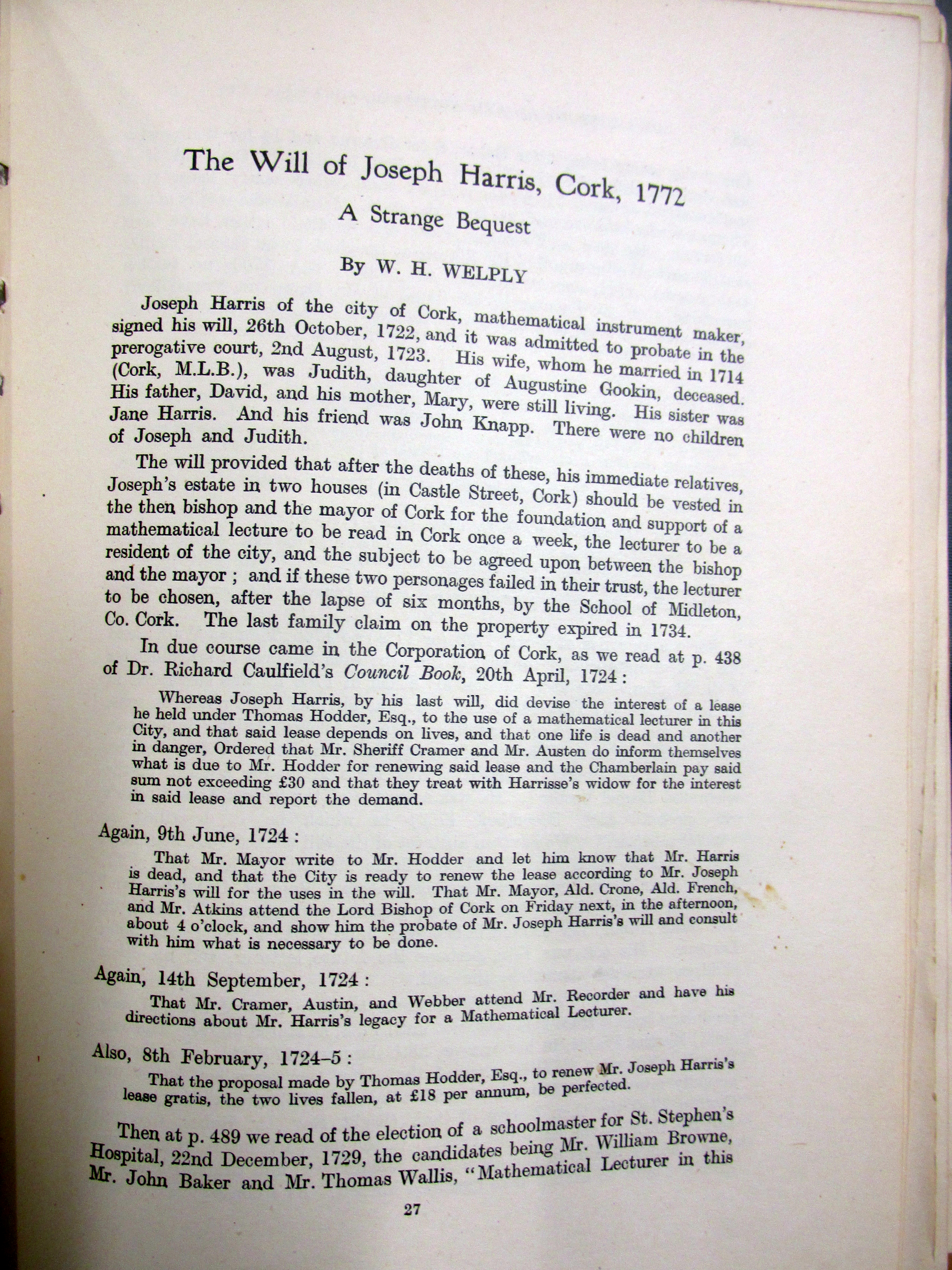Copy of Will of William Joseph Harris, Mathematical Instrument Maker, Cork, and other Wills copied by Welply pre 1922.