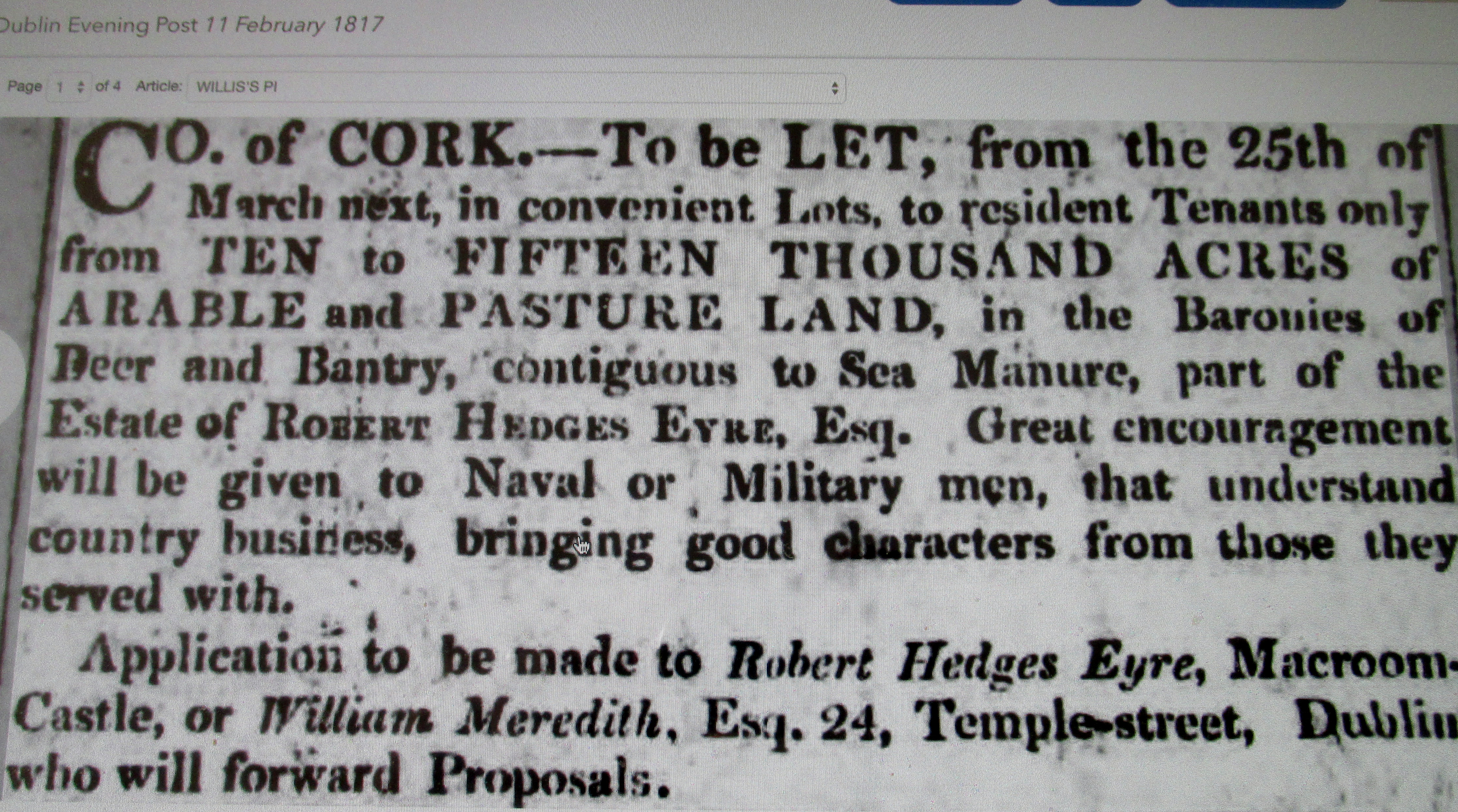 1817, To be Let on Estate of Robert Hedges Eyre Esq., 10 to 15,000 acres, in Lots, in Barony of Bere and Bantry, Great Encouragement Given to Military or Naval men who Understand Country Business must Be Resident.