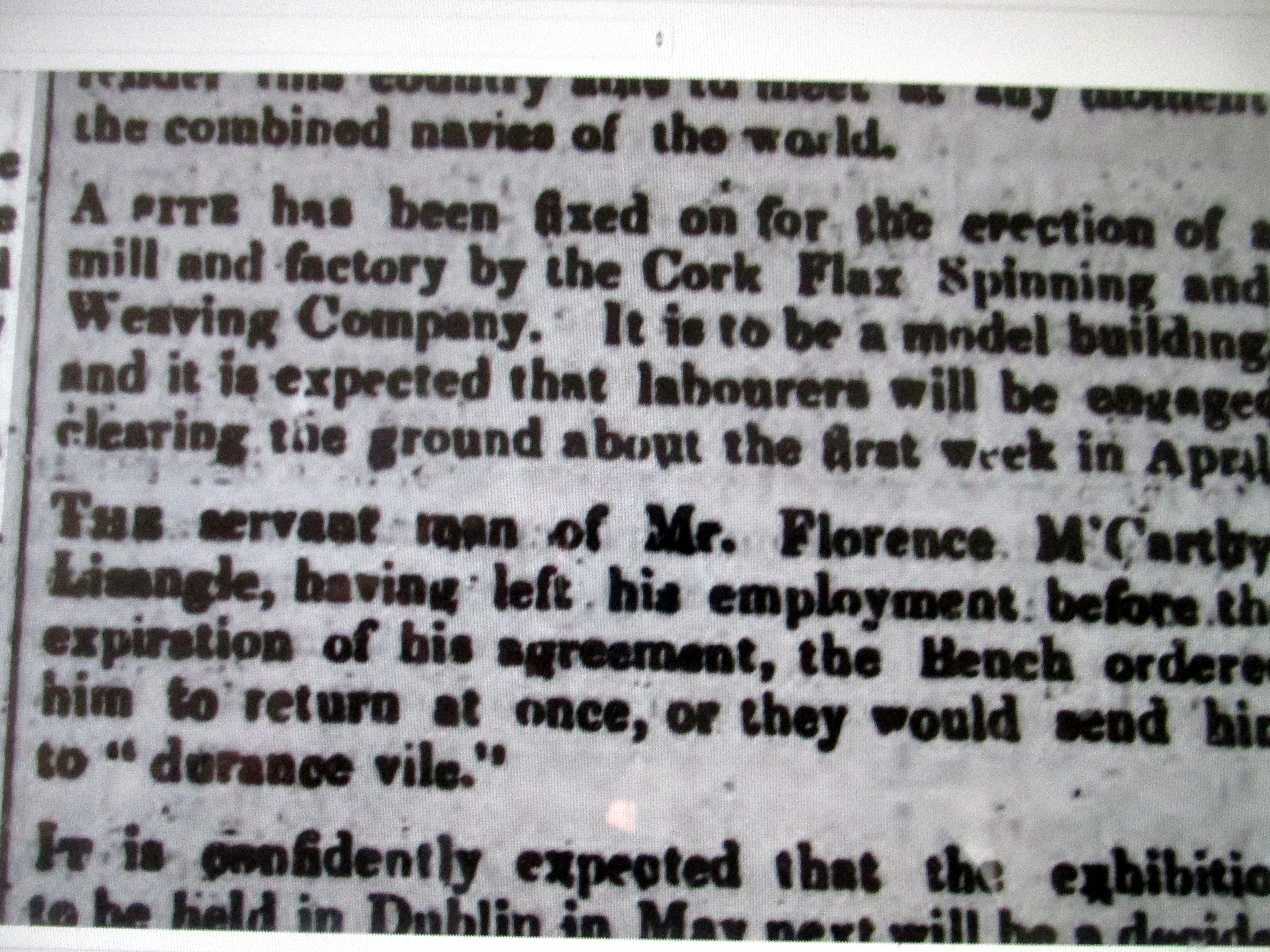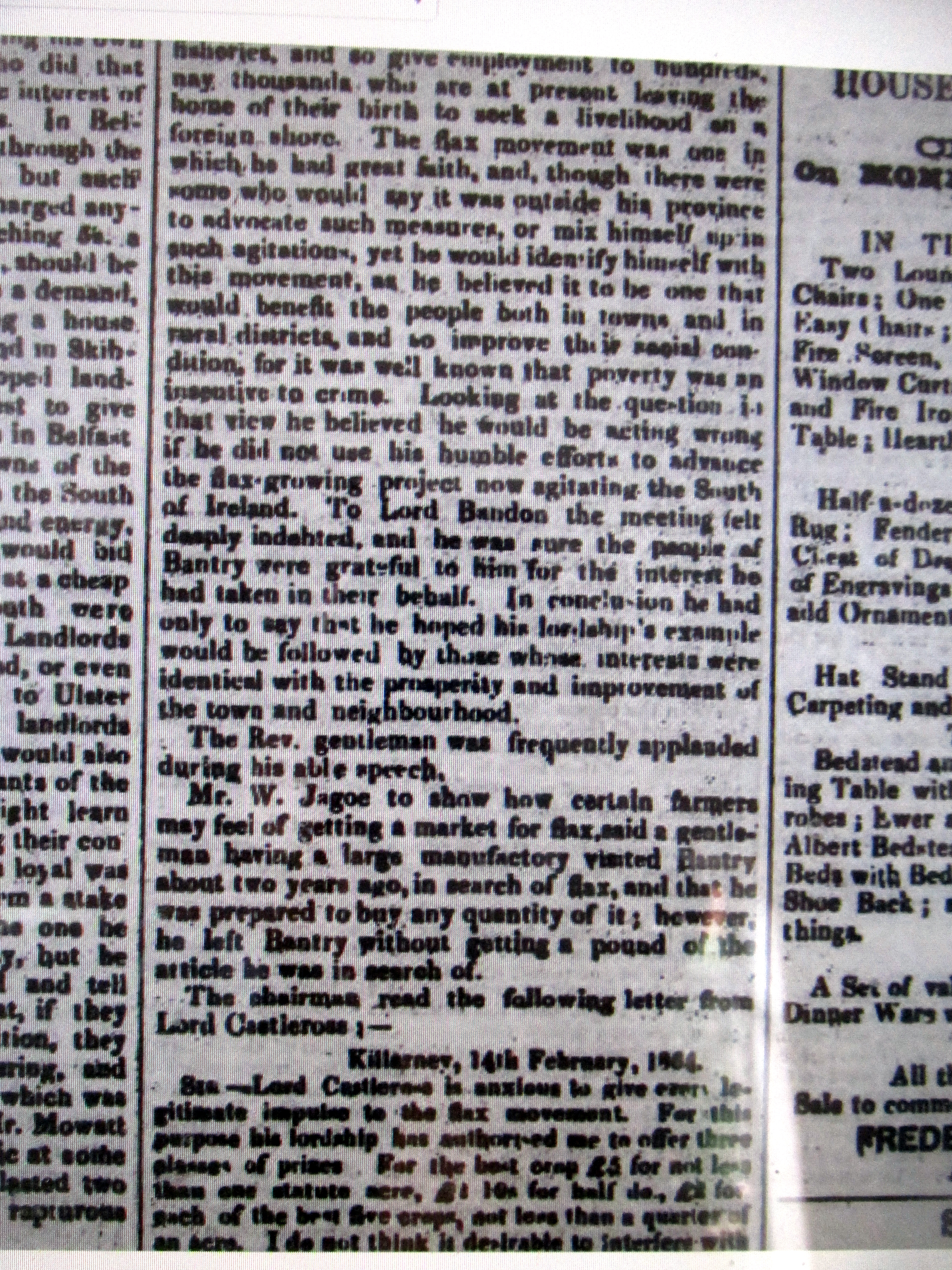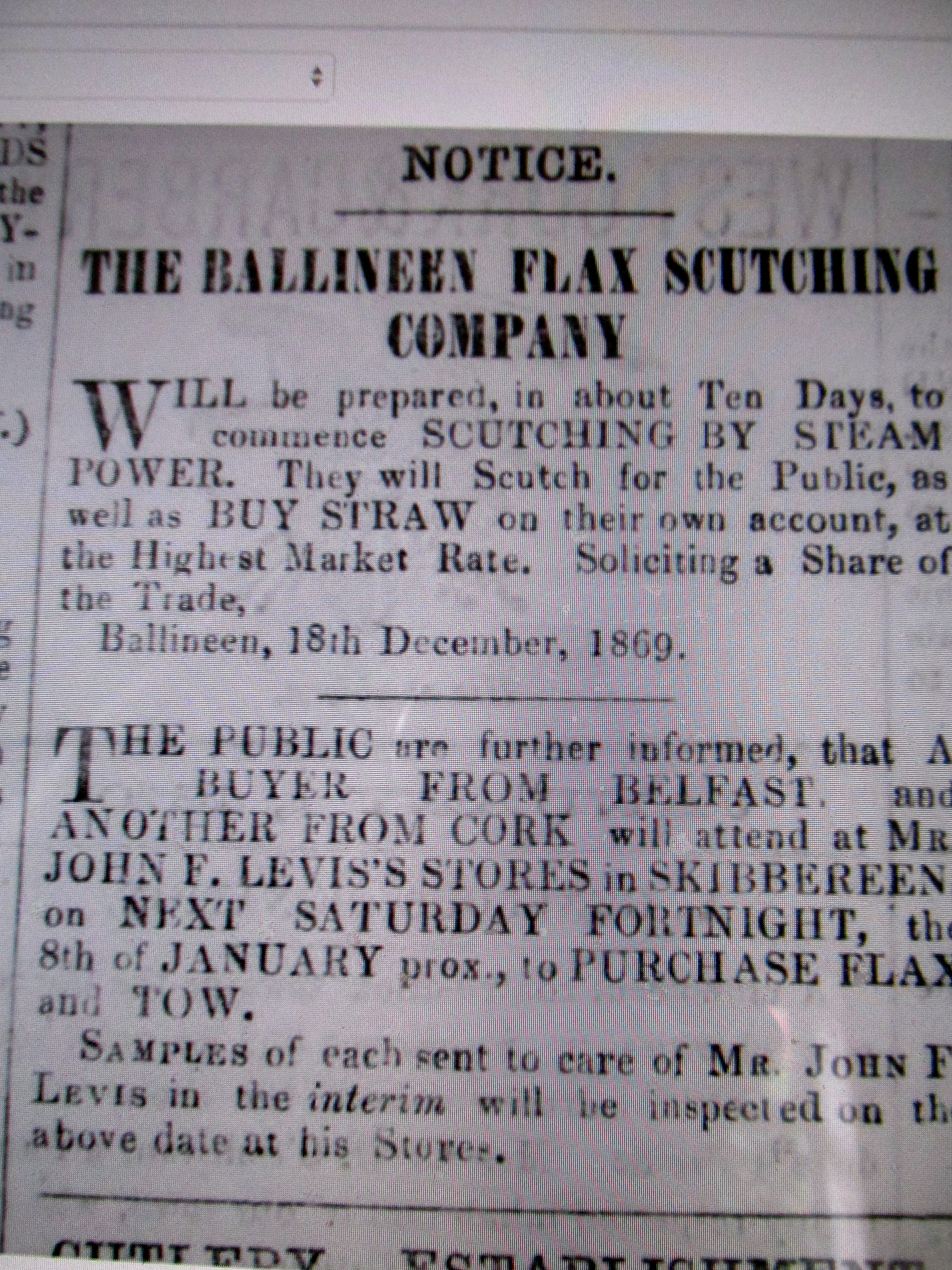Lord Bandon Addresses Flax Meetings at Carrigbui and Bantry, West Cork, 1864, Tisdall’s Mills at Donemark formerly used for Scutching, Cork Flax Spinning Company acquires Site, Skibbereen, Ballineen Mills Flax Scutching Limited Operational 1867, Belfast Buyers in Skibbereen.