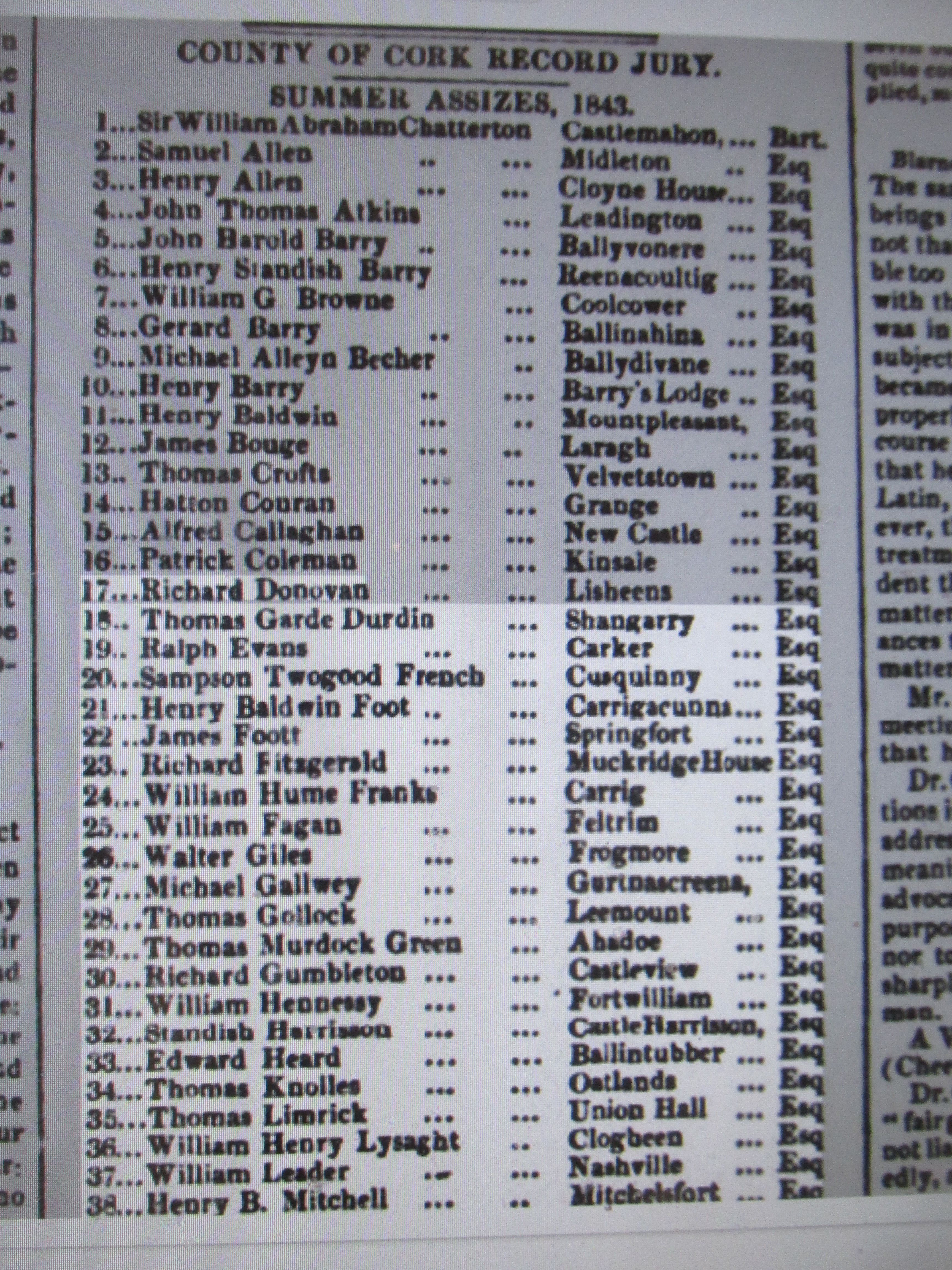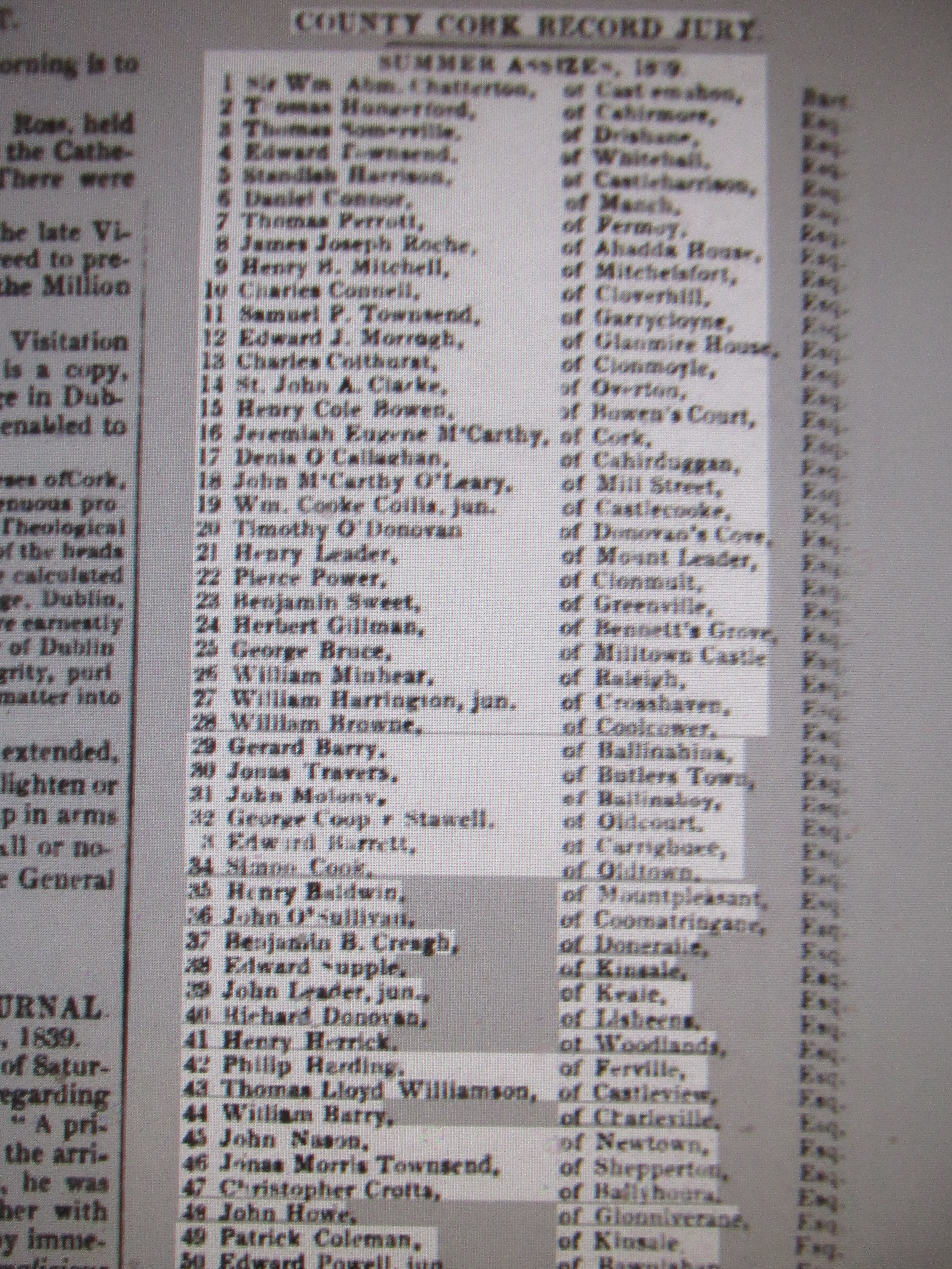 Sir William Abraham Chatterton, Castlemahon, Cork,Thomas Hungerford, Cahirmore, Clonakilty, Thomas Somerville, Drishane, Skibbereen, Edward Townsend, Whitehall, Skibbereen, Standish Harrison Castle Harrison, Charleville, Daniel Connor, Manch, Dunmanway, Thomas Perrott, Fermoy, James Joseph Roche, Aghada House, Midleton, Henry M. Mitchell, Mitchelsfort, Watergrasshill, Charles Connell, Cloverhill, Blackrock, Cork, Samuel P. Townsend, Garrycloyne, Watergrasshill, Edward J. Morrogh, Glanmire House, Charles Colthurst, Clonmoyle, Coachford, St. John A. Clarke, Overton, Bandon, Henry Cole Bowen, Bowen’s Court, Doneraile, Jeremiah Eugene McCarthy, Cork, Denis O’Callaghan, Cahirduggan, Midleton, John McCarthy O’Leary, Millstreet, William Cooke Collis Junior, Castlecook, KIlworth, Timothy O’Donovan, O’Donovan’s Cove, Durrus, Henry Leader, Mount Leader, Charleville, Pierce Power, Clonmult, Fermoy, herbert Gillman, Bennetts Grove, Clonakilty, Benjamin Sweet, Greenville, Bandon, George Bruce, Milltown Castle, Charleville, William MInhear, Raleigh, Macroom, William Harrington junior, Crosshaven, William Brown, Coolcower, Macroom, Jonas Travers, Butlers town, Gerard Barry, Ballinahina, Cork, John Molony, Ballinaboy, Ballinhassig, George Cooper Stawell, Oldcourt, Bandon, Edward Barrett, Carrigbuee, Macroom, Simon Cook, Oldtown, Henry Baldwin, Mount Pleasant, Bandon, John O’Sullivan, Coomatringane, Castletownbere, Benjamin B. Creagh, Doneraile, Edward Supple, Kinsale, John Leade, Junior, Keale, Millstreet, Richard Donovan, Lisheens, Henry Herrick Woodlands, Bandon, Philip Harding, Firville, Macroom, Thomas Lloyd Williamson, Castleview, Fermoy, William Barry, Charleville, John Nason Newtown, Fermoy, Jonas Morris Townsend, Shepperton, Skibbereen, Christopher Crofts, Ballyhoura, John Howe, Glanavirane, Kinsale, Patrick Coleman, KInsale, Edward Purcell Junior, Bawnishal?,
