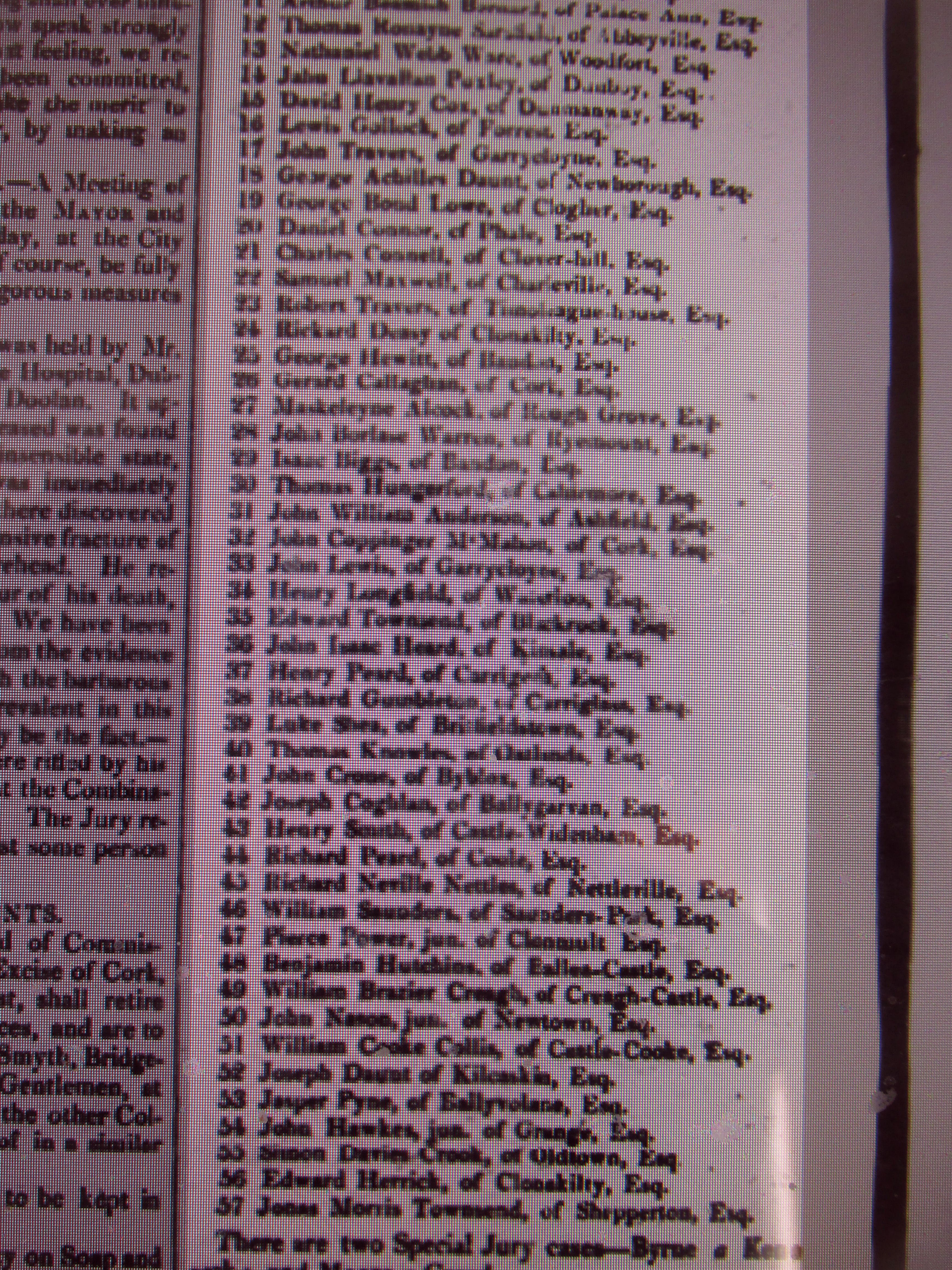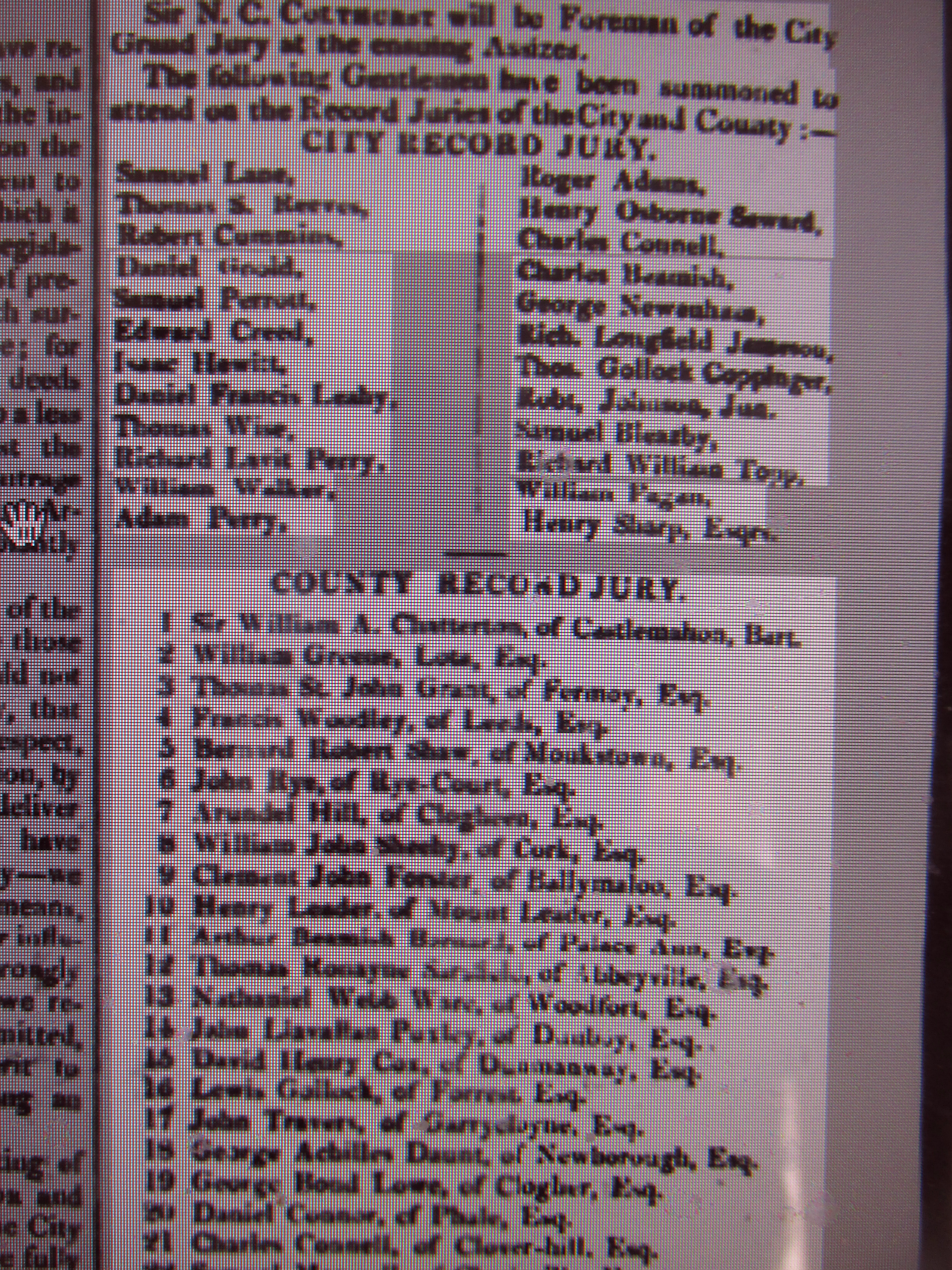 Cork City and County Grand July 1825. 11 Saturday Jul 2015 Posted by durrushistory in Uncategorized ≈ Leave a comment Cork City and County Grand July 1825. Names and Address Grand Juries, Co. Cork 1839 1839 County Cork Record Jury. Summer Assizes. Sir William Abraham Chatterton, Castlemahon, Cork,Thomas Hungerford, Cahirmore, Clonakilty, Thomas Somerville, Drishane, Skibbereen, Edward Townsend, Whitehall, Skibbereen, Standish Harrison Castle Harrison, Charleville, Daniel Connor, Manch, Dunmanway, Thomas Perrott, Fermoy, James Joseph Roche, Aghada House, Midleton, Henry M. Mitchell, Mitchelsfort, Watergrasshill, Charles Connell, Cloverhill, Blackrock, Cork, Samuel P. Townsend, Garrycloyne, Watergrasshill, Edward J. Morrogh, Glanmire House, Charles Colthurst, Clonmoyle, Coachford, St. John A. Clarke, Overton, Bandon, Henry Cole Bowen, Bowen’s Court, Doneraile, Jeremiah Eugene McCarthy, Cork, Denis O’Callaghan, Cahirduggan, Midleton, John McCarthy O’Leary, Millstreet, William Cooke Collis Junior, Castlecook, KIlworth, Timothy O’Donovan, O’Donovan’s Cove, Durrus, Henry Leader, Mount Leader, Charleville, Pierce Power, Clonmult, Fermoy, herbert Gillman, Bennetts Grove, Clonakilty, Benjamin Sweet, Greenville, Bandon, George Bruce, Milltown Castle, Charleville, William MInhear, Raleigh, Macroom, William Harrington junior, Crosshaven, William Brown, Coolcower, Macroom, Jonas Travers, Butlers town, Gerard Barry, Ballinahina, Cork, John Molony, Ballinaboy, Ballinhassig, George Cooper Stawell, Oldcourt, Bandon, Edward Barrett, Carrigbuee, Macroom, Simon Cook, Oldtown, Henry Baldwin, Mount Pleasant, Bandon, John O’Sullivan, Coomatringane, Castletownbere, Benjamin B. Creagh, Doneraile, Edward Supple, Kinsale, John Leade, Junior, Keale, Millstreet, Richard Donovan, Lisheens, Henry Herrick Woodlands, Bandon, Philip Harding, Firville, Macroom, Thomas Lloyd Williamson, Castleview, Fermoy, William Barry, Charleville, John Nason Newtown, Fermoy, Jonas Morris Townsend, Shepperton, Skibbereen, Christopher Crofts, Ballyhoura, John Howe, Glanavirane, Kinsale, Patrick Coleman, KInsale, Edward Purcell Junior, Bawnishal?, and 1840. Evidence of Richard White Esq., Bantry, that the Cork Grand Jury need to raise £90-100,000 to run County Cork in 1844. Share this: Click to share on X (Opens in new window) X More Click to share on Facebook (Opens in new window) Facebook Like Loading...