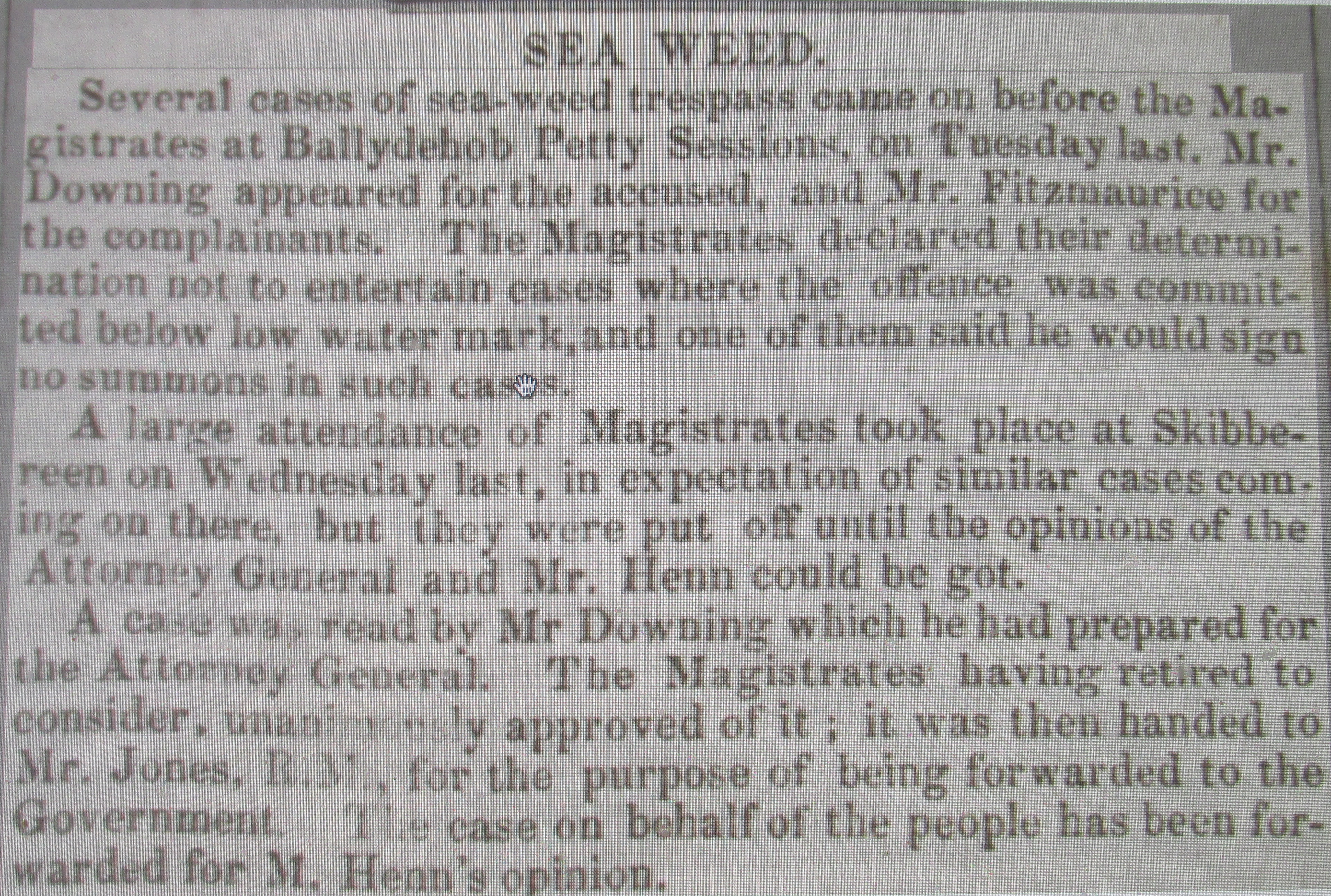 1843, Cases of Trespass for Seaweed Extraction, Ballydehob, Skibbereen, Co. Cork, Magistrates Declining Jurisdiction for Extraction below Low water mark.