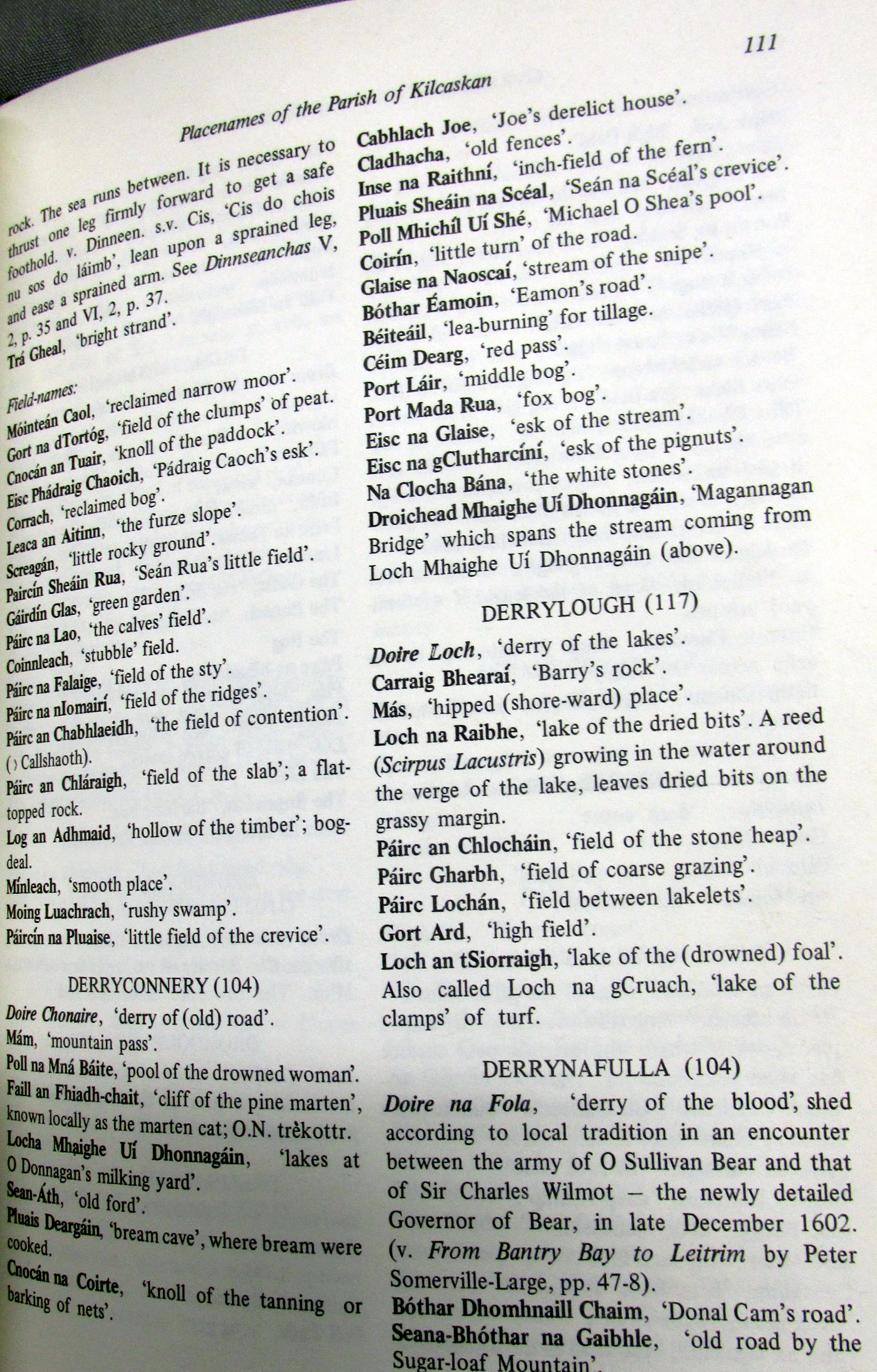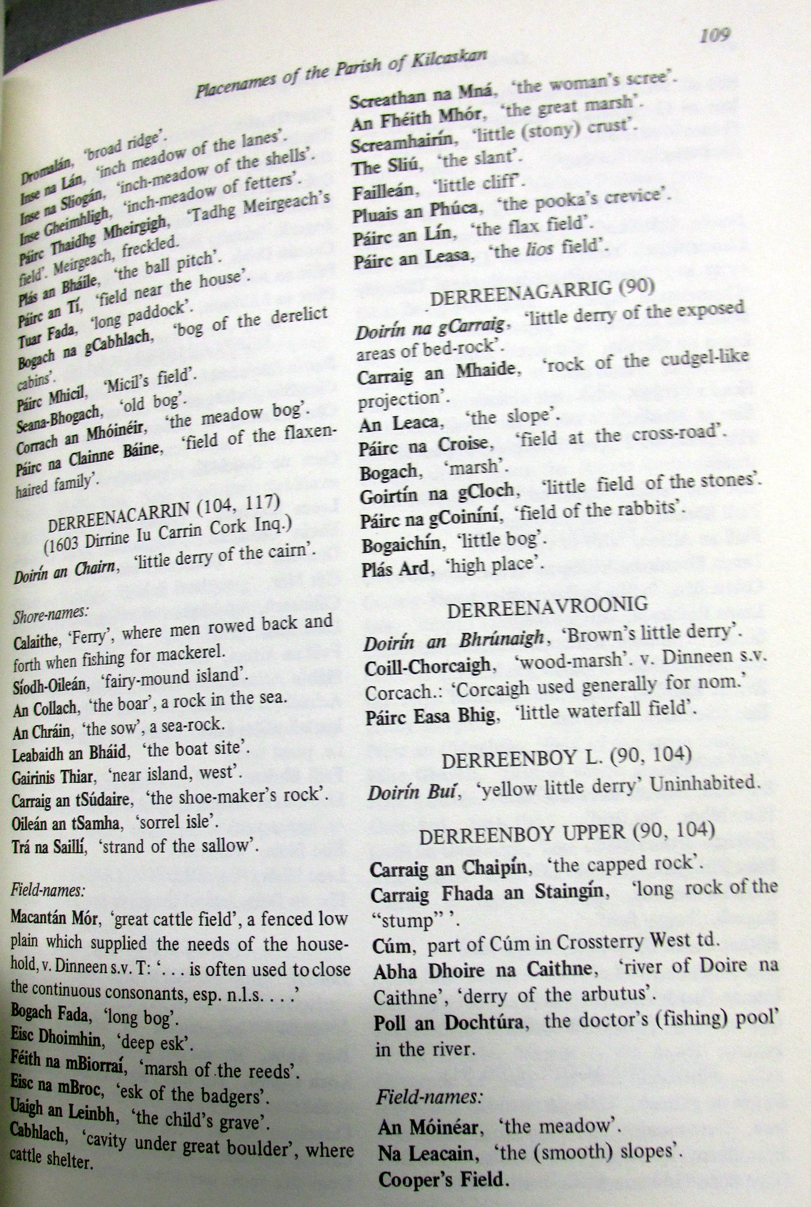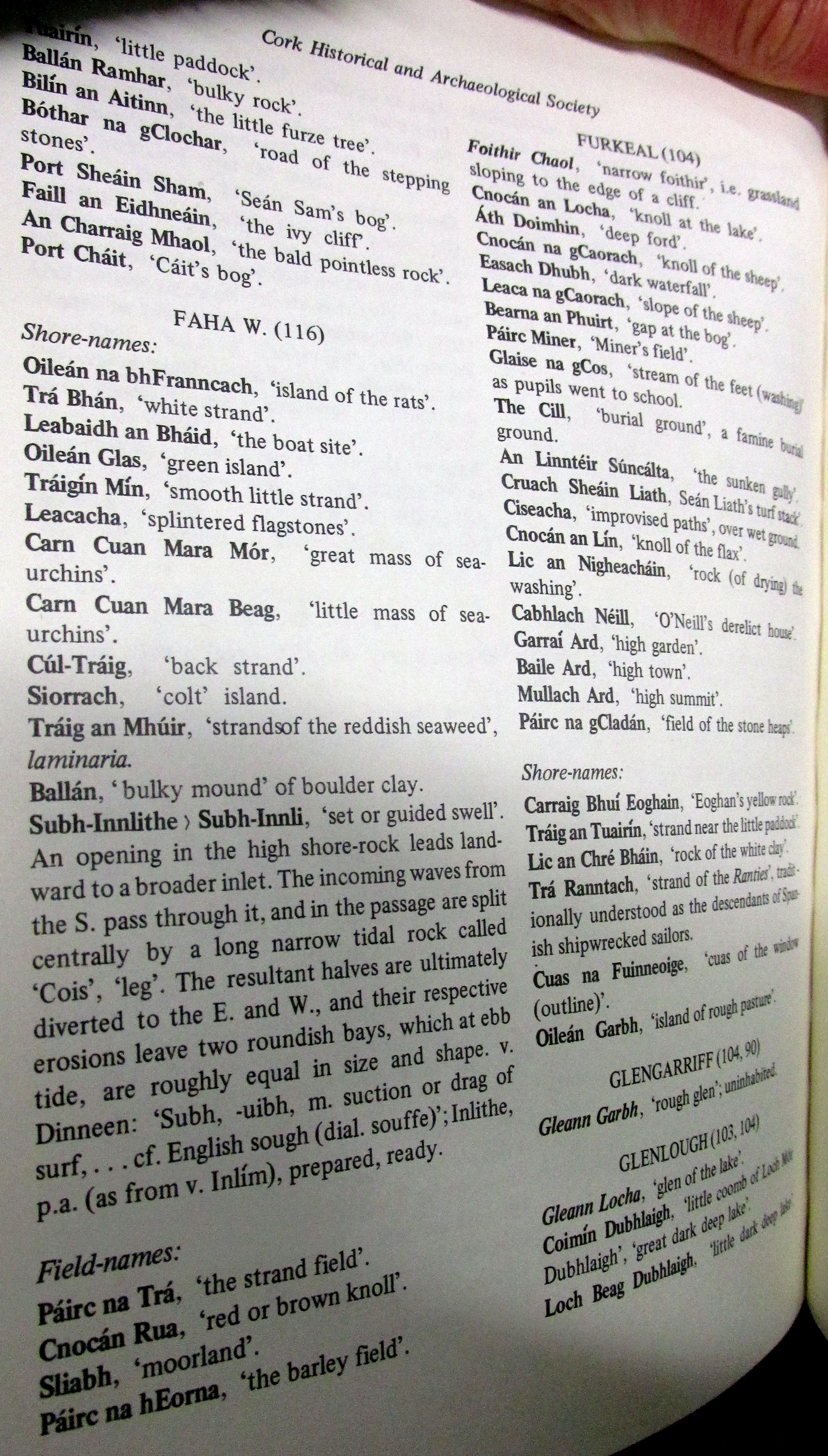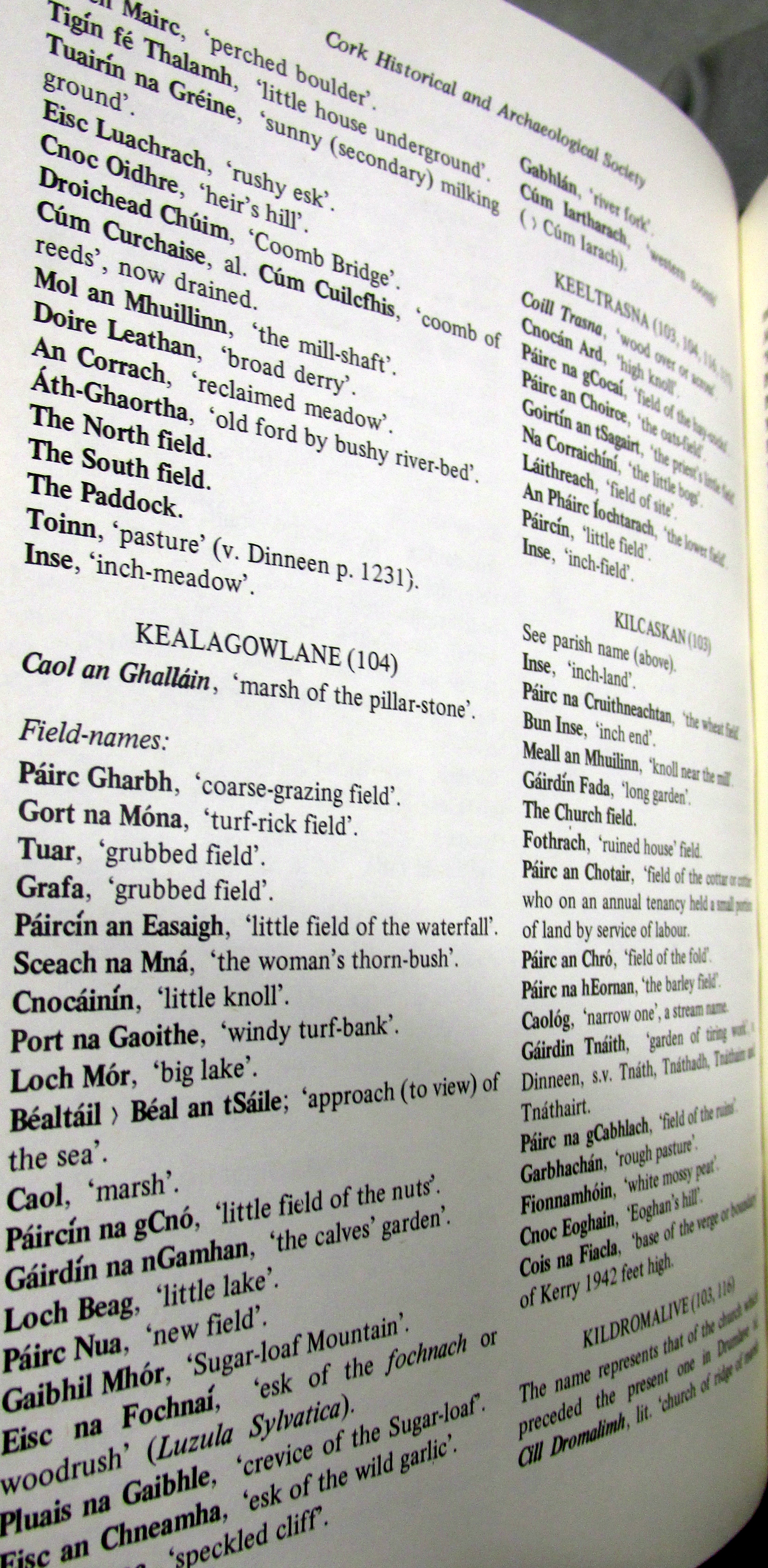 Townlands, Place and Field Names in English and Irish Kilcaskin (Cill Cháscann) Parish, Barony of Bere, West Cork.