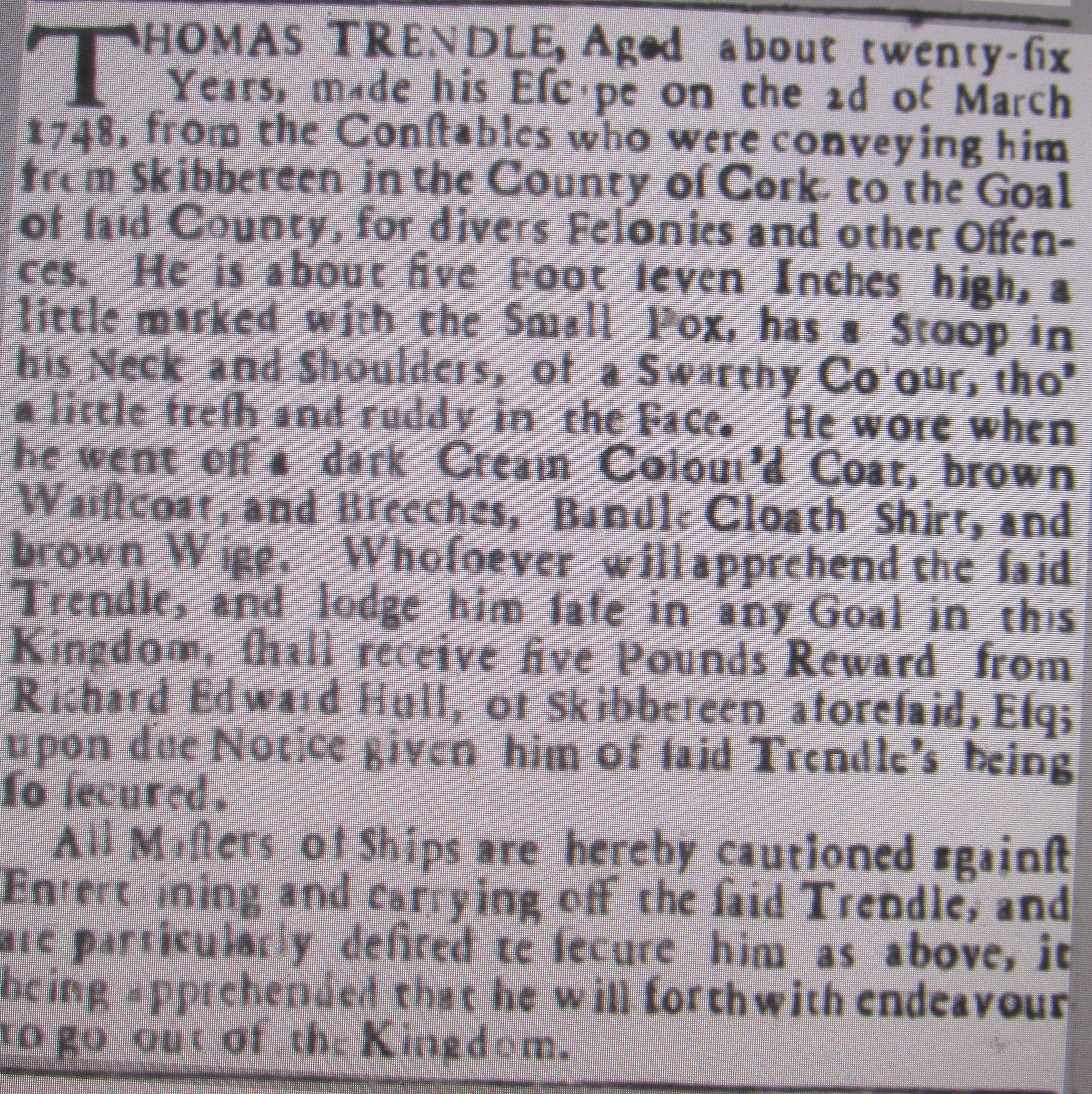 1748, Thomas Trendle (Trender?), Skibbereen escaped Convict en route to Cork Gaol, Marked with Small Pox, Wig, Description of Clothing, Reward £5 from William Hull, Skibbereen, Ship Masters Notified.