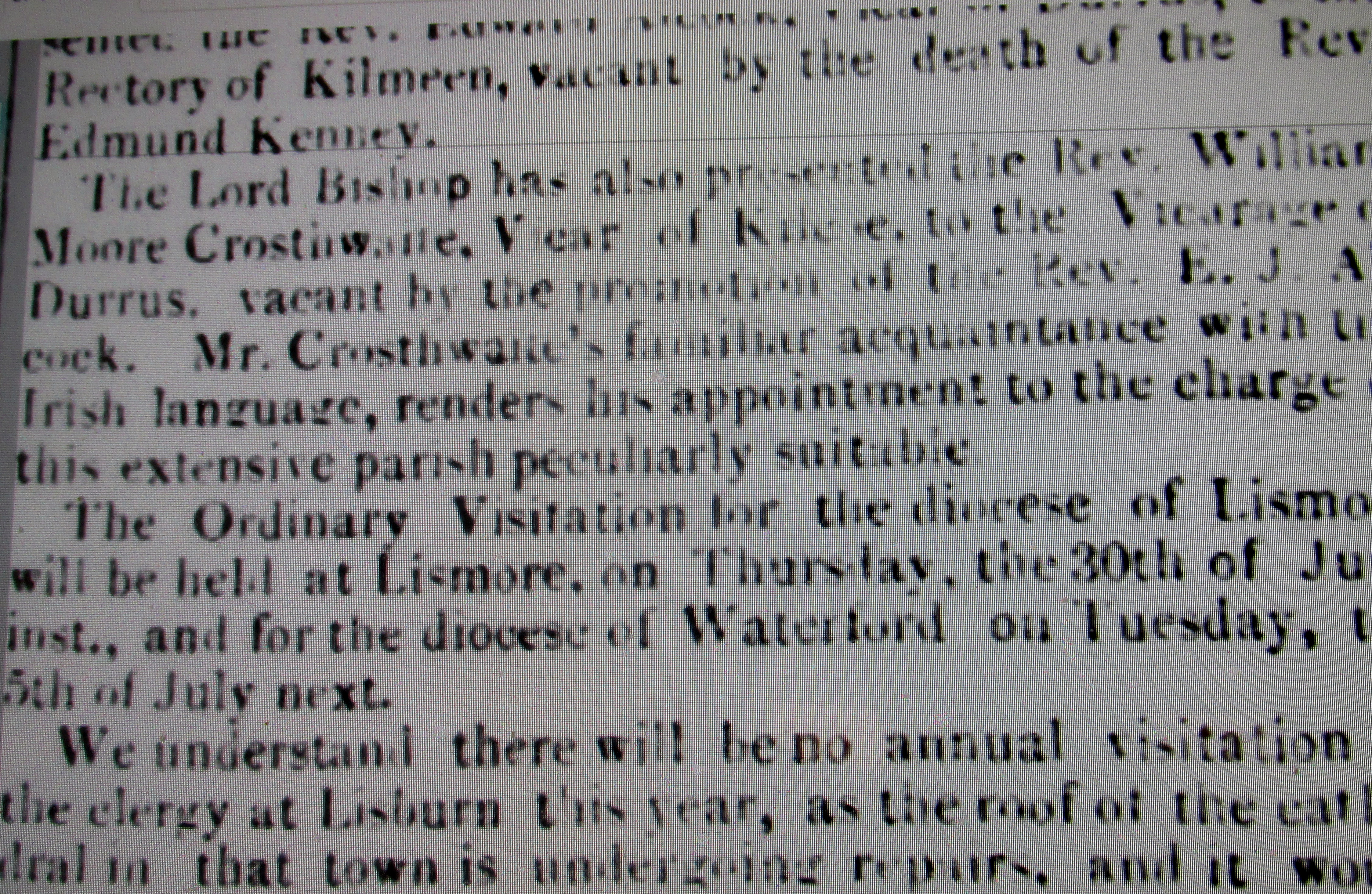 1845 Appointment of Rev. William Moore Crosthwaite, Vicar of Kilcoe, to Vicarage of Durrus, His familiarity With The Irish Language Renders This Appointment To this Extensive parish Peculiarly Sensible.