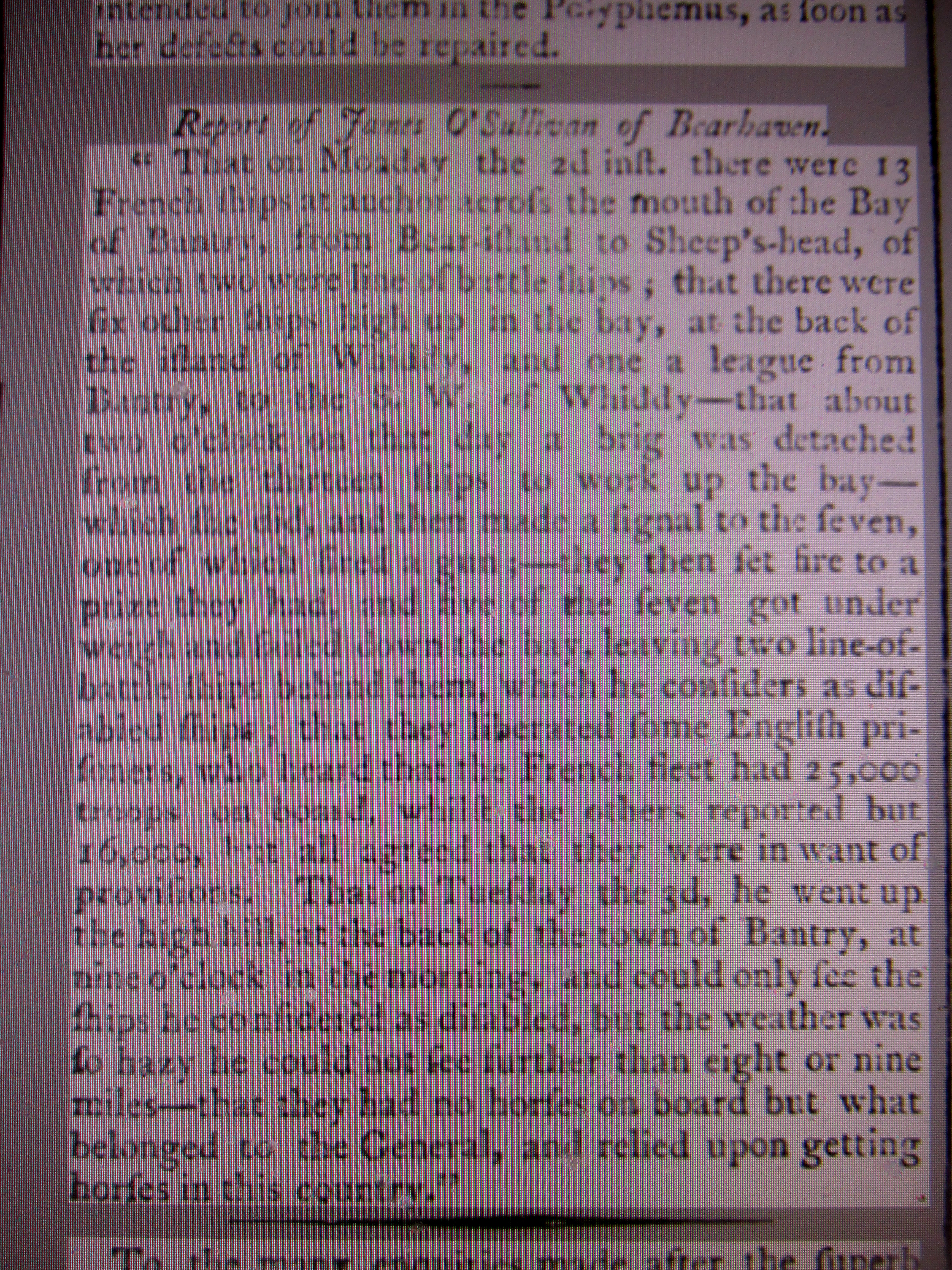Report of James O’Sullivan, Berehaven on French Invasion, Bantry Bay, 2nd January 1797.
