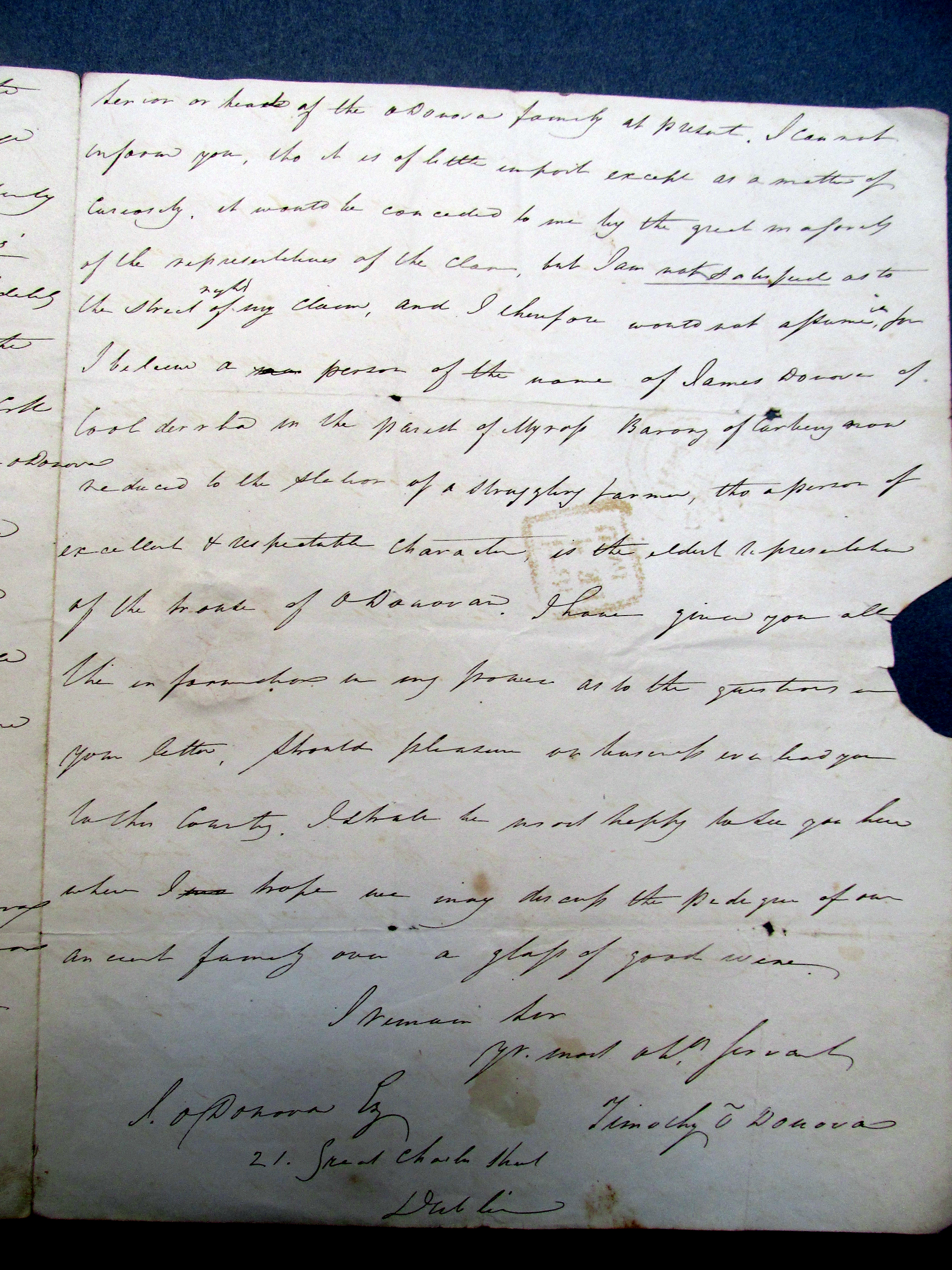 With respect of the information as to who is the Senior or head of the O’Donovan family at present, I cannot inform you. It is of little import as a matter of courtesy it would be conceded to me by the great majority of of the representative of the Clan but I am not satisfied as to the strict right of my claim, and therefore I would not assume it.