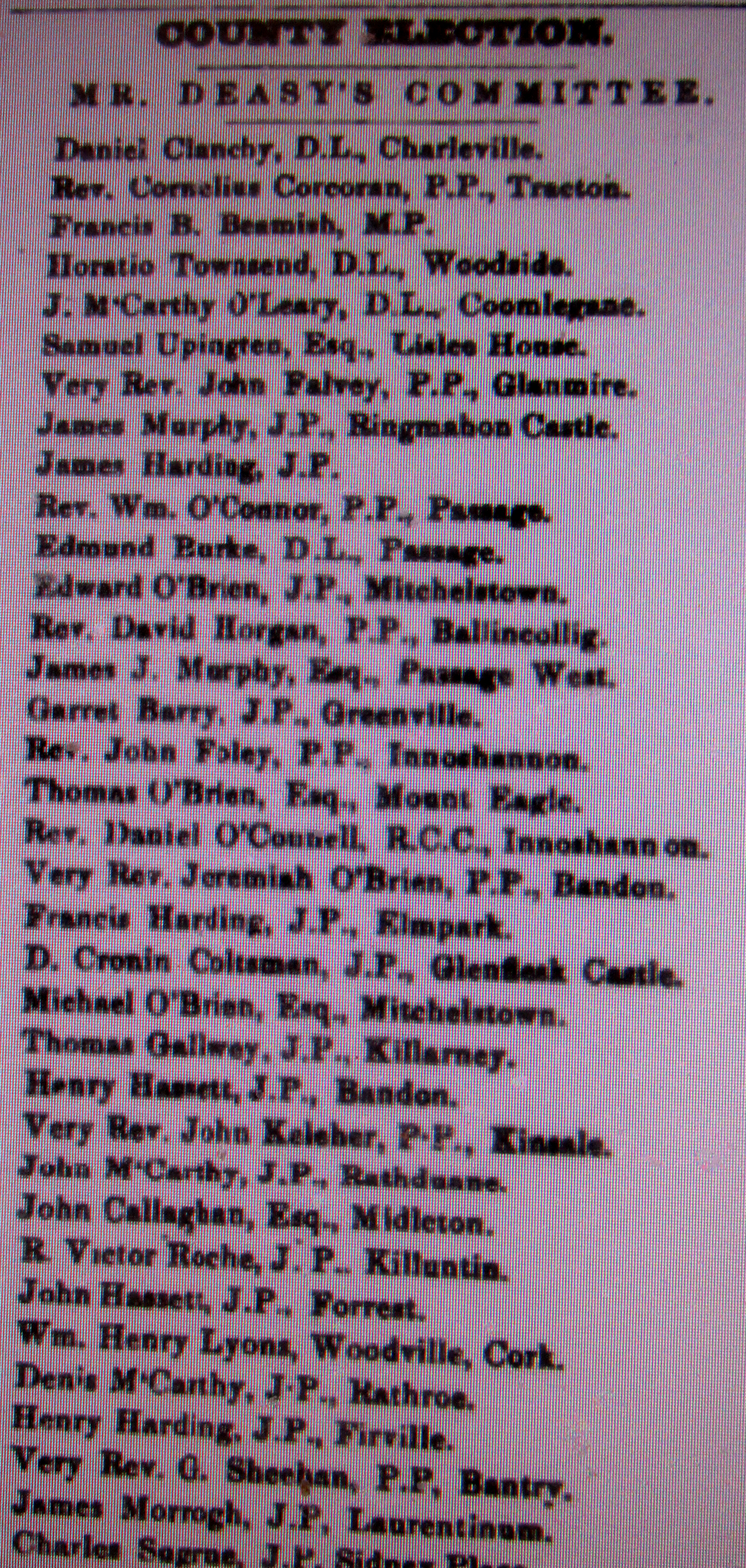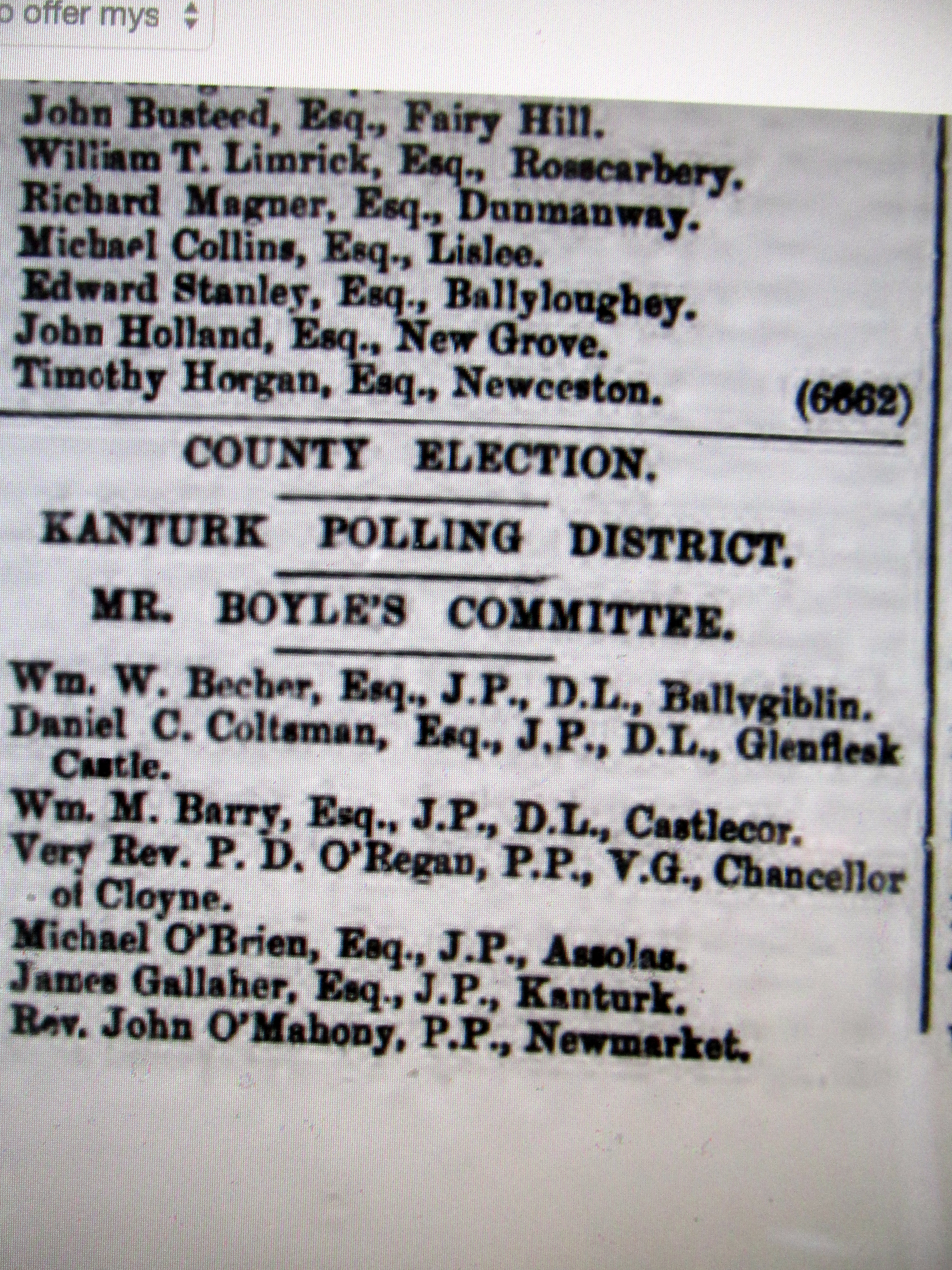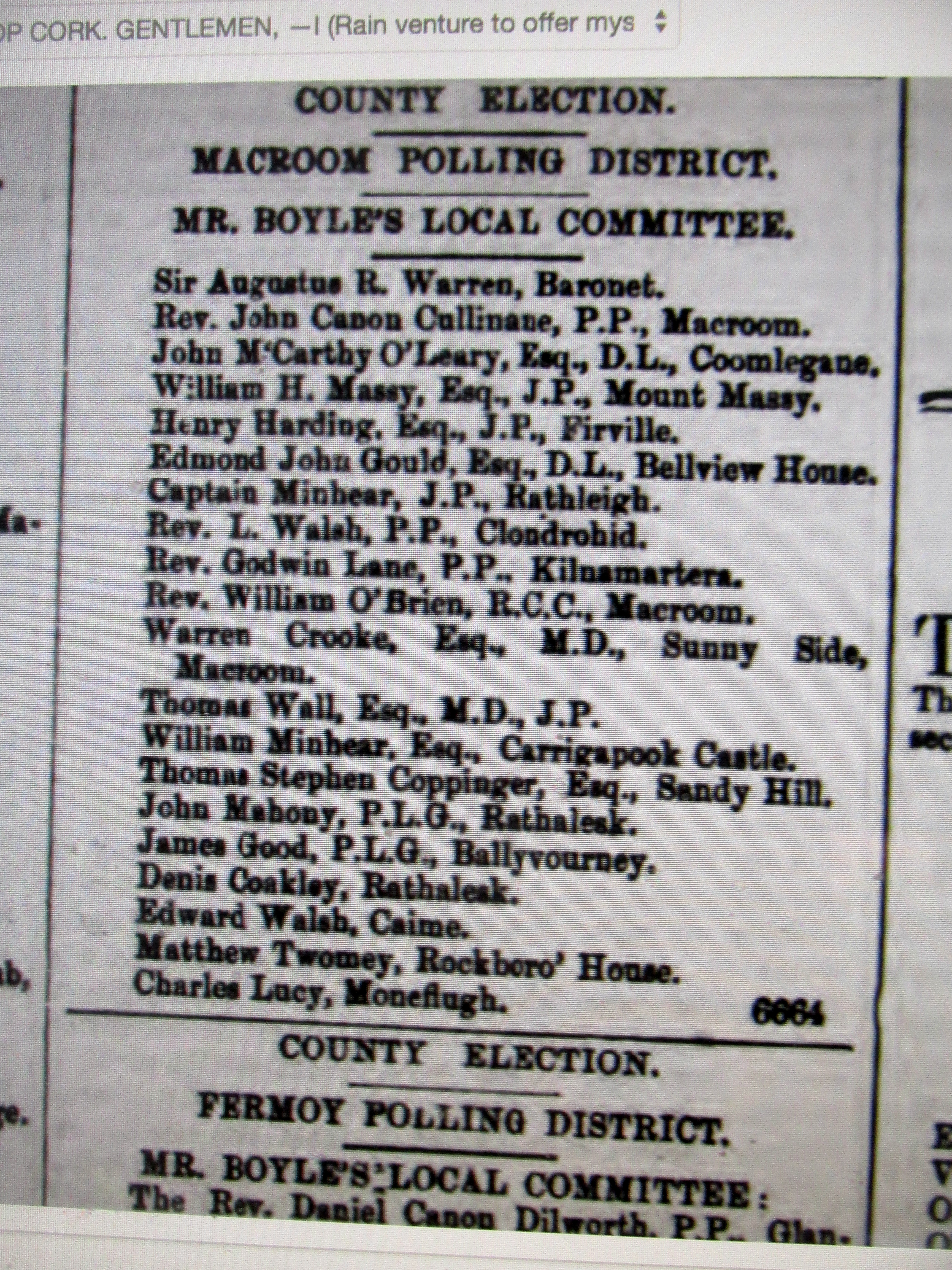 Elections Co. Cork to Imperial Westminister Parliament, London, with Committee Names and Addresses Alexander McCarthy 1857, Rickard Deasy, Queens Counsel 1857, Colonel Roche 1861, McCarthy Downing 1868, Boyle 1858.