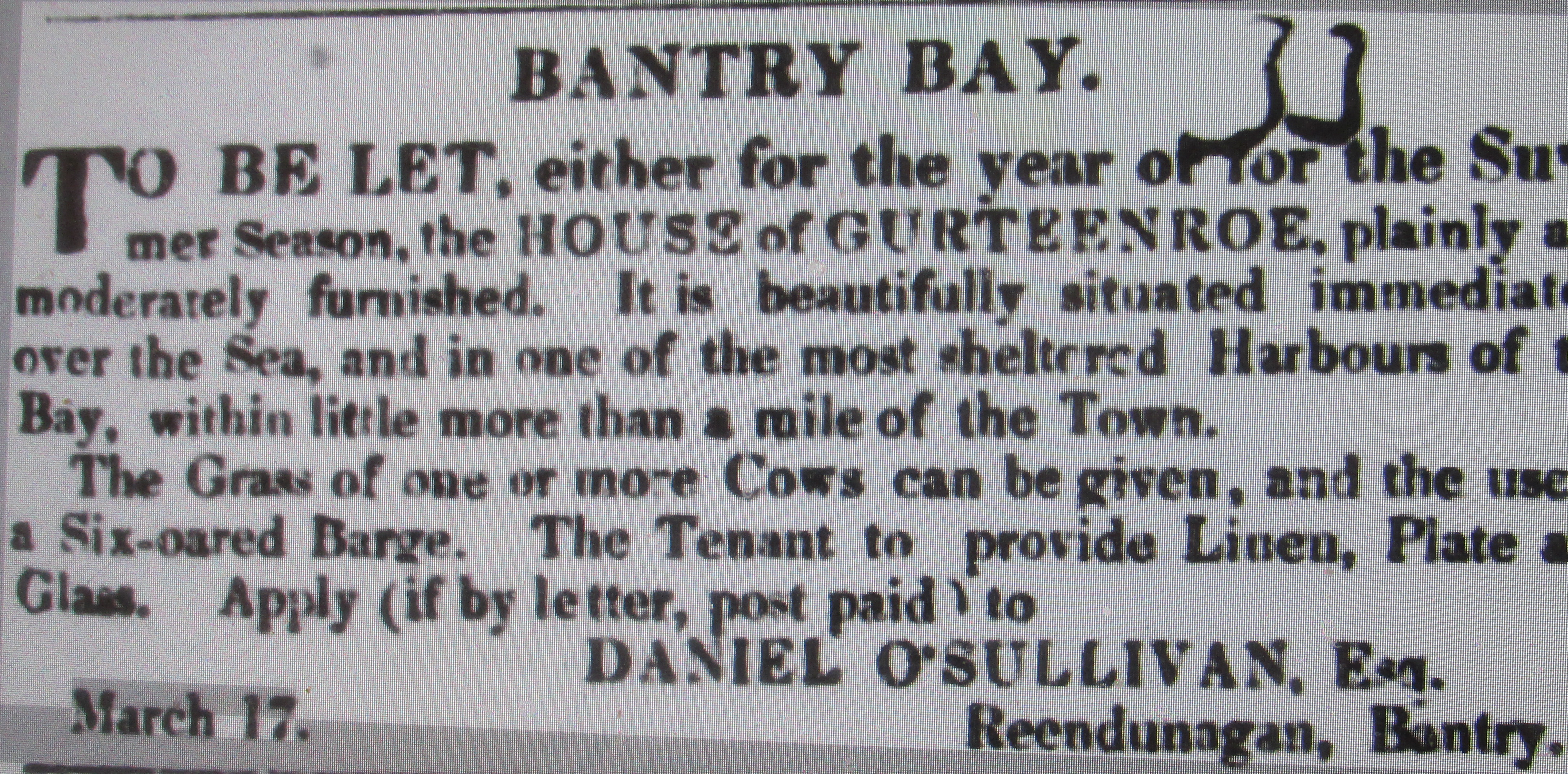 17th March 1836, To Be Let by Daniel O’Sullivan Esq., Reendungan, For the Year or Summer Season, HOUSE OF GURTEENROE, Grass of One Cow or More can be Given and the use of a Six-oar Barge. The barge sounds like a sand boat.