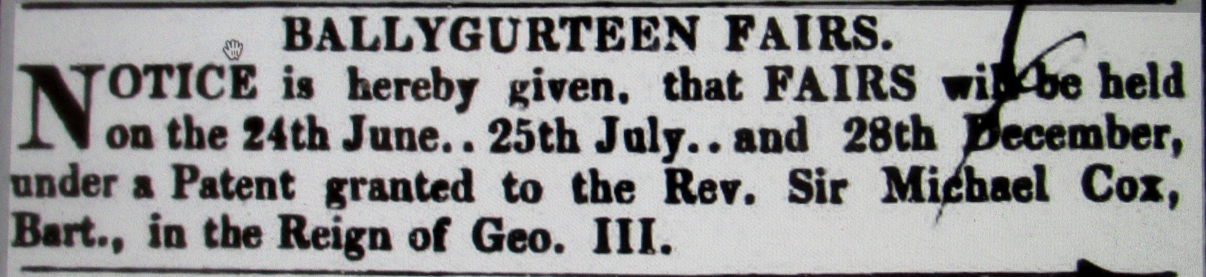 1840, Ballygurteen (Dunmanway/Clonakilty), West Cork, fairs 24th June, 25th July, 28th December, under a patent Granted to the Reverend Sir Michael Cox, Bart in the Reign of George 111 (1738-1820).