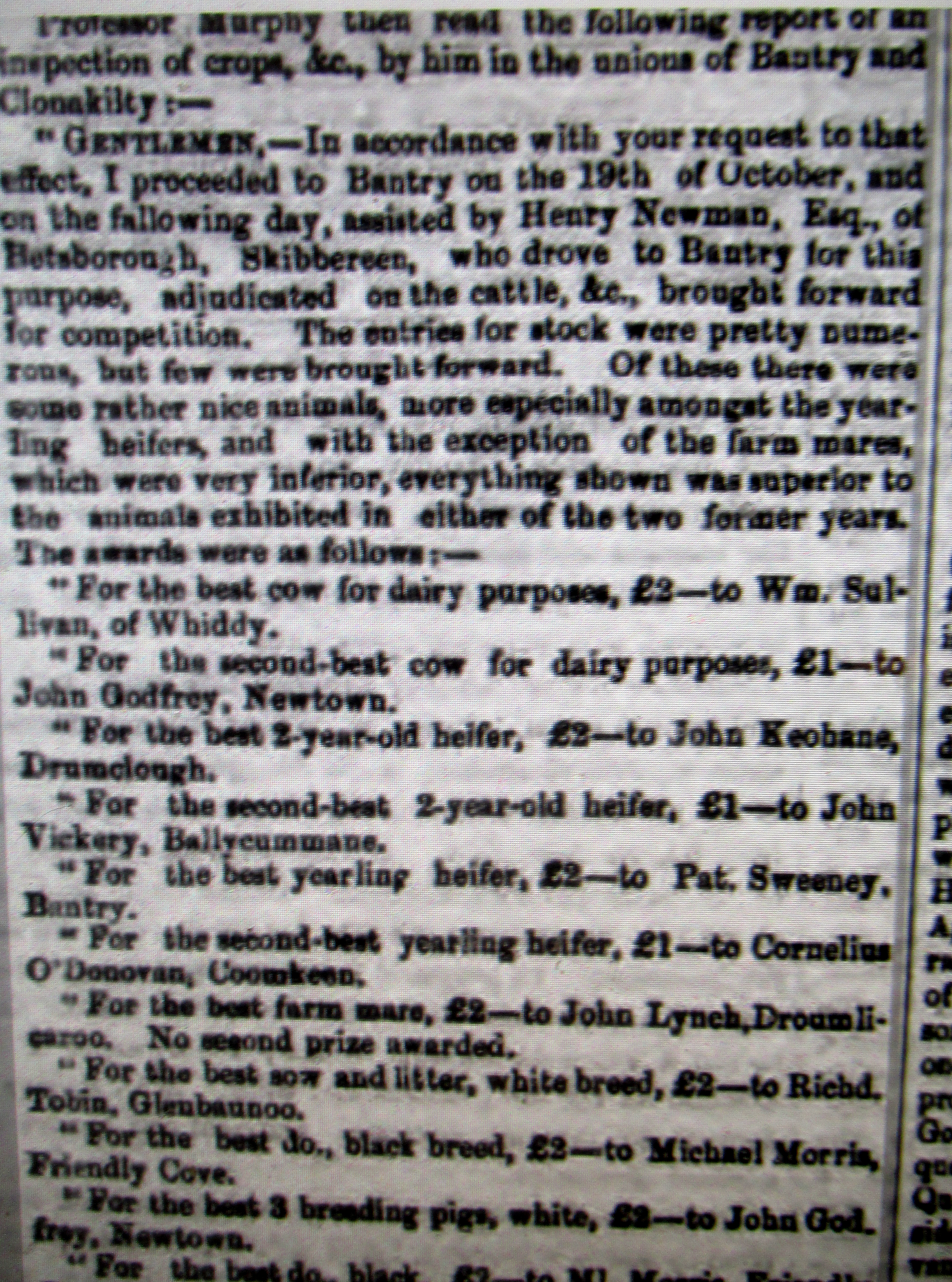 Agricultural Prizes, 19th October 1863, Bantry, West Cork, William Sullivan, John Tobin, Whiddy Island, Cornelius O’Donovan, John Godfrey, Newtown, John Vickery, Ballycomane, Pat Sweeney, Bantry, Cornelius O’Donovan, Coomkeen, John Lynch, Richard Tobin, Droumlicaroo, Michael Morris, Friendly Cove, John Keohane, Dromclough.