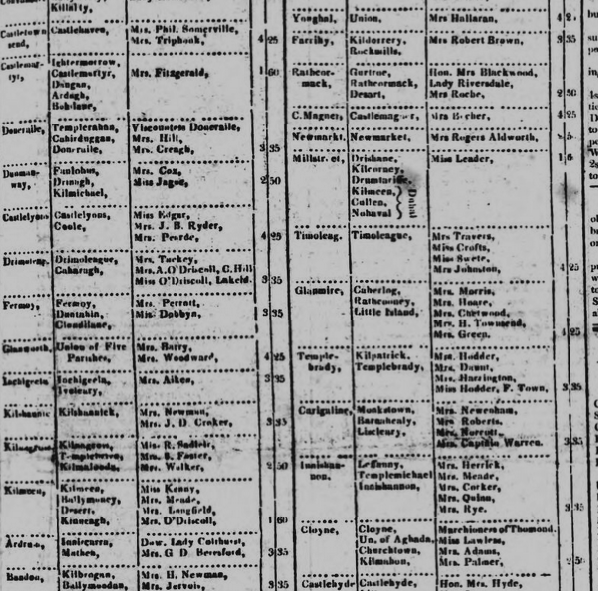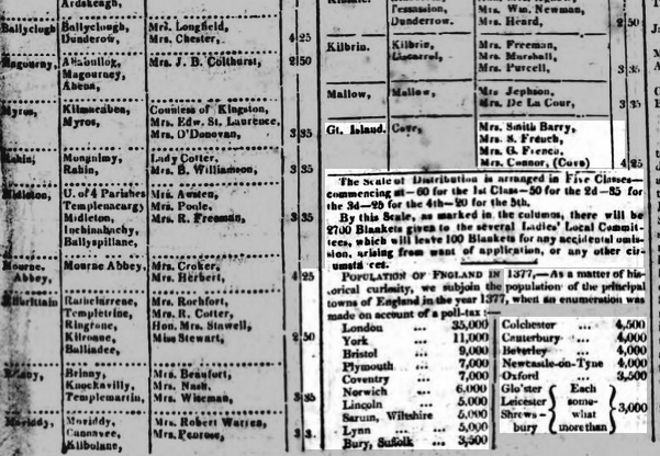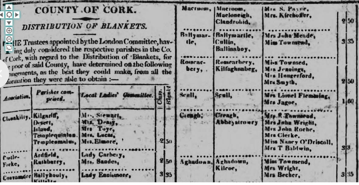 January 1823, Distribution of Blankets for the Poor of Co. Cork, by Ladies Parish Committees, Provided by London Society. 07 Monday Sep 2015 Posted by durrushistory in Uncategorized ≈ Leave a comment January 1823, Distribution of Blankets for the Poor of Co. Cork, by Ladies Parish Committees Provided by London Society. The ladies seem to be predominately the wives or sisters daughters of Landlords mostly Protestant but not exclusively. Share this: Click to share on X (Opens in new window) X More Click to share on Facebook (Opens in new window) Facebook Like Loading...