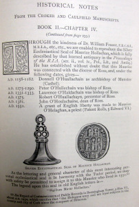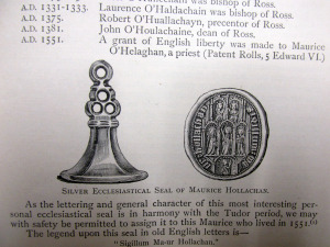 1450 AD Report of the Commissioner of Public Records in Bermingham Tower (Dublin Castle) ‘The Holegans were and are Loyal Subjects of the County and City of Cork since the Conquest of Hibernia and Ecclesiastical Seal of Father Maurice O’Helaghan of Ross, Co. Cork 1551.
