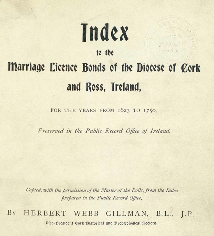 Marriage License Bonds of 1679 and 1698 from Dioceses of Cork, Ross and Cloyne Mid 18th Century Marriage Litigation Arising from marriage of two Protestants: White (of Bantry) and Miss Dillon (Bantry) Married by Popish Priest.