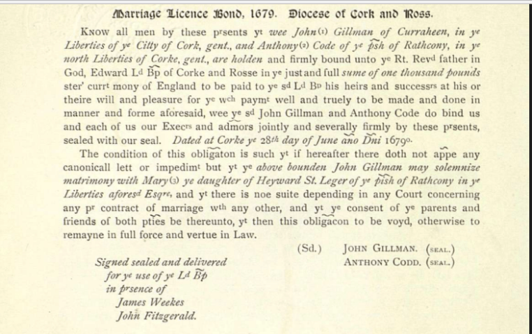 Marriage License Bonds of 1679 and 1698 from Dioceses of Cork, Ross and Cloyne Mid 18th Century Marriage Litigation Arising from marriage of two Protestants: White (of Bantry) and Miss Dillon (Bantry) Married by Popish Priest.