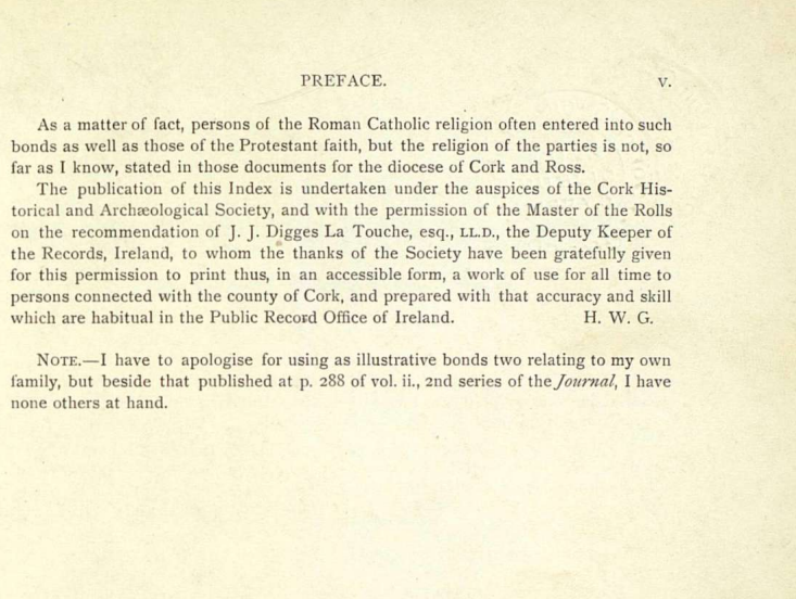 Marriage License Bonds of 1679 and 1698 from Dioceses of Cork, Ross and Cloyne Mid 18th Century Marriage Litigation Arising from marriage of two Protestants: White (of Bantry) and Miss Dillon (Bantry) Married by Popish Priest.