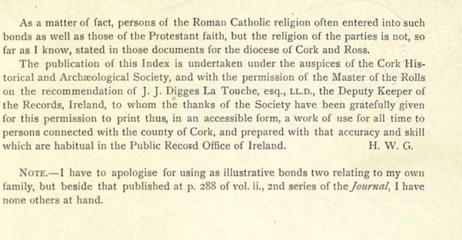 Marriage License Bonds of 1679 and 1698 from Dioceses of Cork, Ross and Cloyne Mid 18th Century Marriage Litigation Arising from marriage of two Protestants: White (of Bantry) and Miss Dillon (Bantry) Married by Popish Priest.
