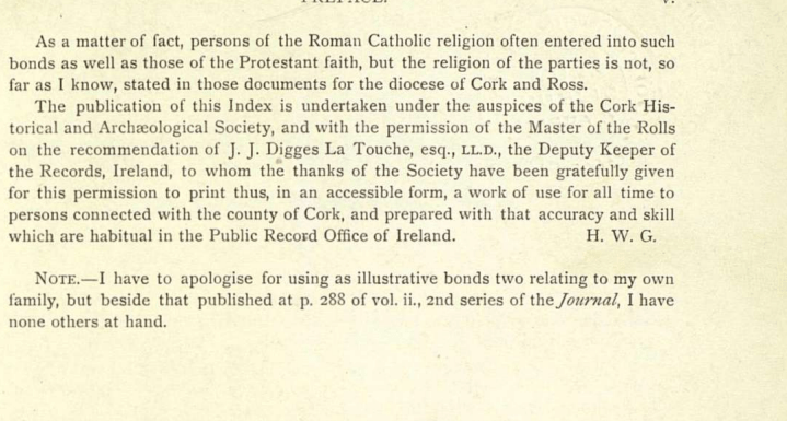 Marriage License Bonds of 1679 and 1698 from Dioceses of Cork, Ross and Cloyne Mid 18th Century Marriage Litigation Arising from marriage of two Protestants: White (of Bantry) and Miss Dillon (Bantry) Married by Popish Priest.