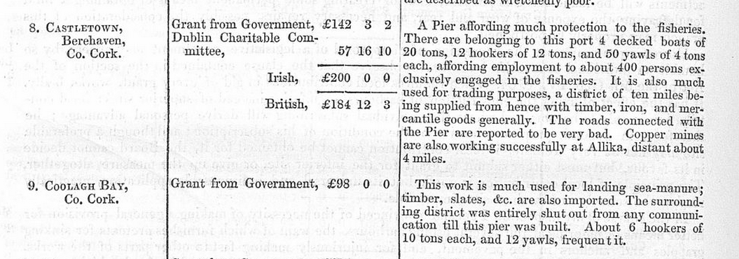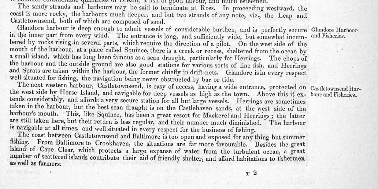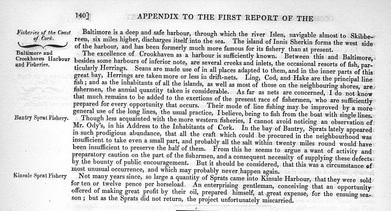 1812, Observation on State of Cork Coastal Fishery, Rev. Horace Townsend, 1836 Comments of Rev. O’Sullivan, Bantry, Report on Piers at Clonakilty, Courtmacsherry, Glandore, Cape Clear Island, Berehaven Laurence Cove Bere Island (Wretchedly Poor), Coolagh, Co. Cork, 1836.