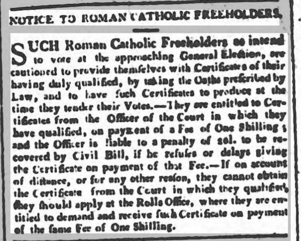 1806, Irish Roman Catholic Freeholders Entitled to Vote on Court Registration and payment of Fee 16 Friday Oct 2015 Posted by durrushistory in Uncategorized ≈ Leave a comment 1806, Irish Roman Catholic Freeholders Entitled to Vote on Court Registration and payment of Fee. It may be that all freeholders had to register as the franchise was very restricted. Share this: Share on X (Opens in new window) X More Share on Facebook (Opens in new window) Facebook Like Loading...