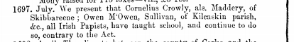 Cork Grand Jury Presentments, July 1697 ‘That Cornelius Crowley otherwise Maddery of Skibbereen, Owen McOwen, Sullivan of Kilcaskin, all Irish Papists, Have taught School and Continue to do so Contrary to Act.