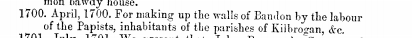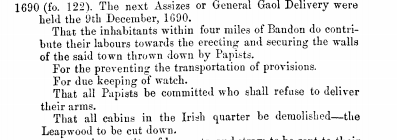 1690, That Inhabitants Within 4 Miles of Bandon Contribute Their labour Towards Reinstating Walls of Town, Thrown Down By Papist be Re-Instated and the Cabins in The Irish Quarter Be Thrown Down and 1700 The papist of Kilbrogan Repair Walls.
